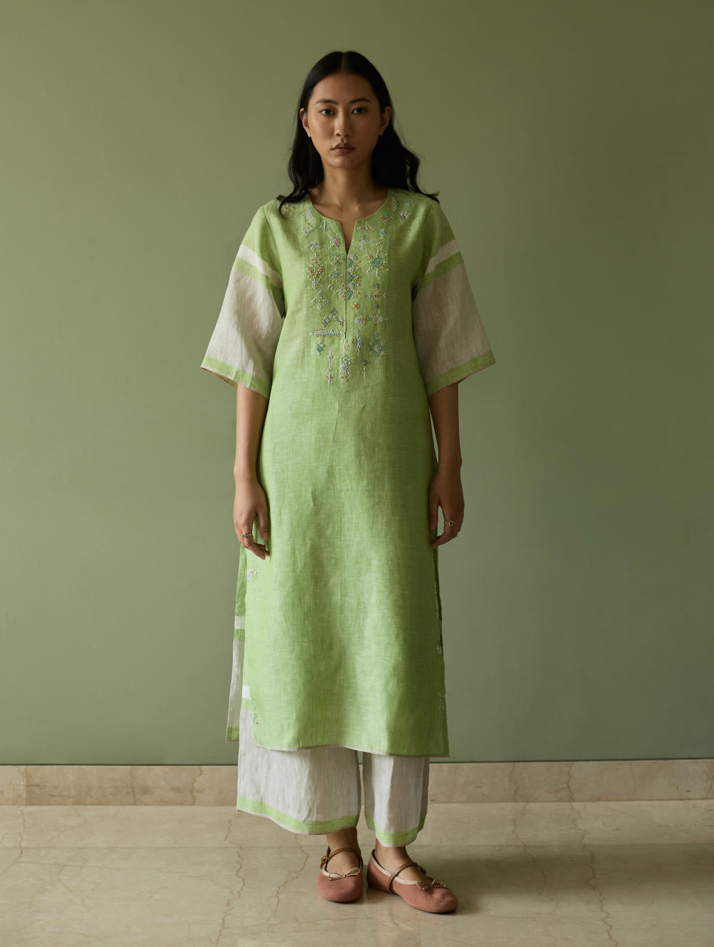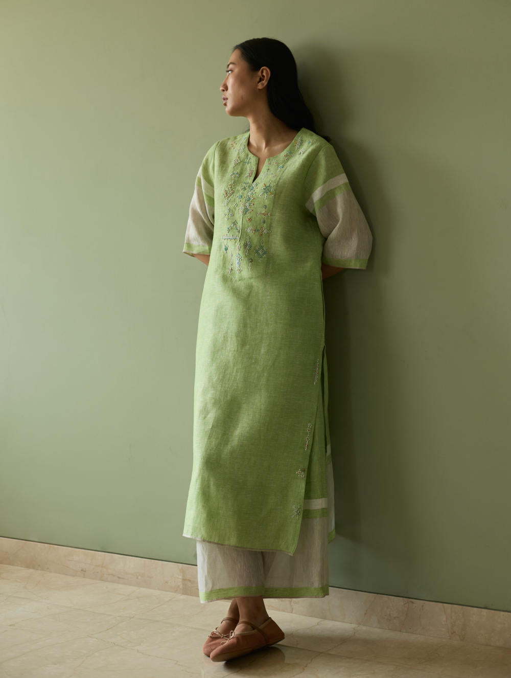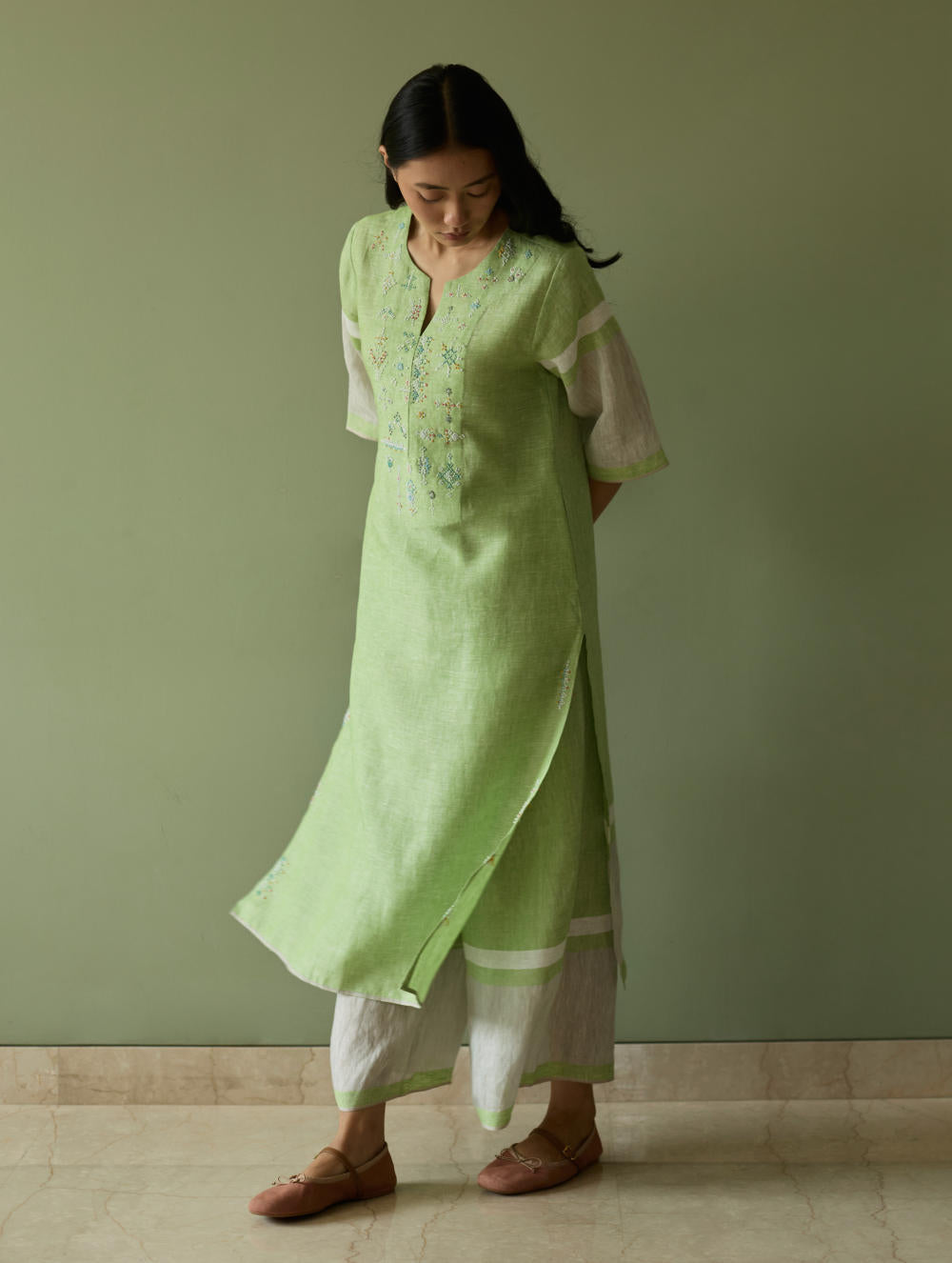A signature Manan kurta crafted from our soft handwoven metallic border linen with a soft grey selvedge. Hand-embroidered with intricate motifs, along the neckline and side slits, inspired by the timeless age-old Tangalia weave. The hand-embroidery is brought to life through meticulous multi-coloured french knots in threads and fine beadwork, creating a subtle pattern of texture and colour. Wear Vira with our flared pants for a statement, yet comfortable look.
