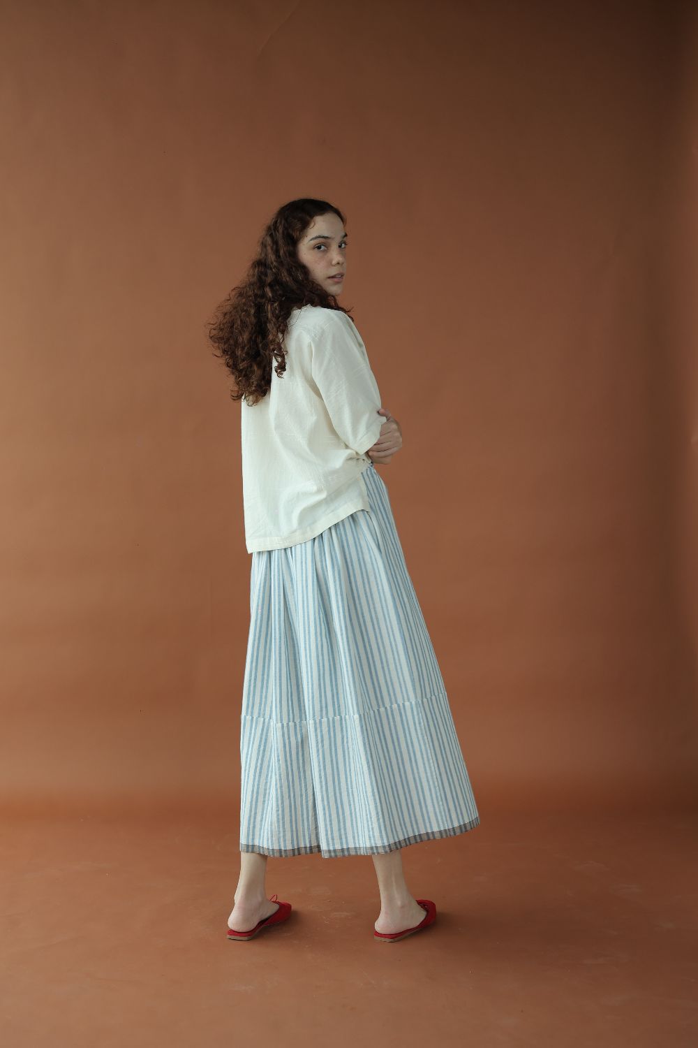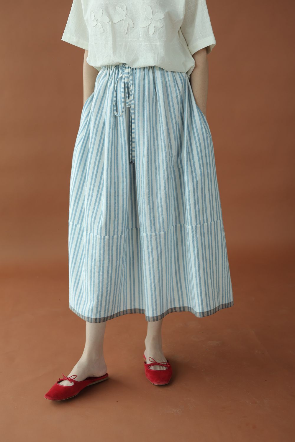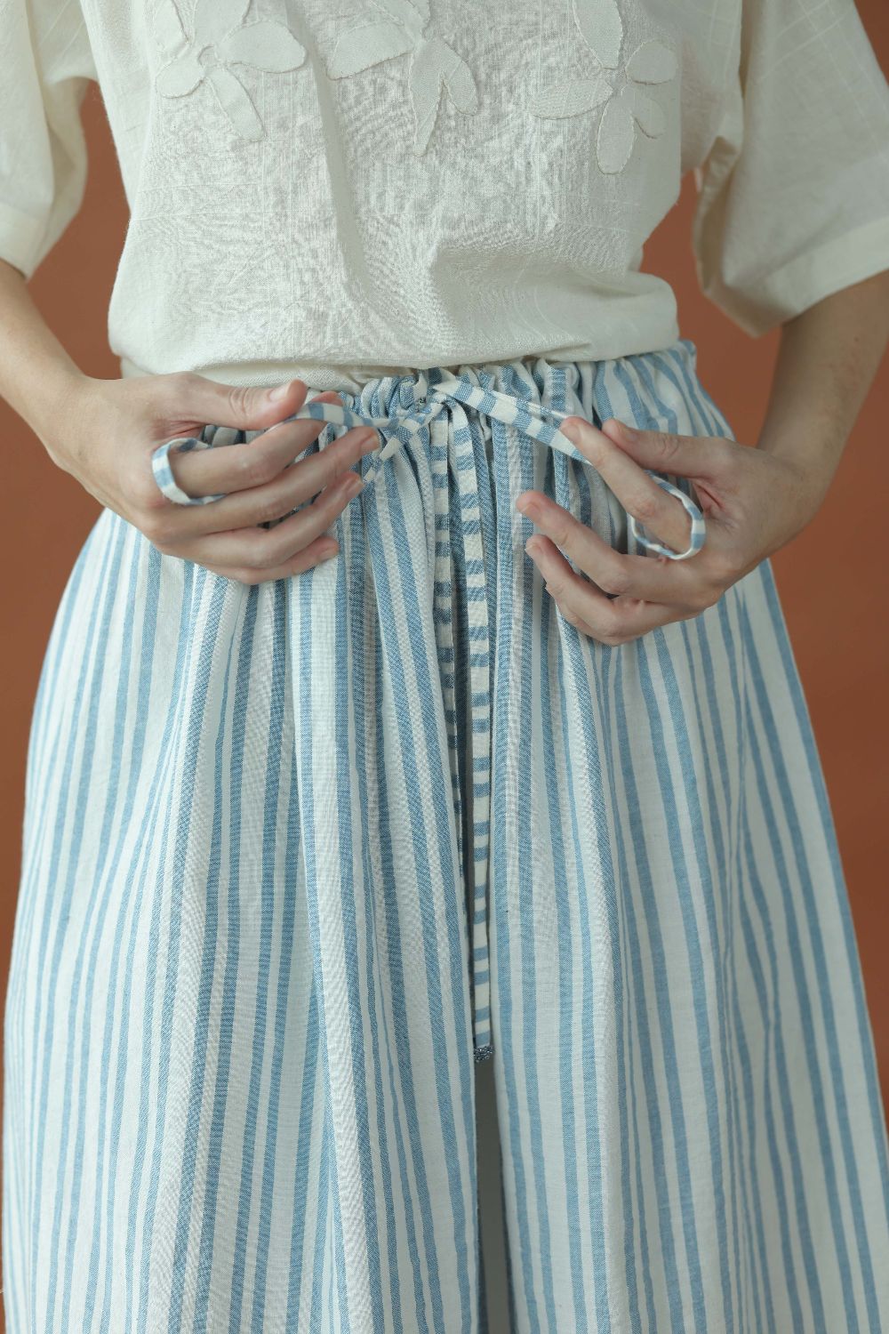 Delphi' - Handwoven suummer blue stripes turned into a free-size skirt, with a drawstring that runs along the waist to fasten to your size.