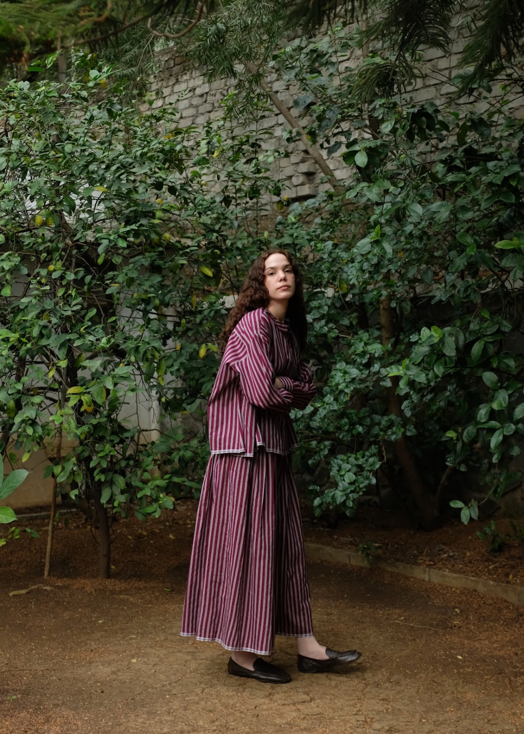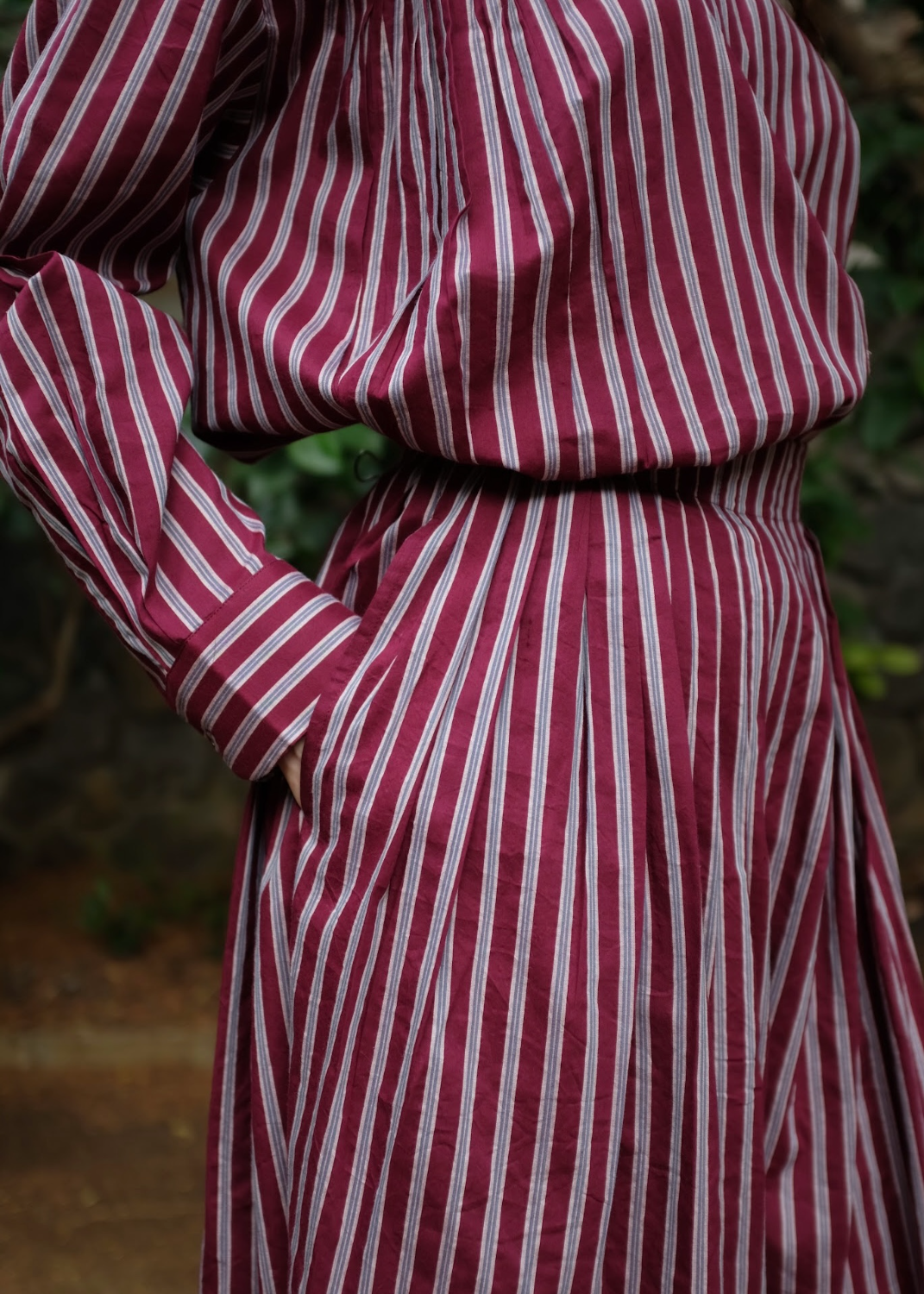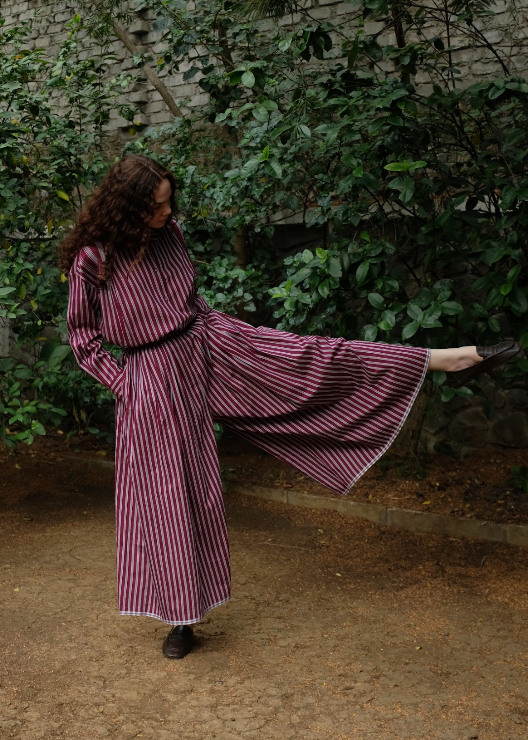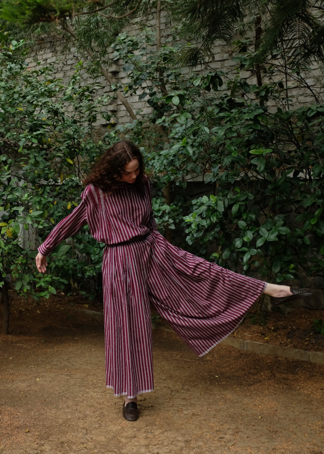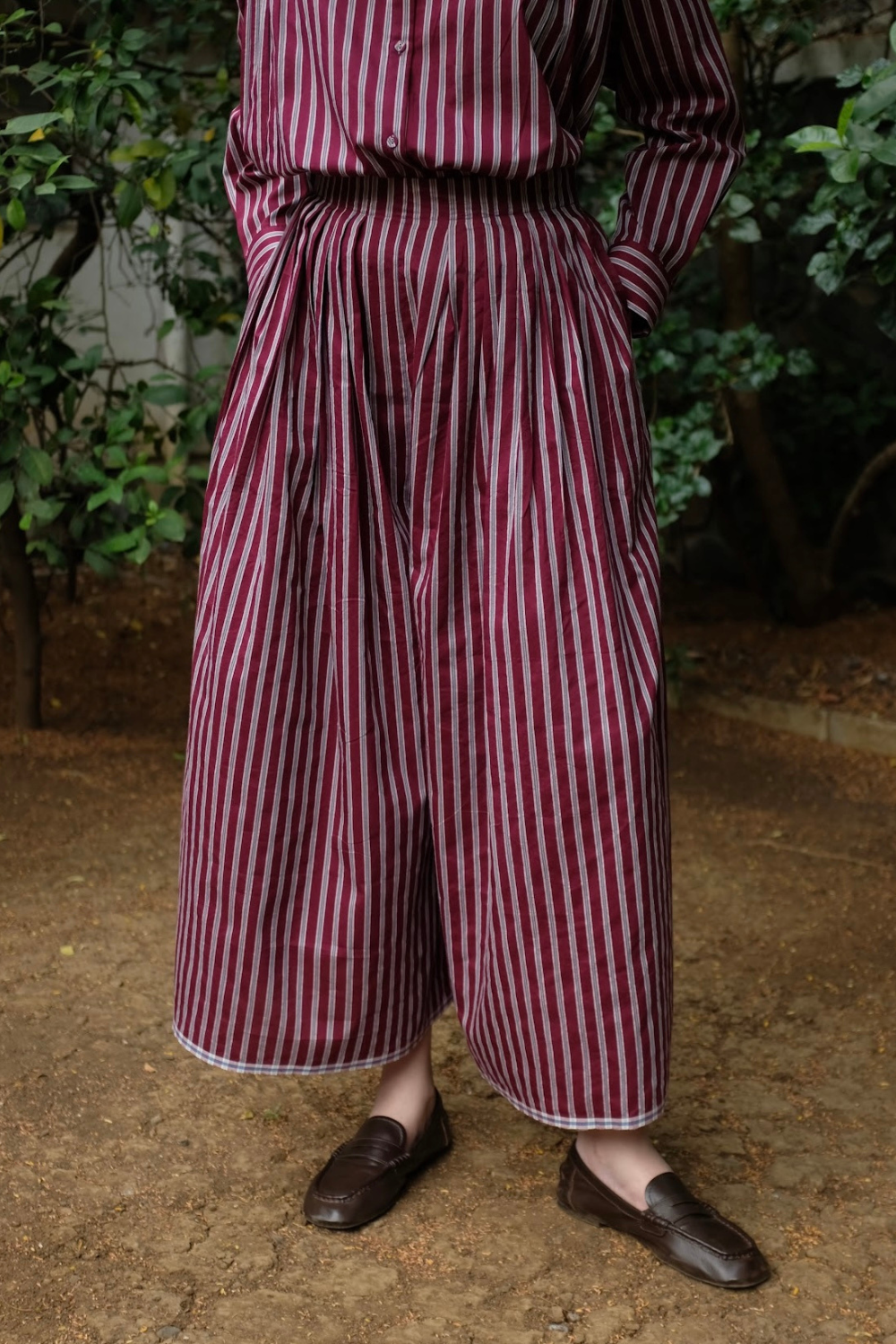 Crafted from handwoven cotton-silk stripes in a rich tone of wine, finished with a contrasting selvedge. These super-wide-leg pants flow like a skirt. Heavily pleated at the waist, with a side zip and pockets.