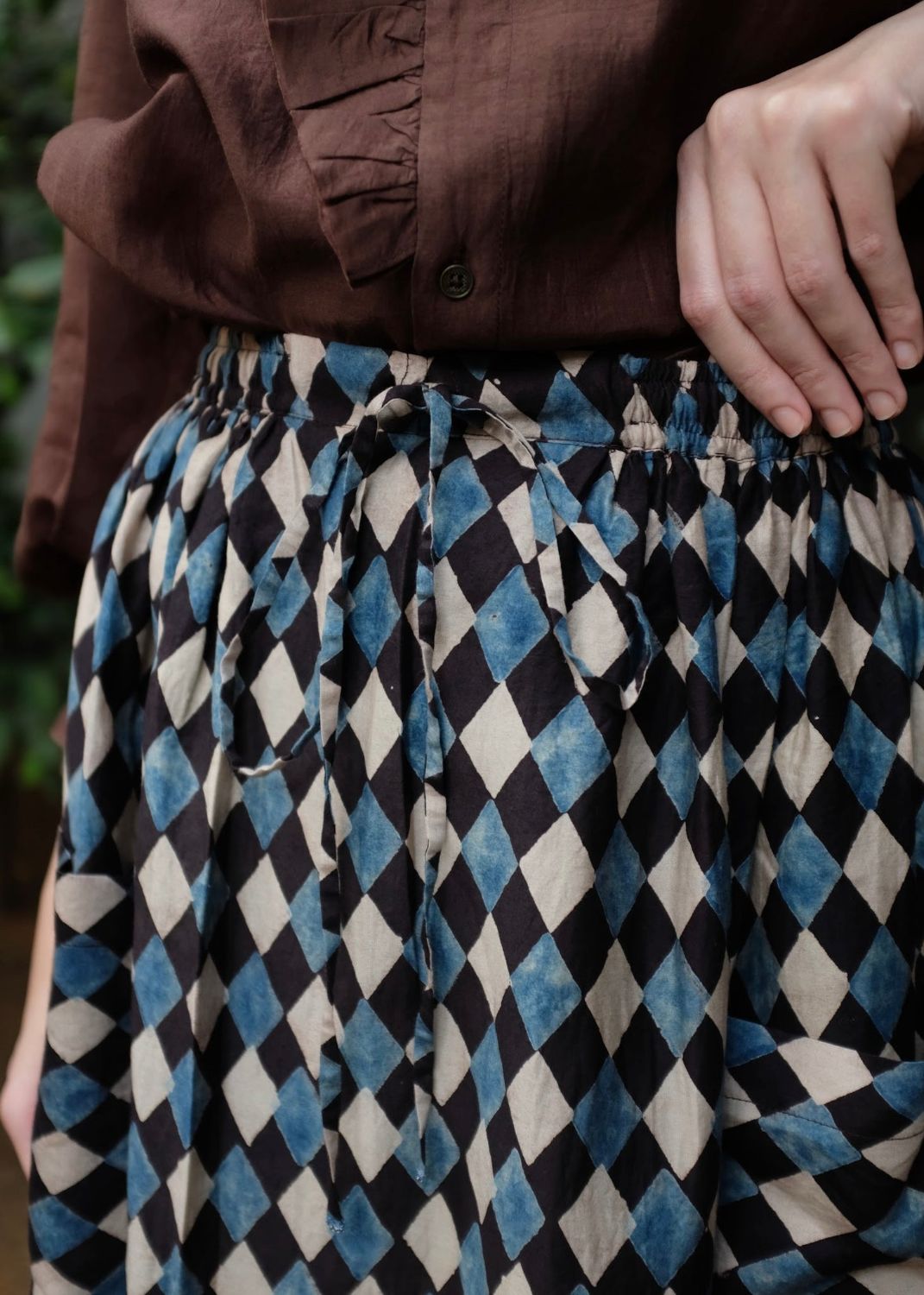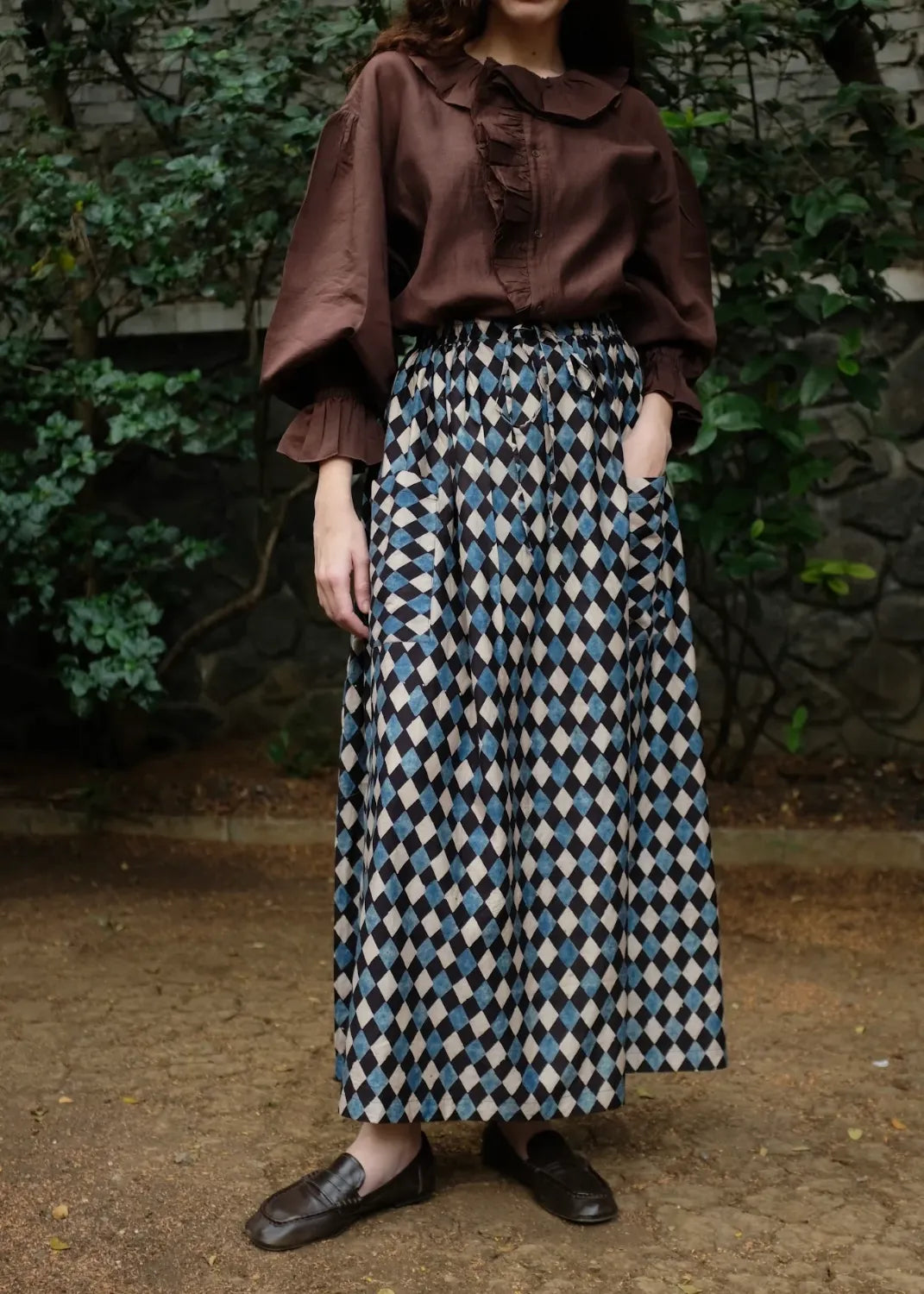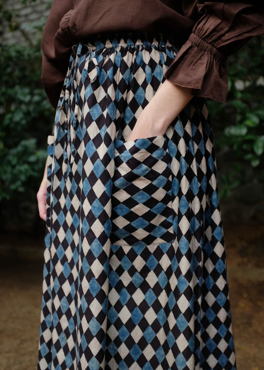 A skirt cut from handwoven cotton silk, hand block printed using natural dyes and 'Ajrakh' technique. Designed with an elasticated waist and adjustable drawstrings, that hold together a bunch of textile that gathers to form our favourite skirt. Finished with functional patch pockets at the front, the piece balances craft, comfort, and quiet character.