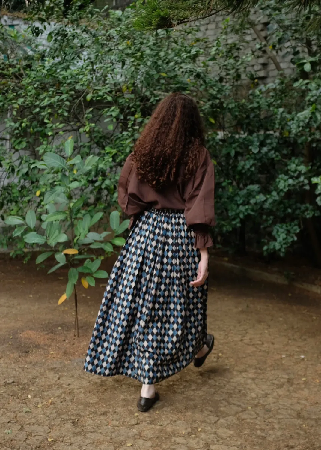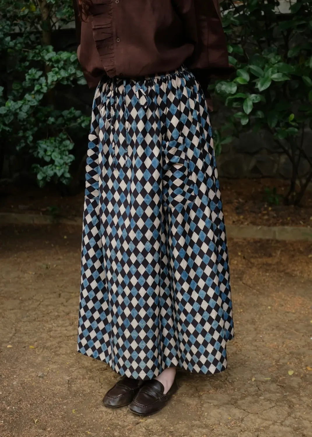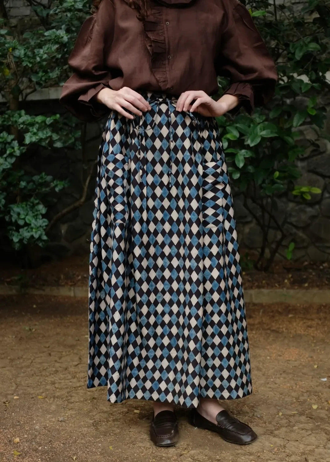 A skirt cut from handwoven cotton silk, hand block printed using natural dyes and 'Ajrakh' technique. Designed with an elasticated waist and adjustable drawstrings, that hold together a bunch of textile that gathers to form our favourite skirt. Finished with functional patch pockets at the front, the piece balances craft, comfort, and quiet character.