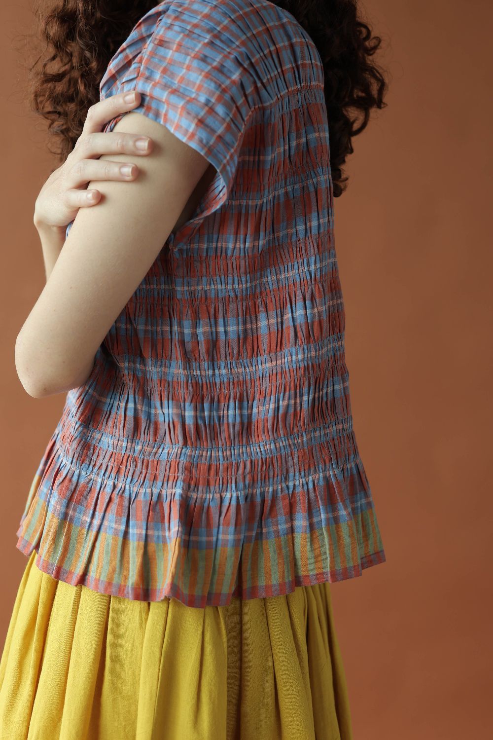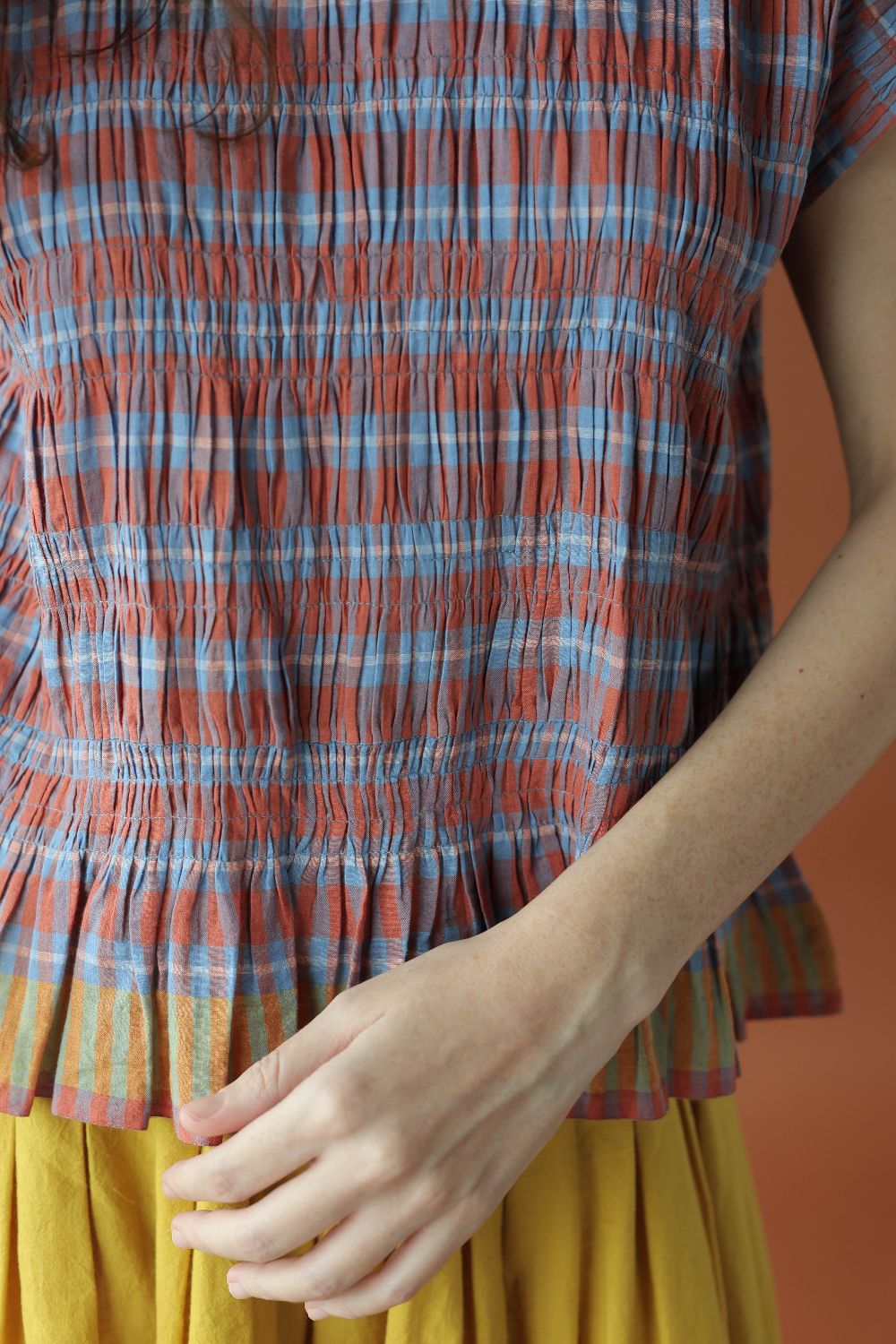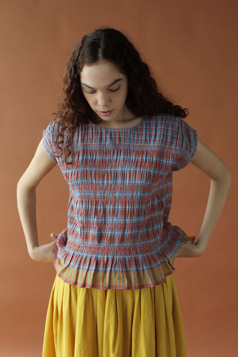 A fun and feminine top with shirring that creates a soft, gathered silhouette that cinches your body just enough to flatter it. The relaxed drop‑shoulder cut adds ease to it with the contrasting yellow selvage making it all fit perfectly together.