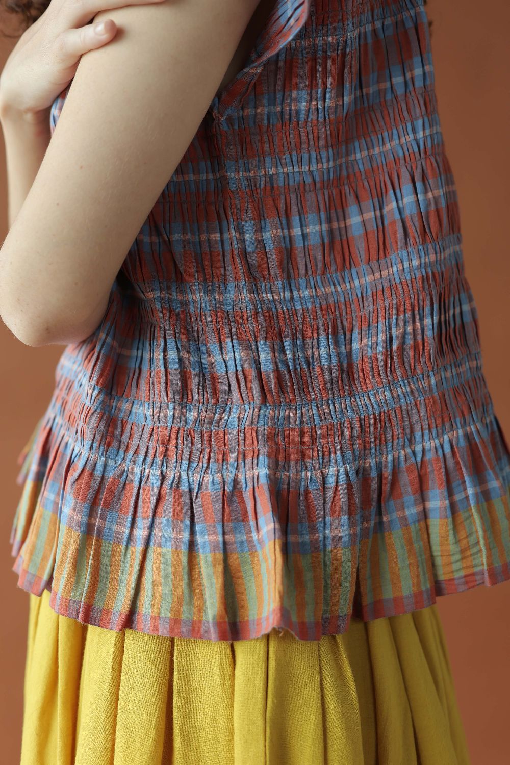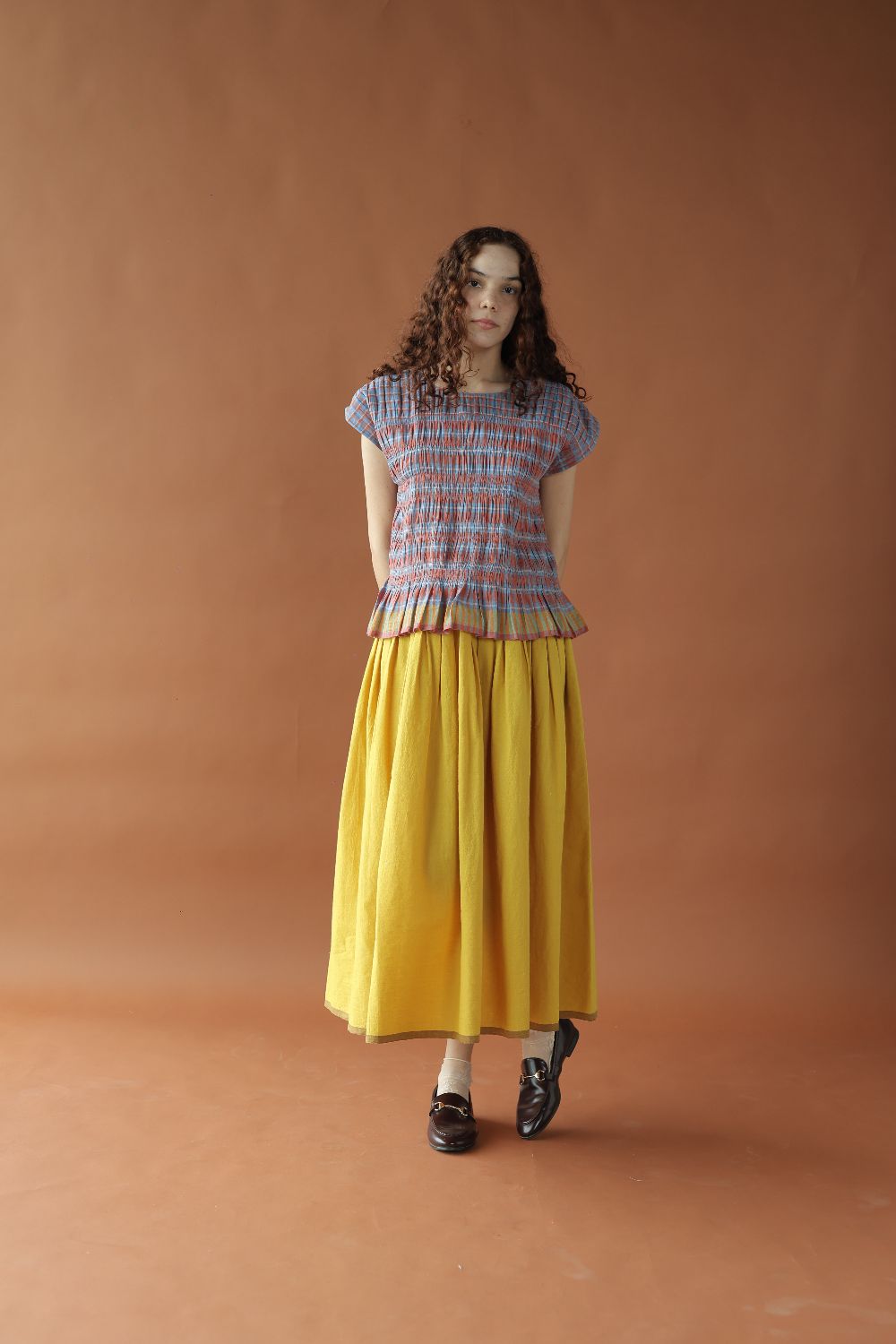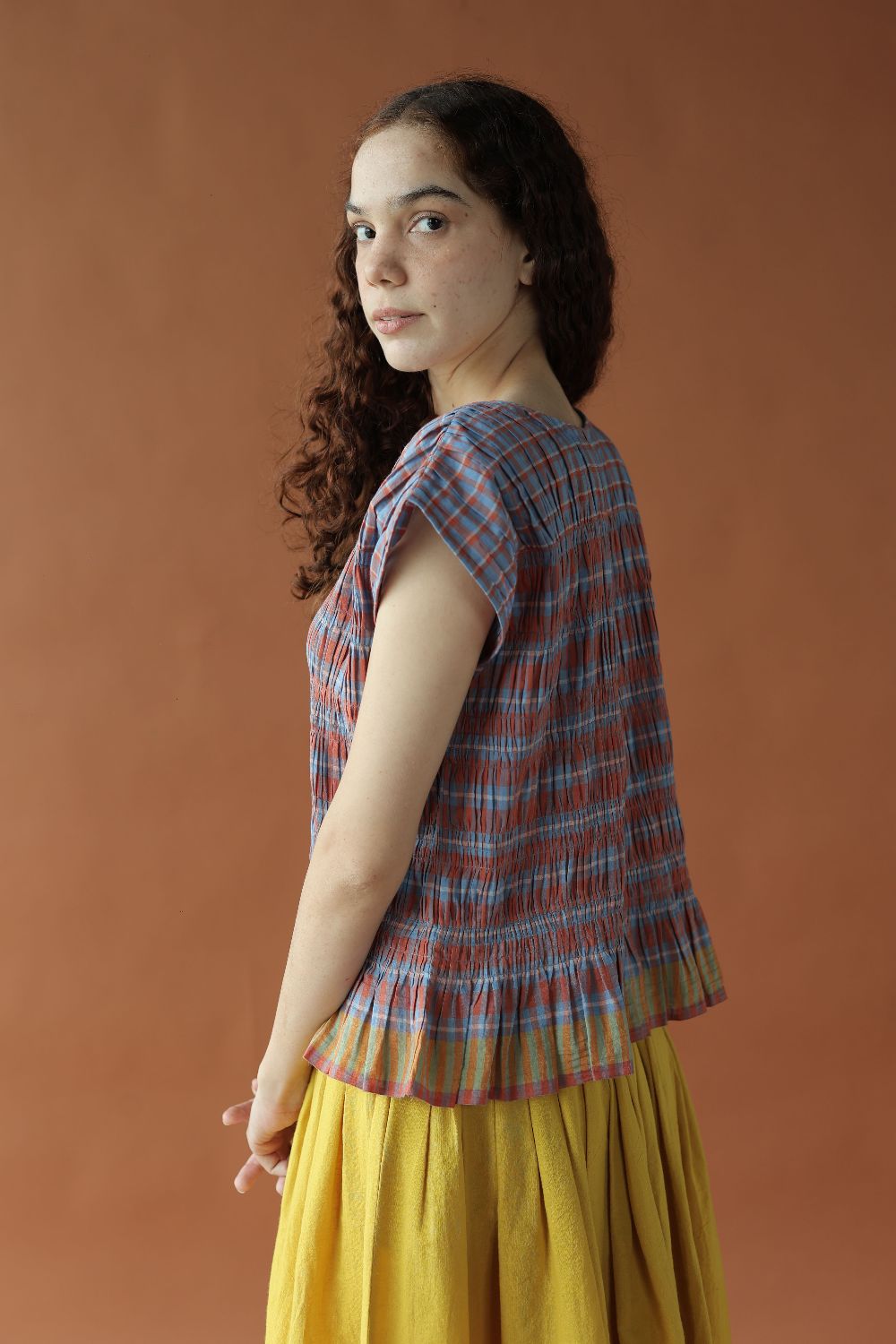 A fun and feminine top with shirring that creates a soft, gathered silhouette that cinches your body just enough to flatter it. The relaxed drop‑shoulder cut adds ease to it with the contrasting yellow selvage making it all fit perfectly together.
