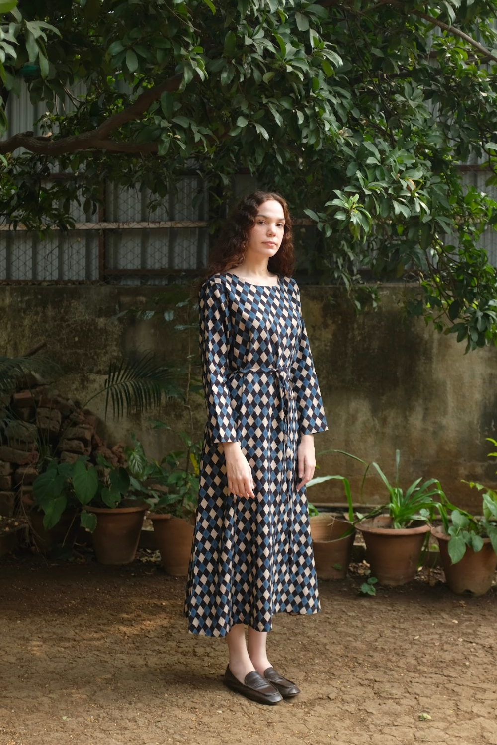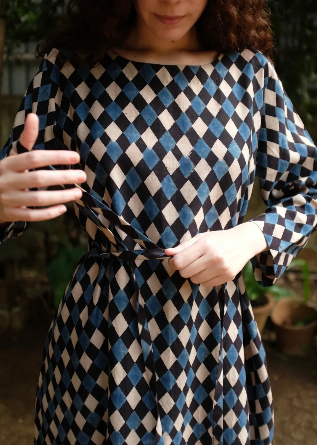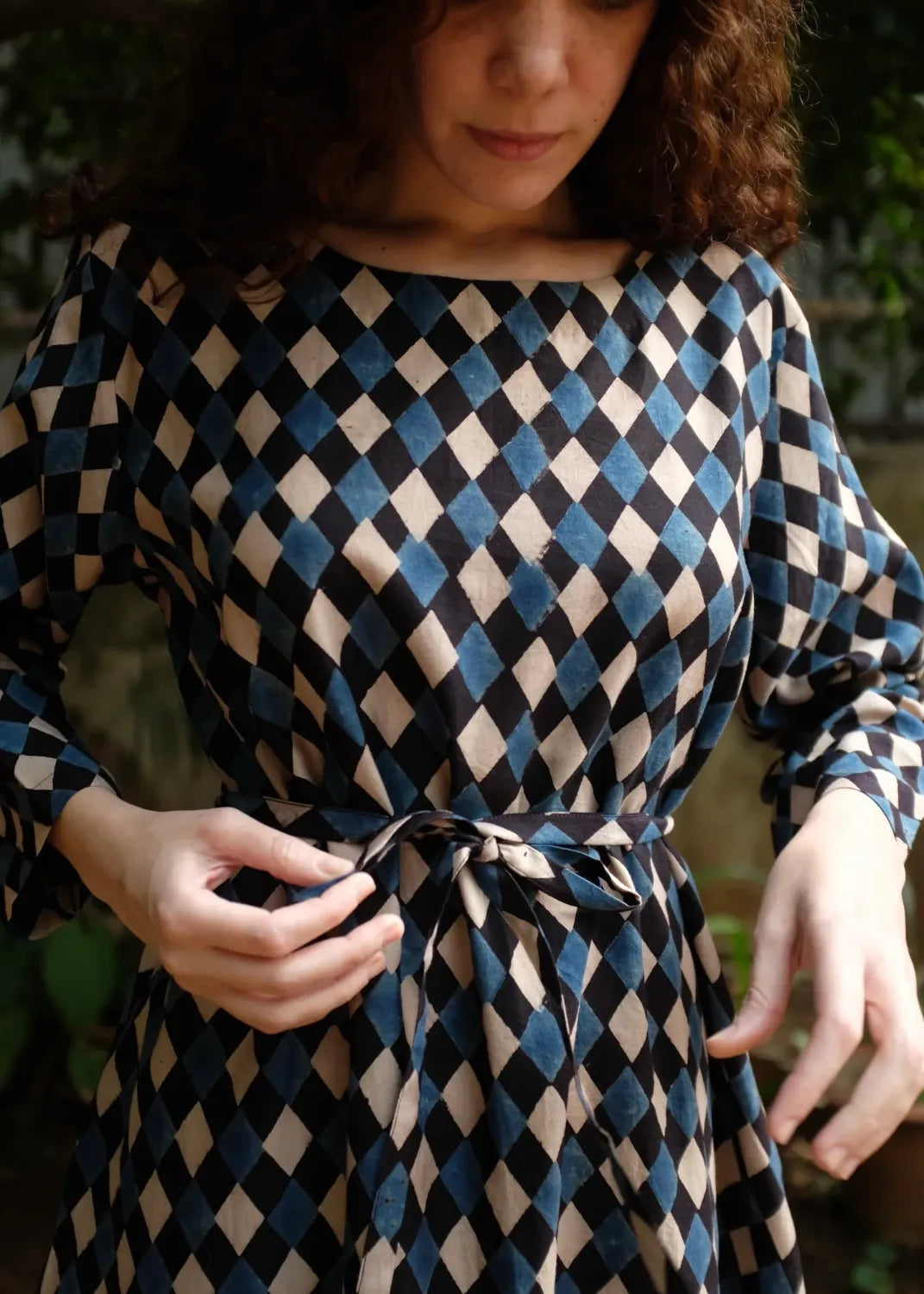 Our best seller 'Helena' - he perfect straight dress in a beautiful handwoven soft mulberry silk by cotton fabric, in the most appealing handprinted Ajrakh, a labour intensive hand block print technique that uses 100% natural dyes. The dress comes with a thin fabric belt to cinch in the waist if needed.