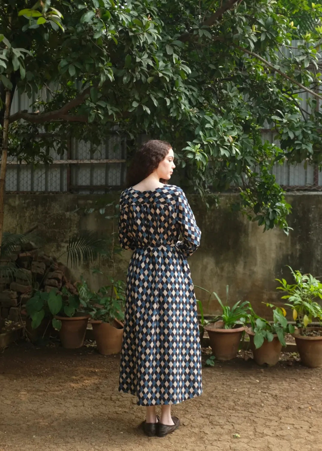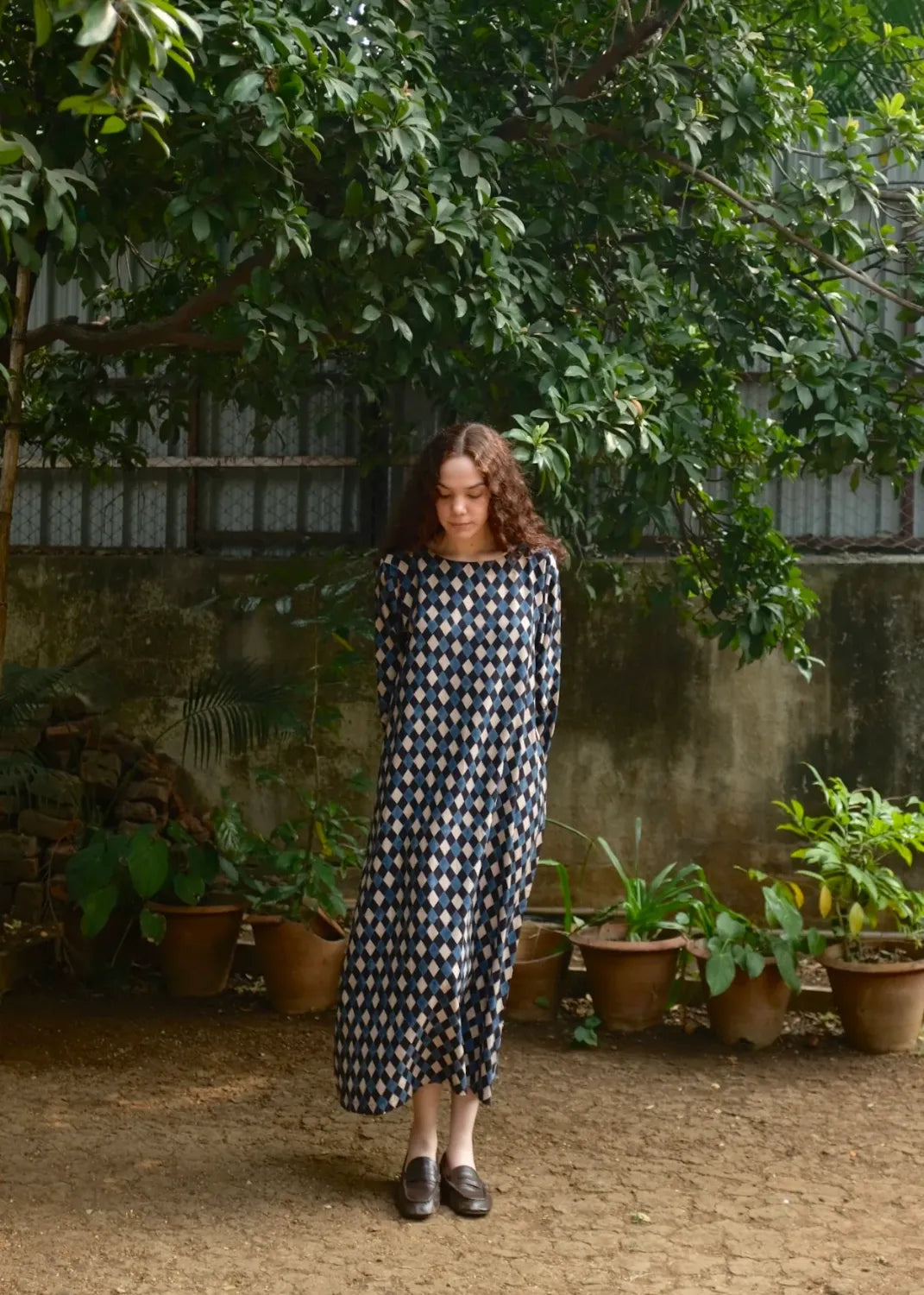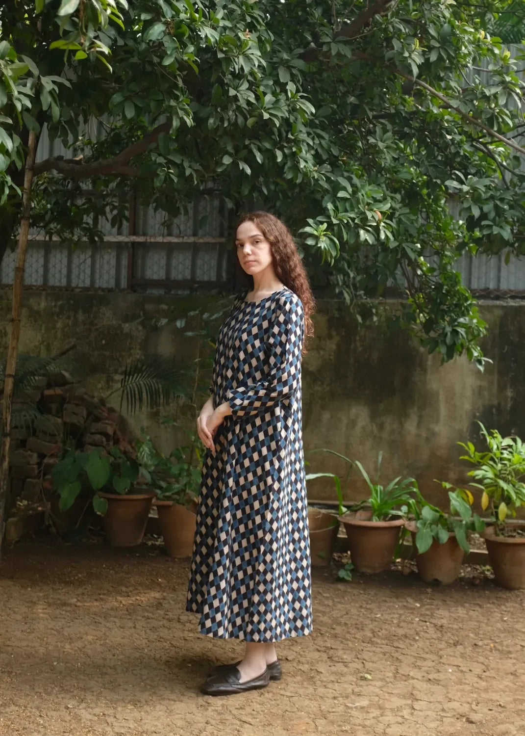 Our best seller 'Helena' - he perfect straight dress in a beautiful handwoven soft mulberry silk by cotton fabric, in the most appealing handprinted Ajrakh, a labour intensive hand block print technique that uses 100% natural dyes. The dress comes with a thin fabric belt to cinch in the waist if needed.