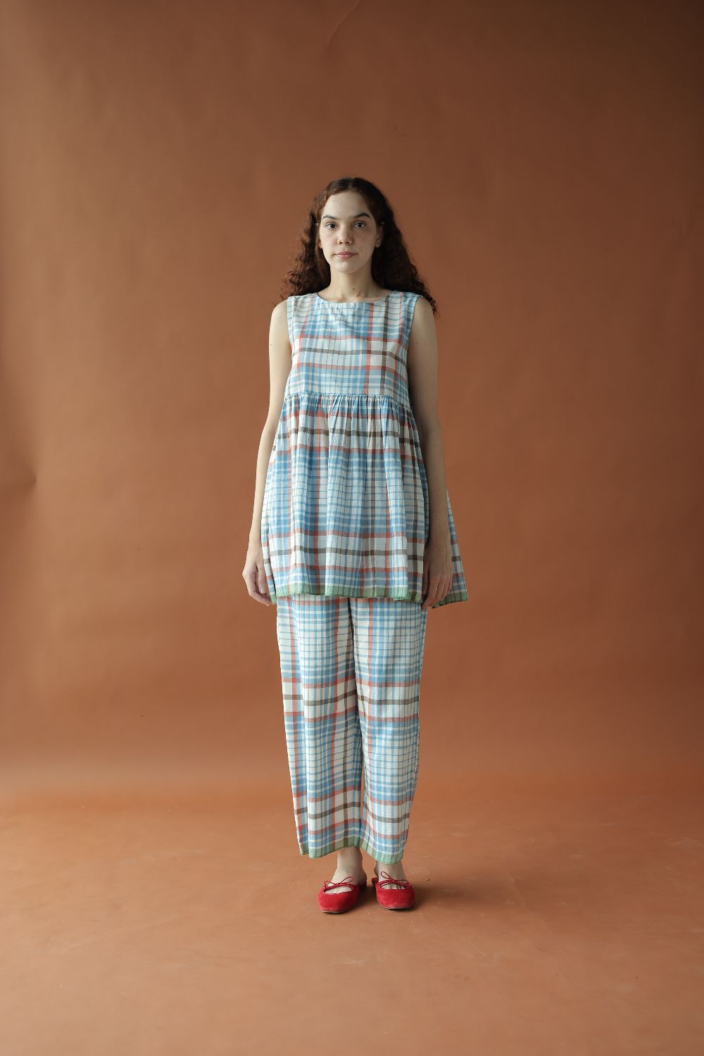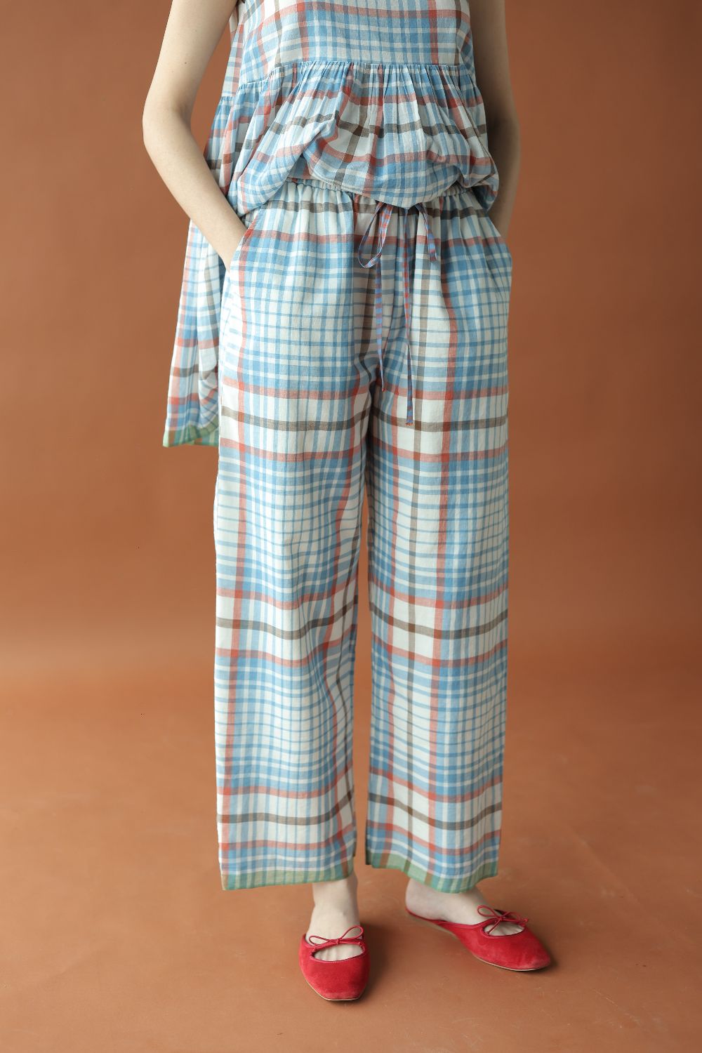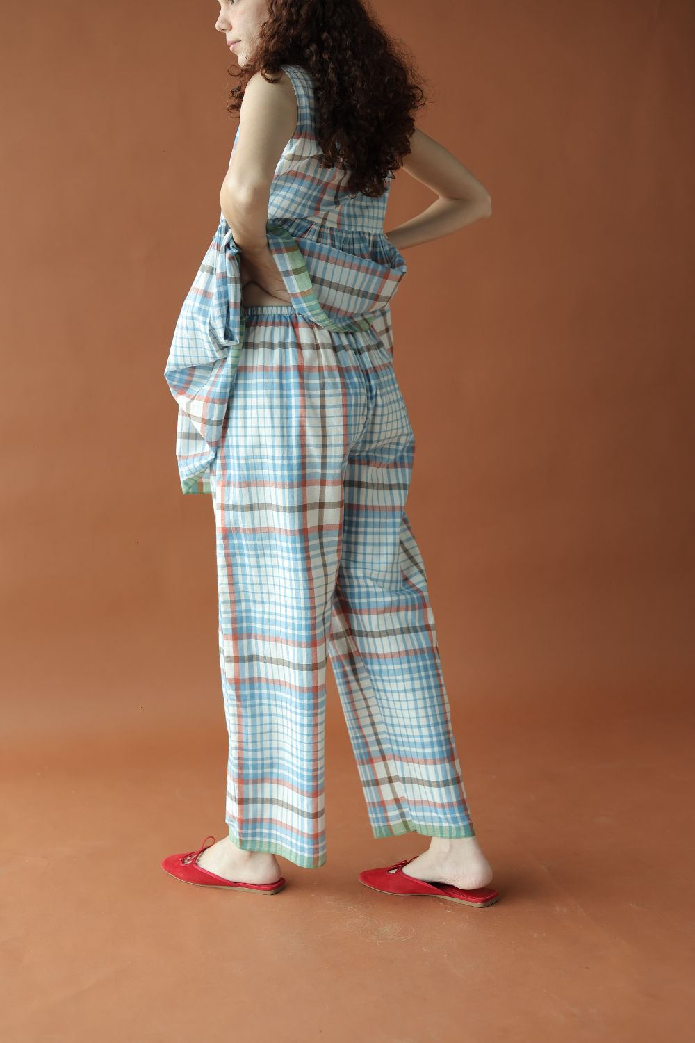 Regular fit straight pants, cut in the softest handwoven cotton blue and white checks, with a thin elasticated waistband + drawstring and two side pockets, finished with a contrast selvedge hem.