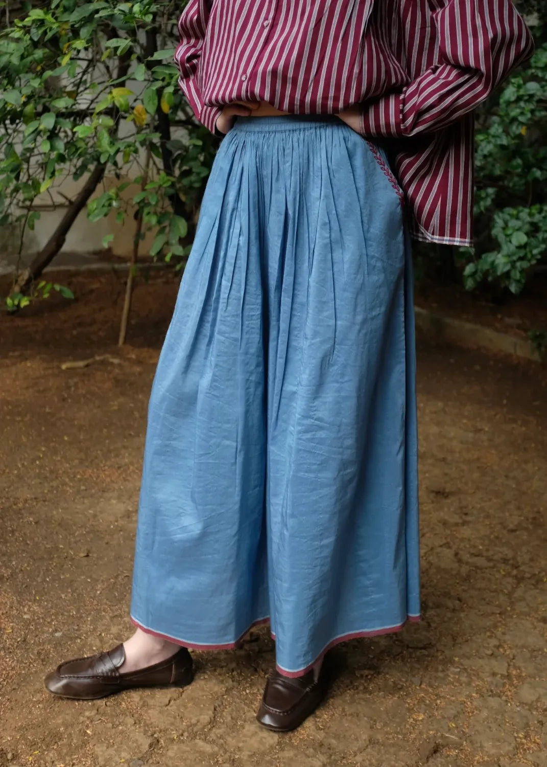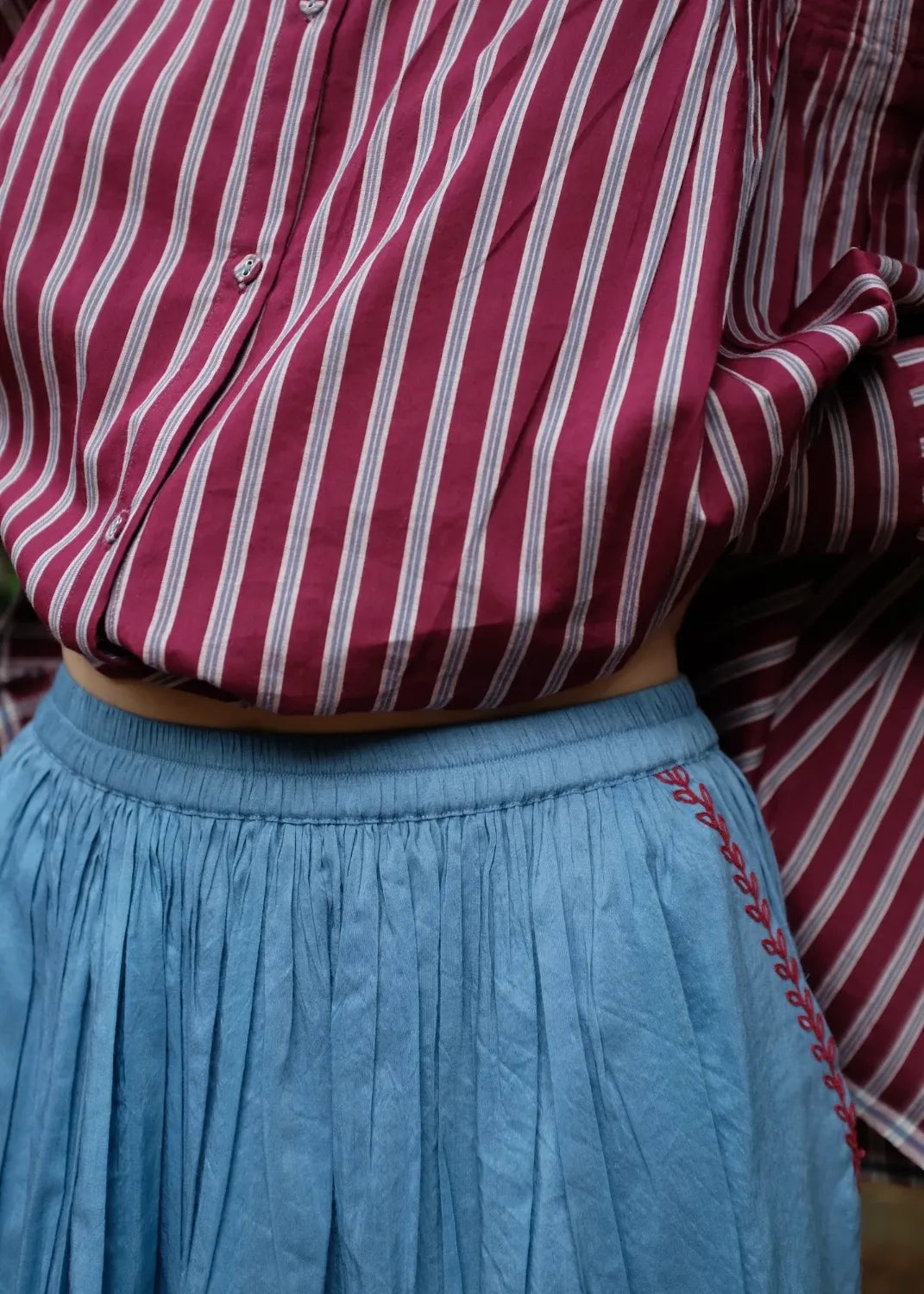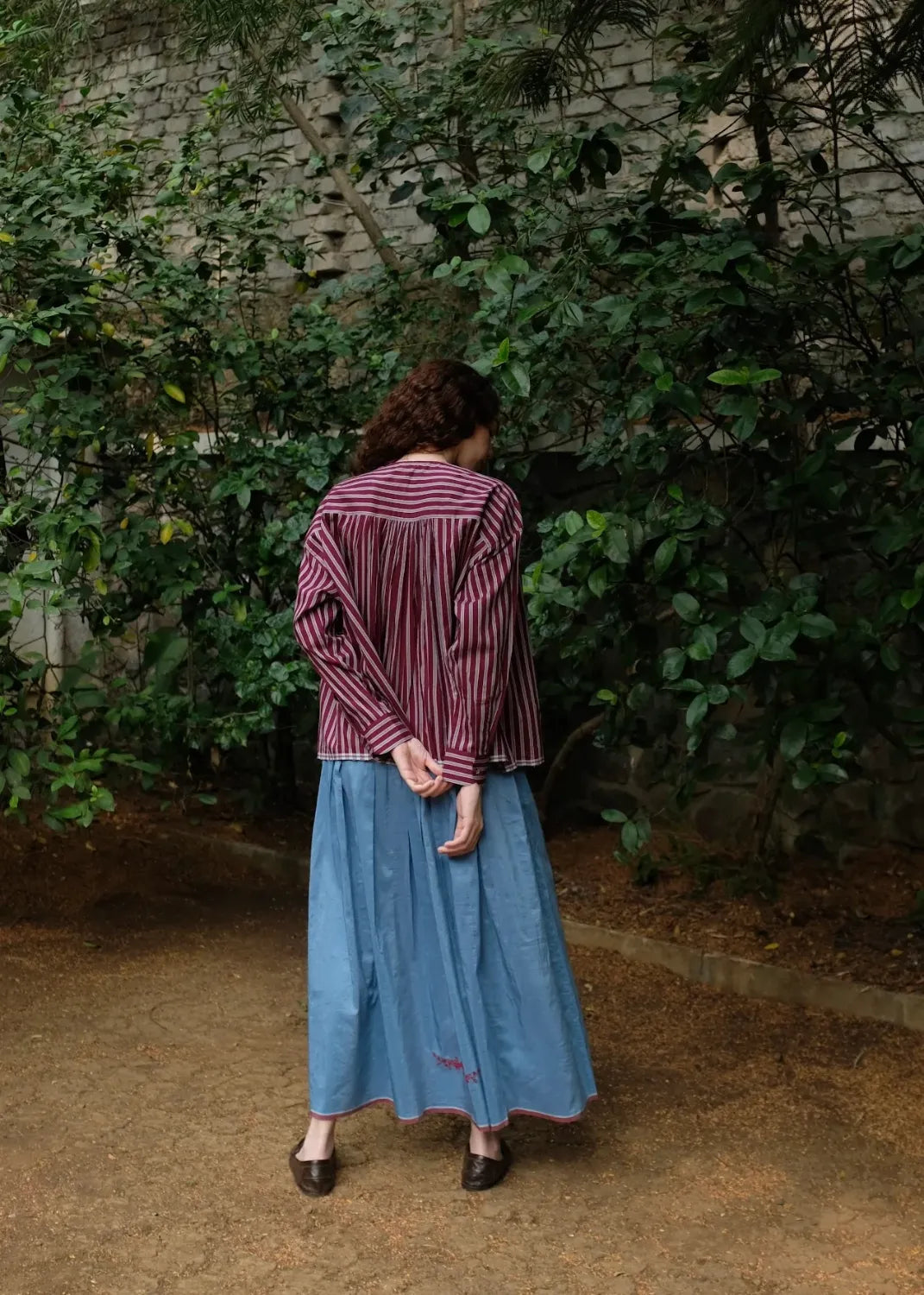 Cut from a handwoven blend of mulberry silk and light-weight merino wool, this top carries quiet richness in both feel and form. Dainty tonal embroidery rests gently on the surface, adding character. A front placket to break the monotony of gathers and straight sleeves to complete the ensemble.