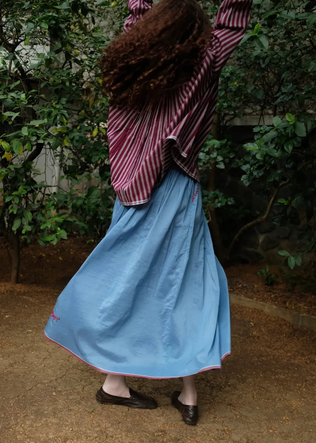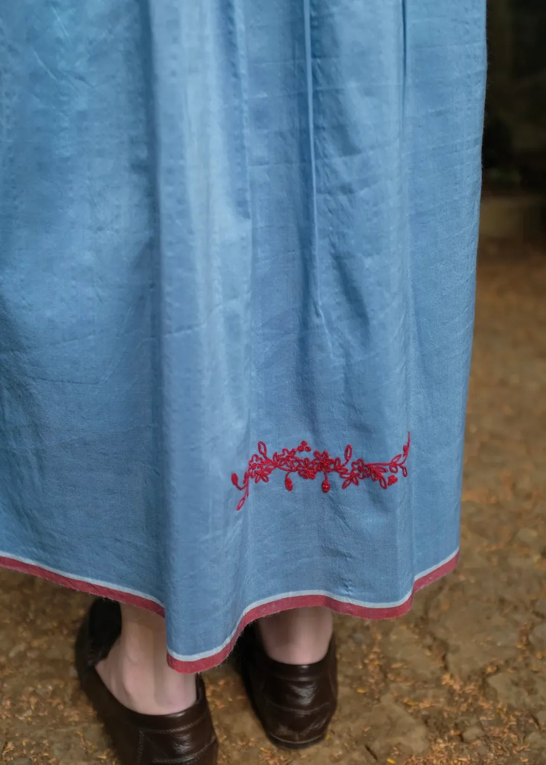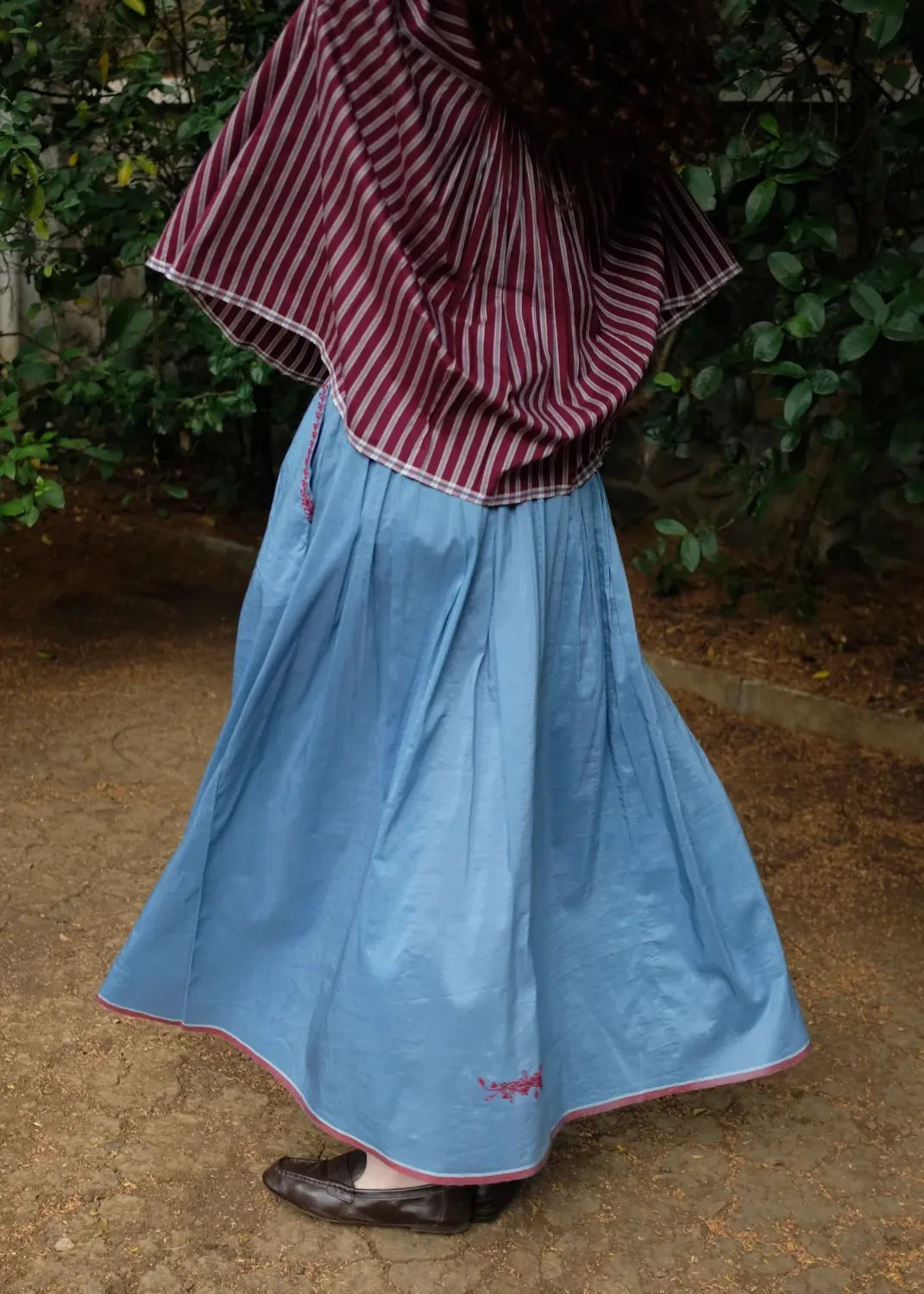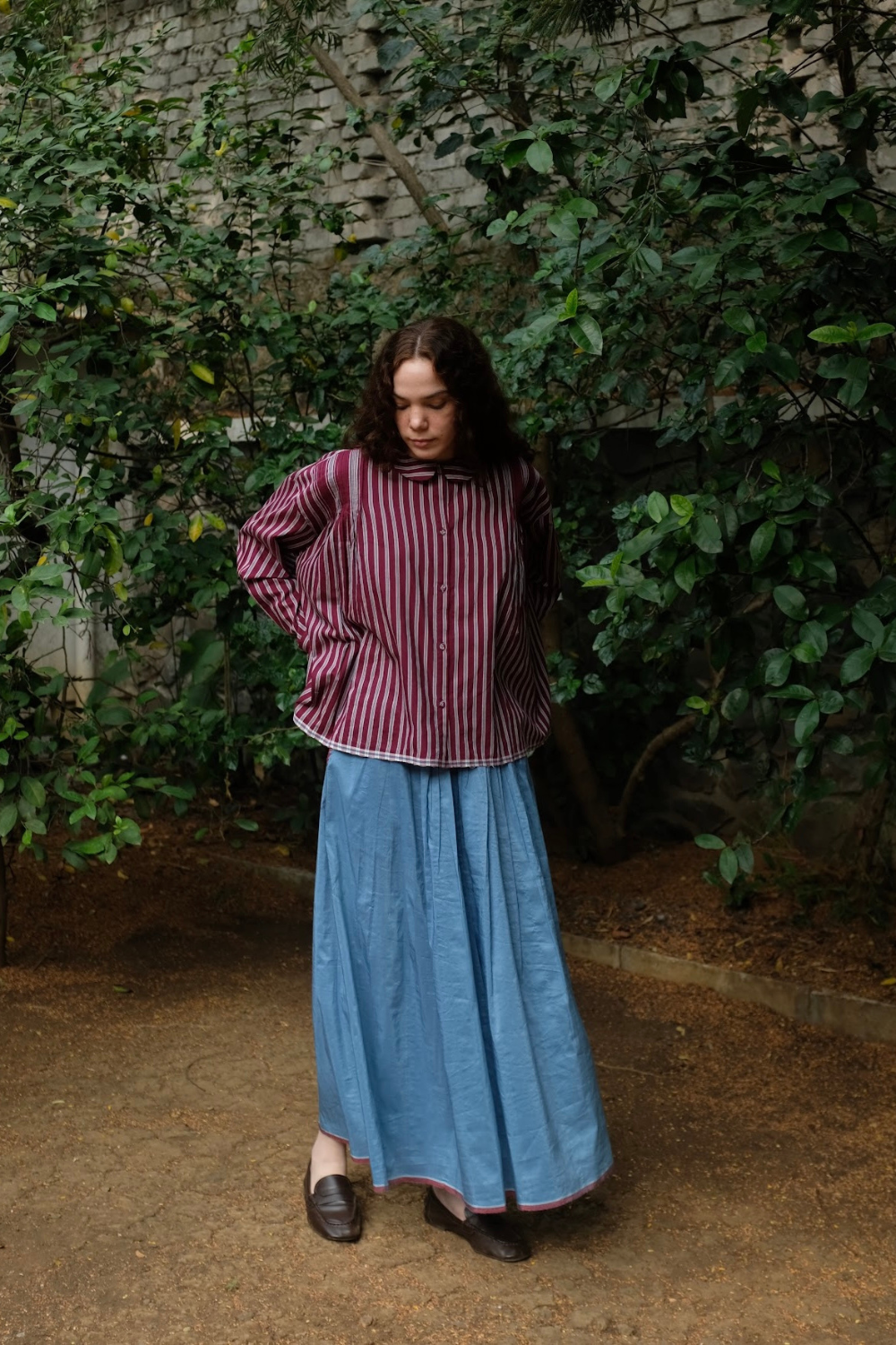 Cut from a handwoven blend of mulberry silk and light-weight merino wool, this top carries quiet richness in both feel and form. Dainty tonal embroidery rests gently on the surface, adding character. A front placket to break the monotony of gathers and straight sleeves to complete the ensemble.