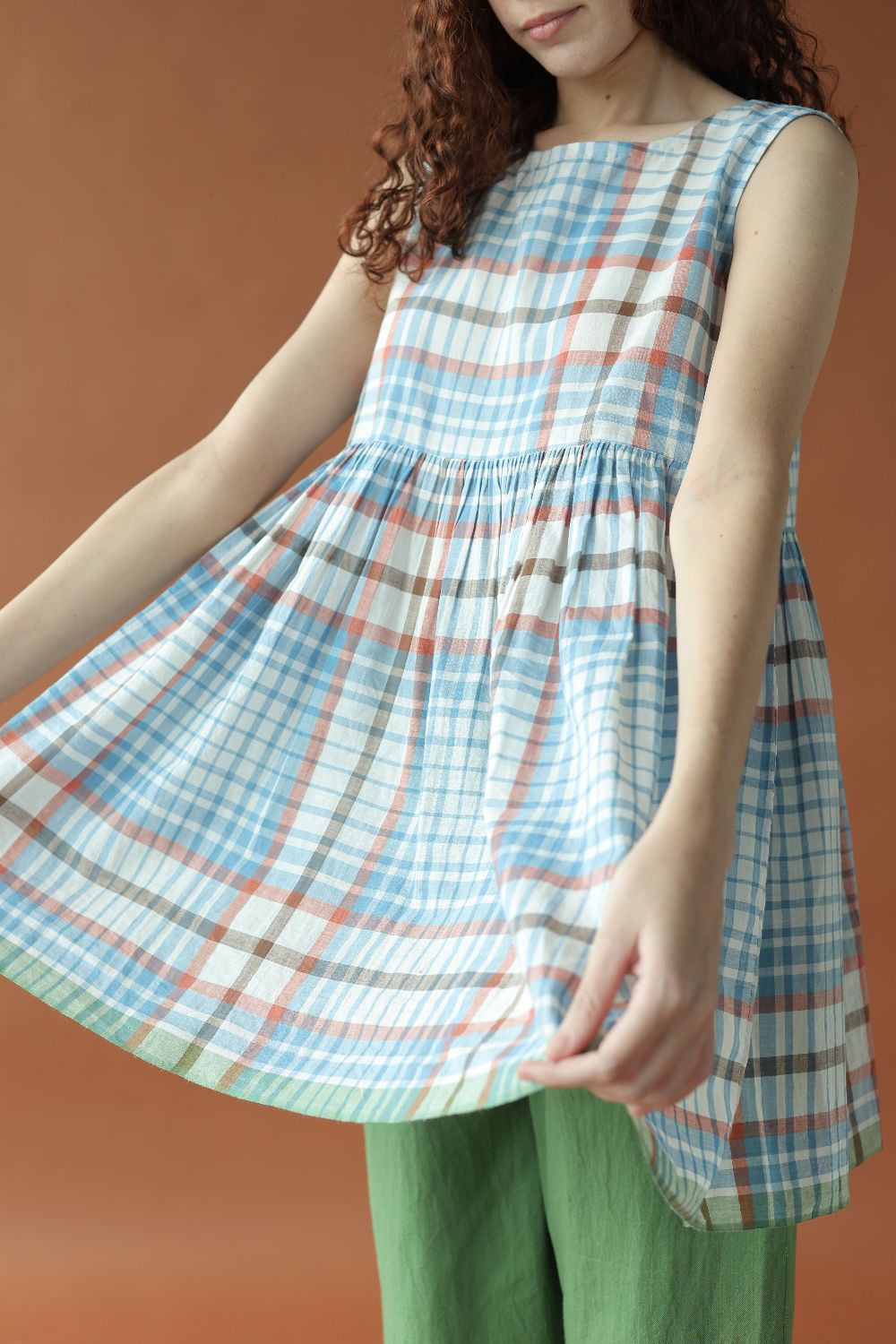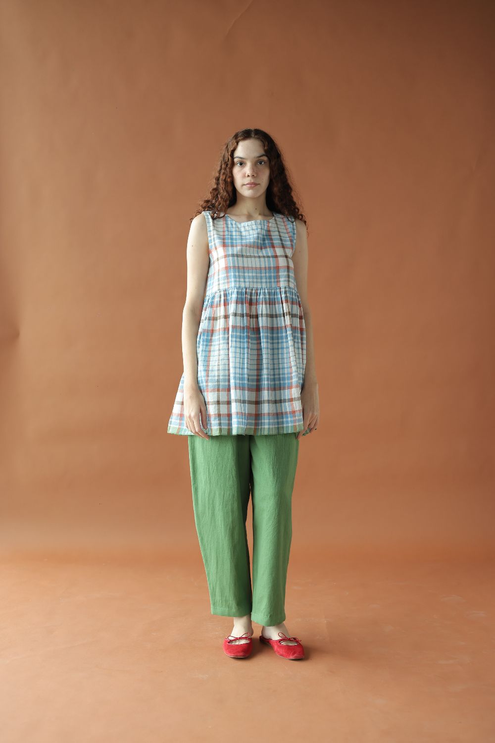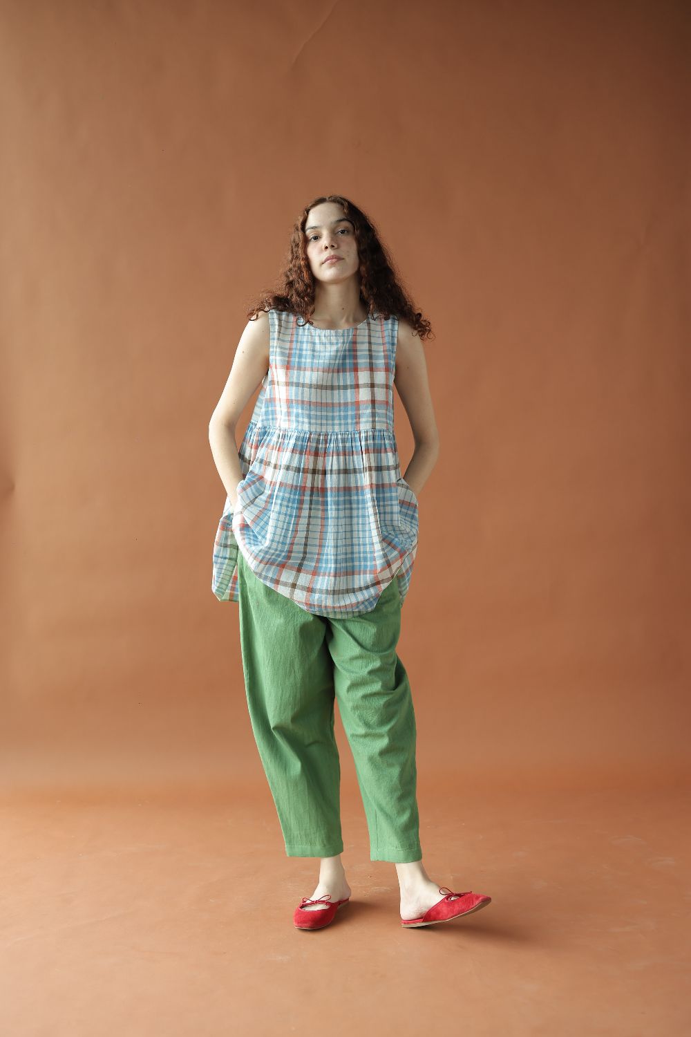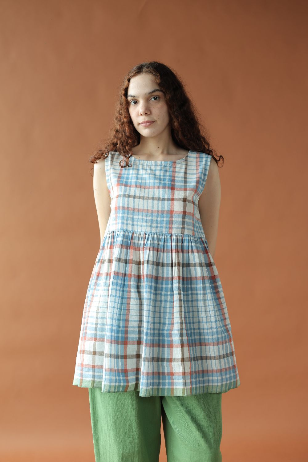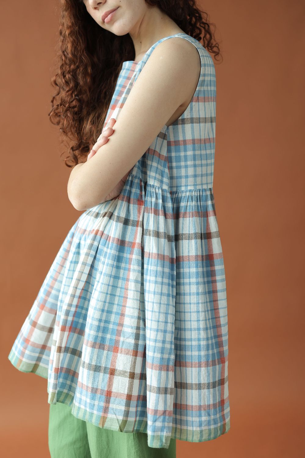 Cut in handwoven blue checks cotton fabric, 'Zyra' is a classic A - line sleeveless top with gatheres running down the waist