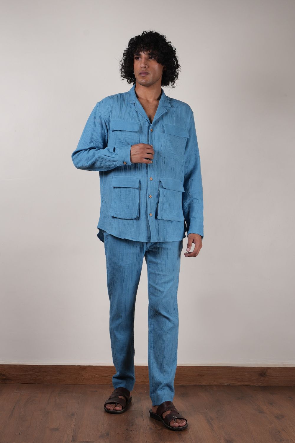 A front button open shirt with cuban collar and four pockets in the front comes with straight crush pants both made in 100% natural cotton. Total 2pcs.