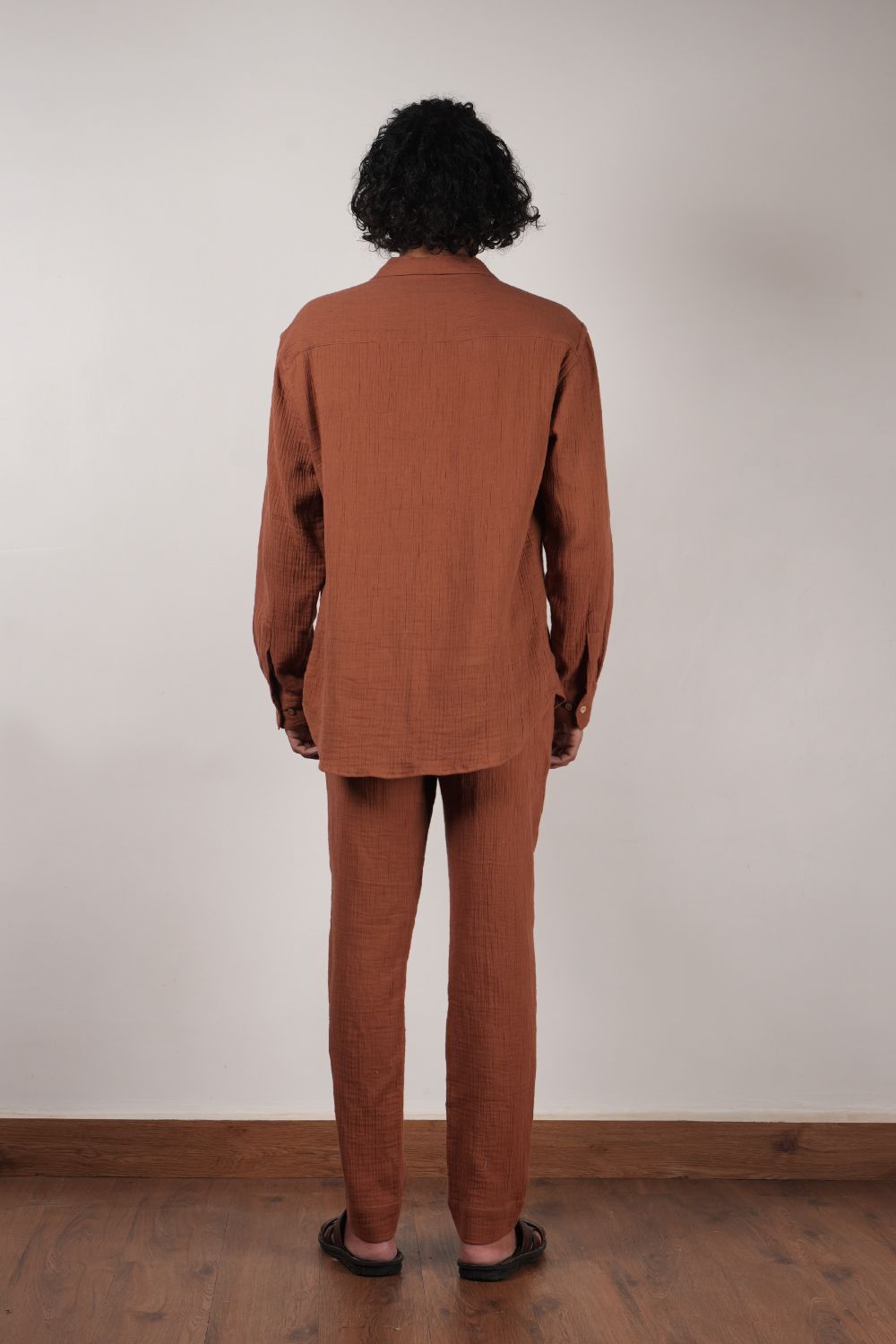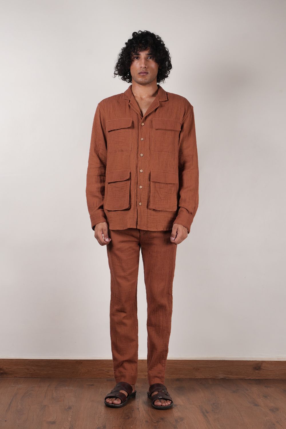 A front button open shirt with cuban collar and four pockets in the front comes with straight crush pants both made in 100% natural cotton. Total 2pcs.