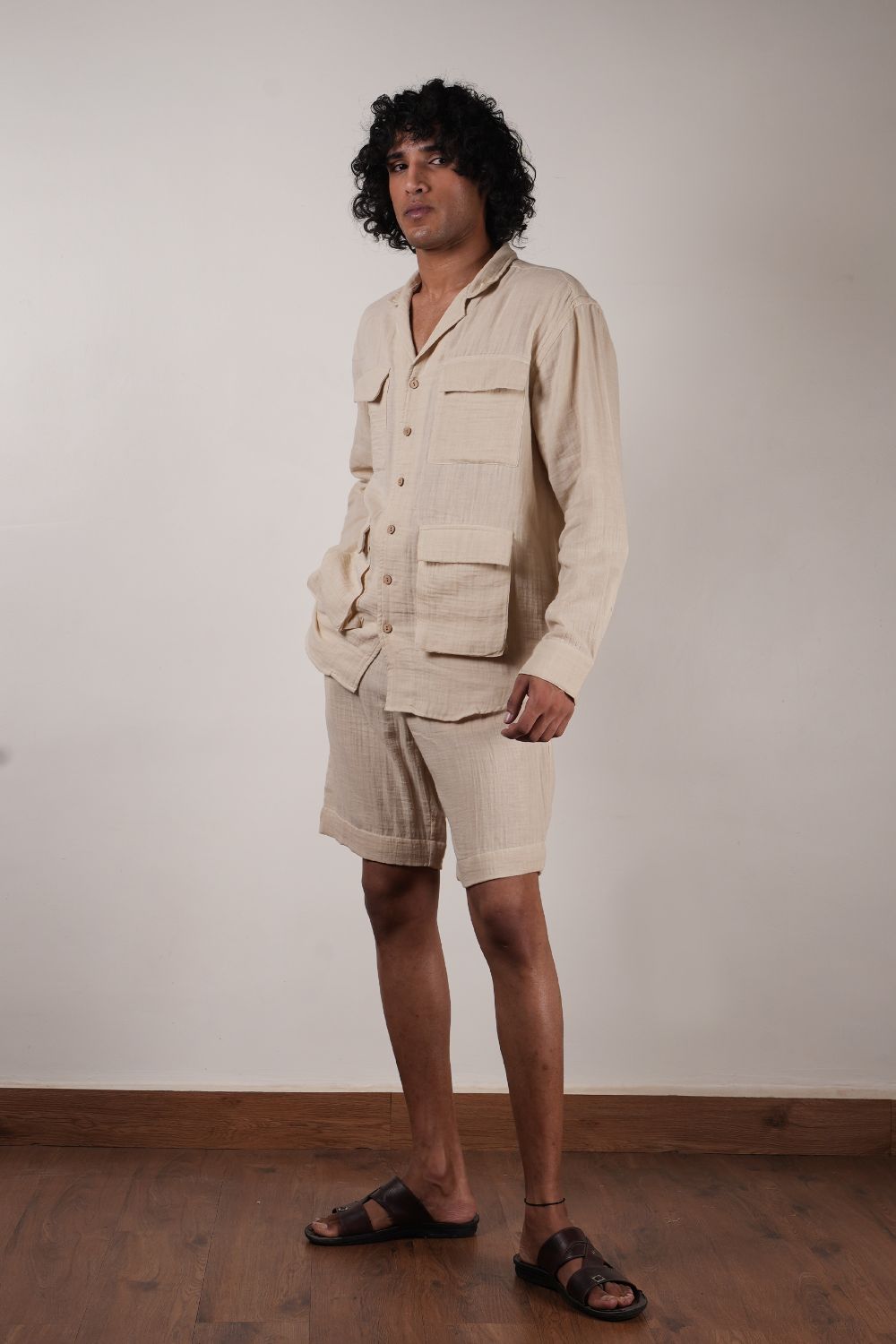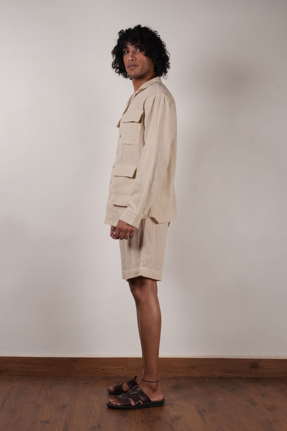 A front button open shirt with cuban collar and four pockets in the front comes with crush shorts with elasticated waist both made in 100% natural cotton. Total 2pcs.