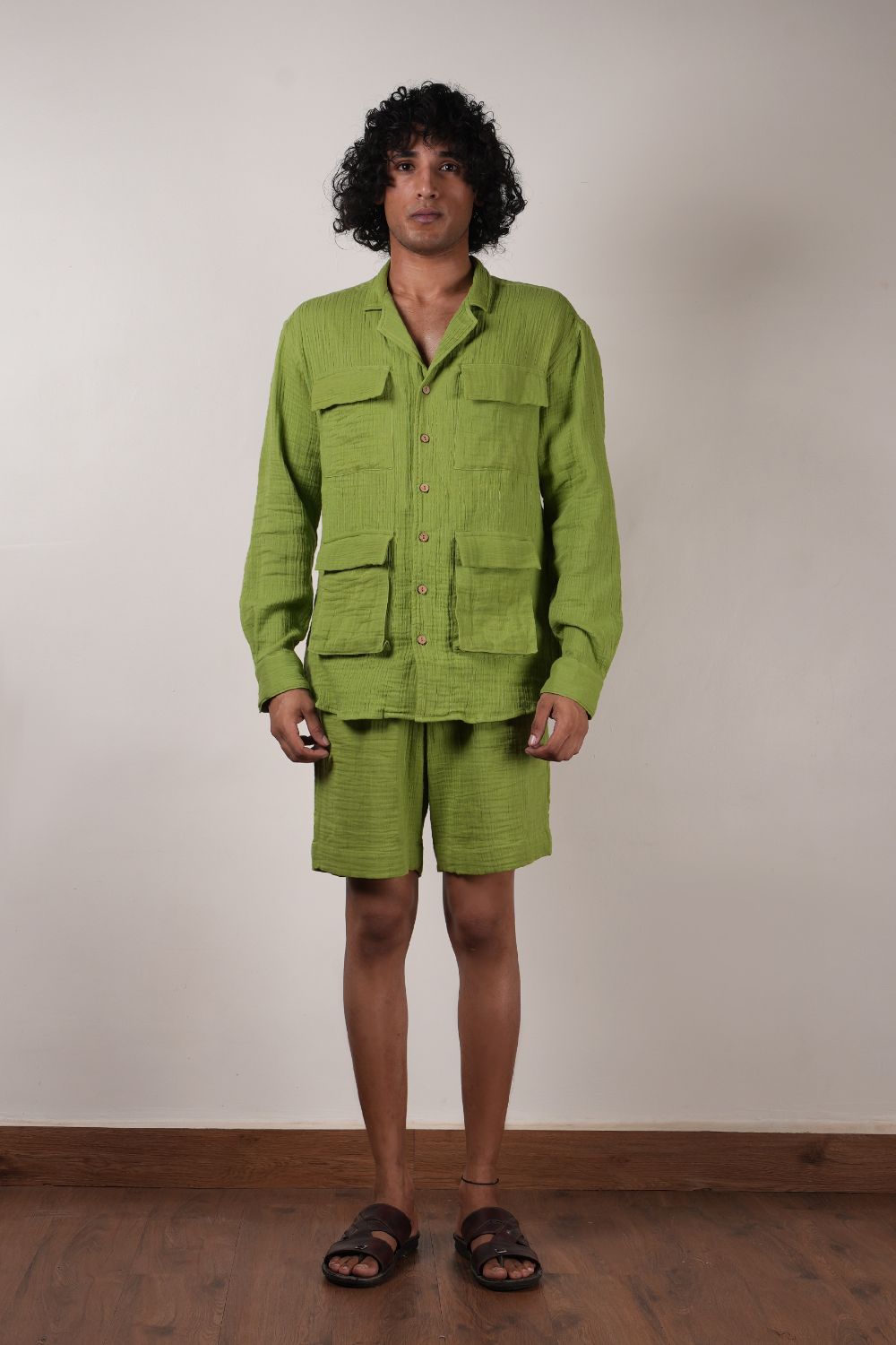 A front button open shirt with cuban collar and four pockets in the front comes with crush shorts with elasticated waist both made in 100% natural cotton. Total 2pcs.