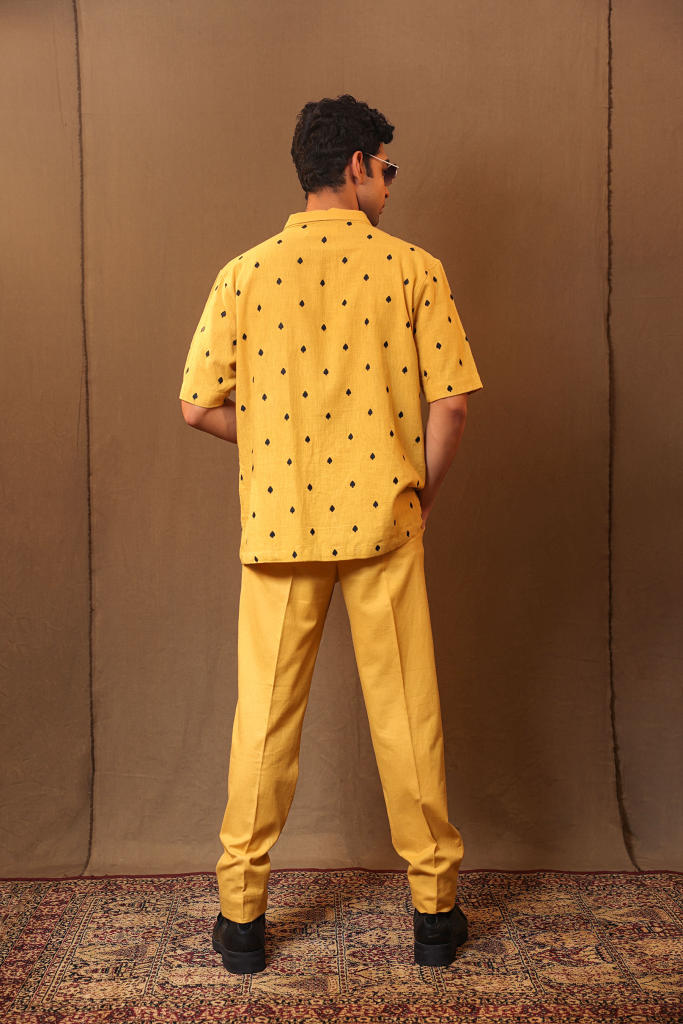 Overlap jacket style shirt made in embroidered handspun kala cotton teamed with the straight pants in handspun cotton. Set of 2 PCS.