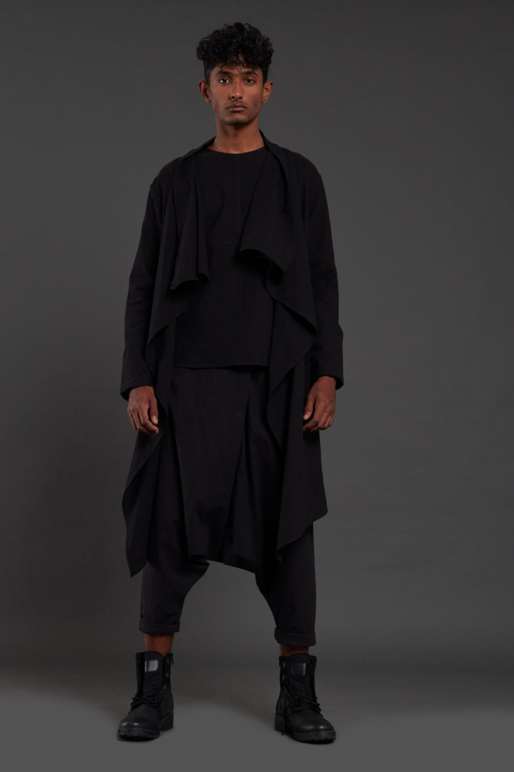 3 way Black Jacket: A long drape cotton jacket can be worn three ways with buttons on the shoulder for styling.