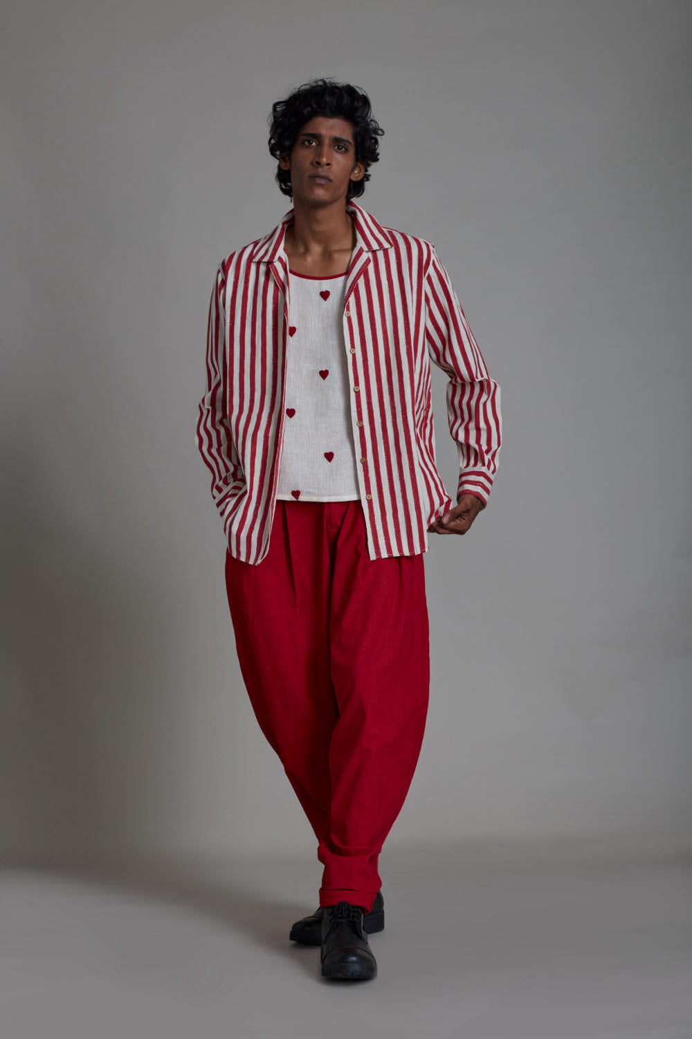 SET:This ensemble consists of round neck embroidered tank top, relaxed fit balloon pleated pants, its breezier and comfortable with side pockets ,elasticated at the back for better fit and comfort and hand block printed striped shirt with notch collar to give an edgier and smart look. Style this outfit with boots and hit the road in style!!(set of 3)