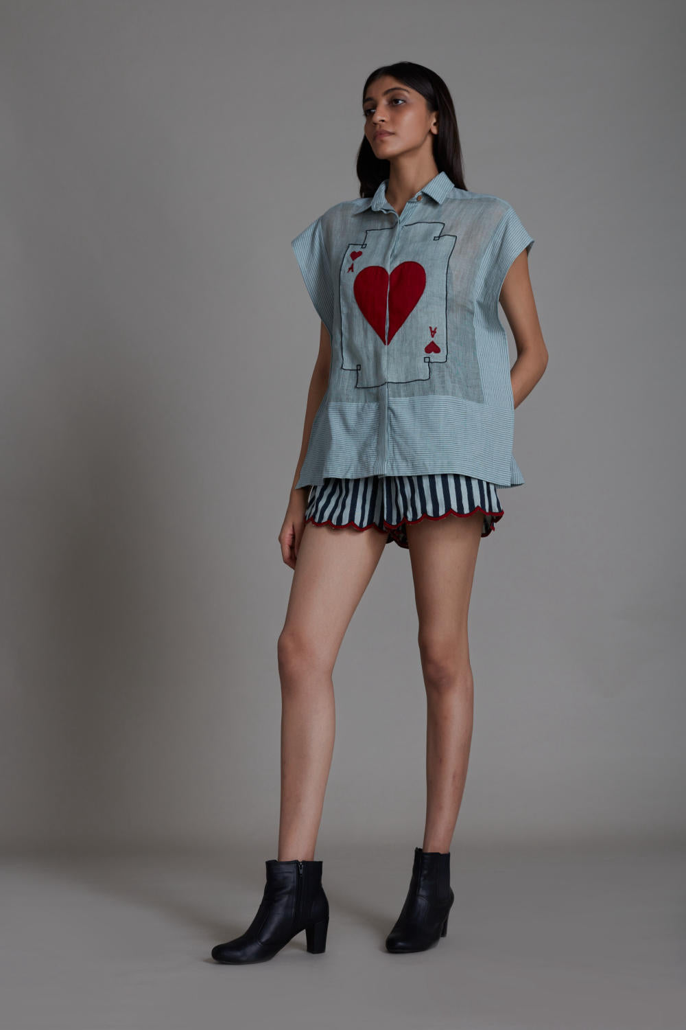 A cute, stylish, and minimal ace kaftan shirt with hand applique and intricate card thread embroidery. Complete the look with our hand-block printed shorts with embroidered scallop details from the collection. Handwoven matching cotton bralette inner comes with the shirt.