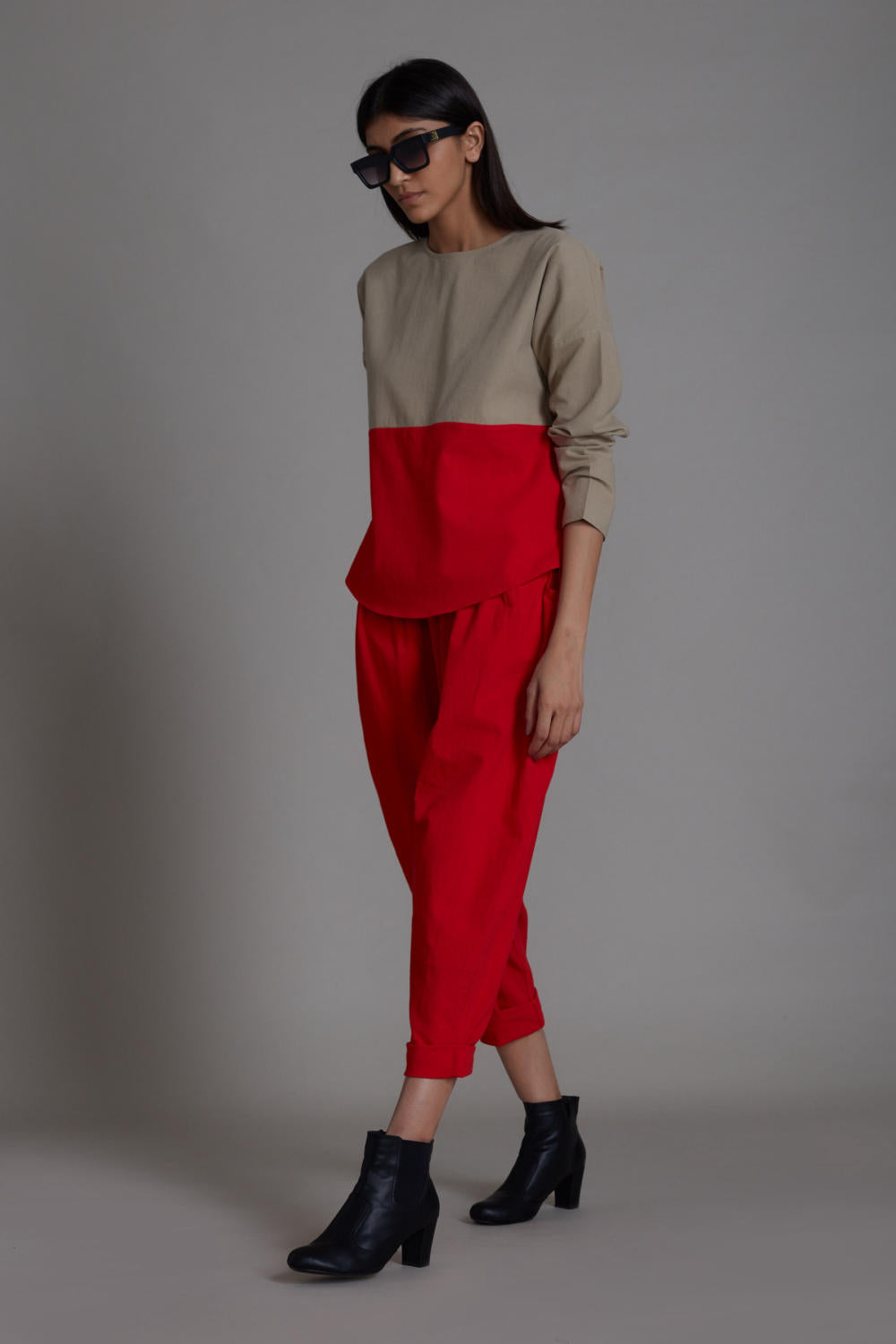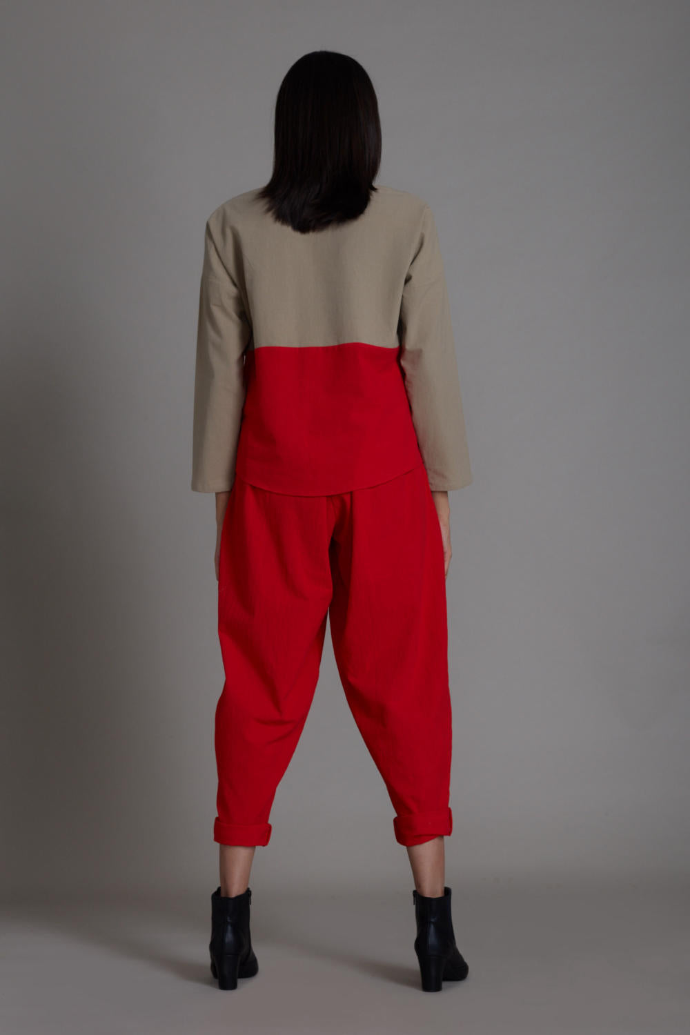 A set of relaxed-fit colour block top with full-length pleated balloon pants and side pockets.