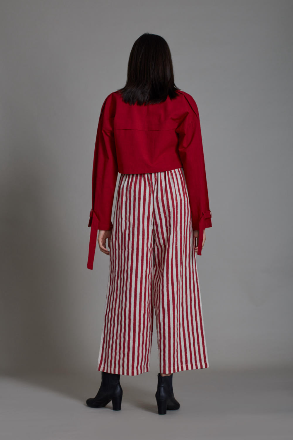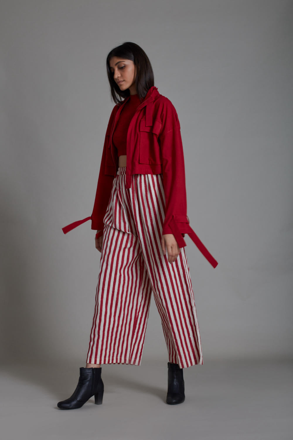This set features smocked racer back top, striped RE pant and shuffle jacket. These pieces are made in hand-woven cotton. The wide leg pants are comfortable with elastic detailing at the back and comes with pockets too. The top is made with smocked fabric and is cut in style to fit perfectly. Style the pieces together for an edgy look or style it separately for a more casual look. (set of 3)