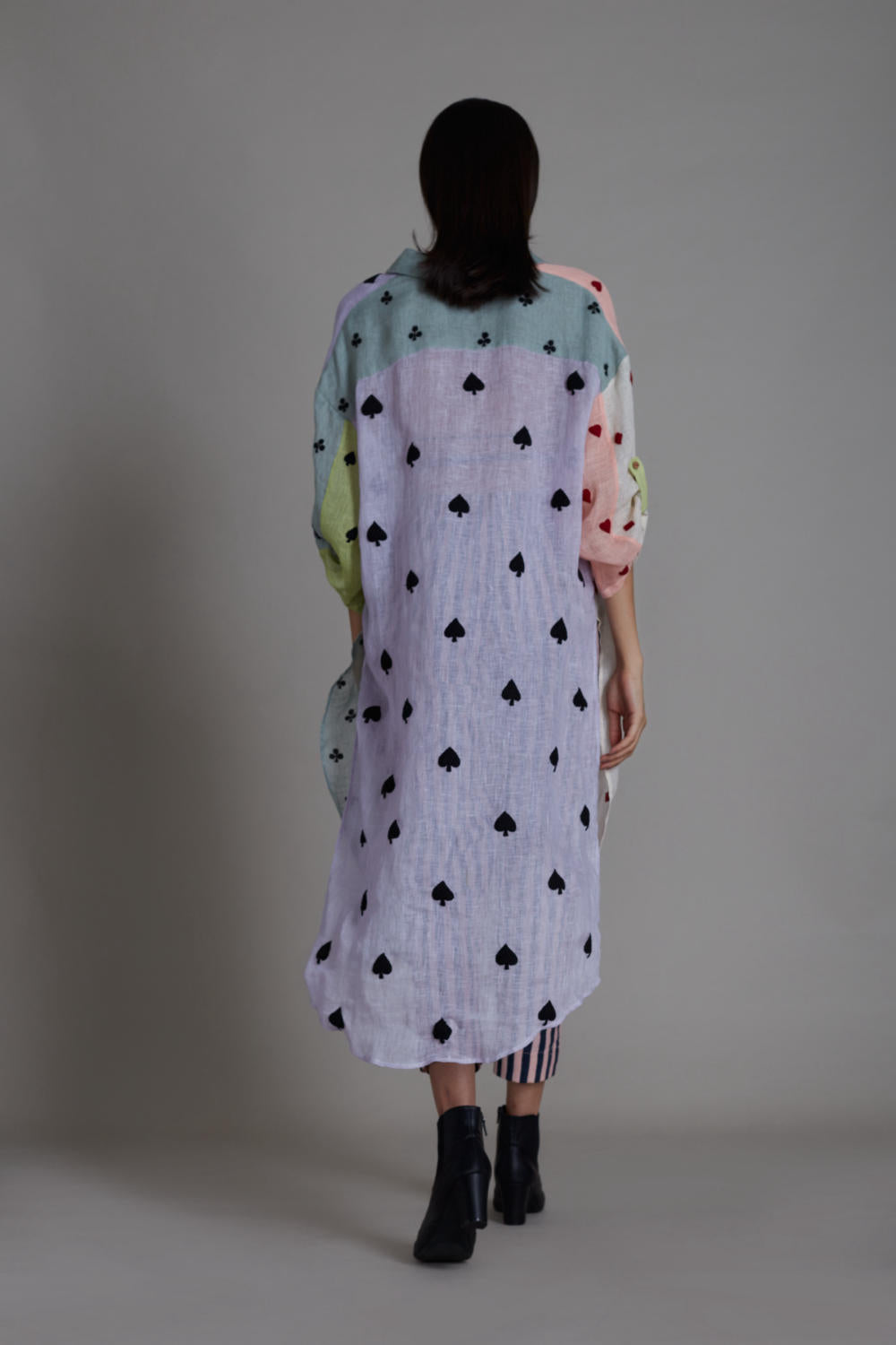 This colour block embroidered pure linen shirt is a perfect definition of style and ease. The v neck buttoned down detailing and the play of color is perfect for an edgy festive look. This set comes with well fitted striped pants which are elasticated at the back.