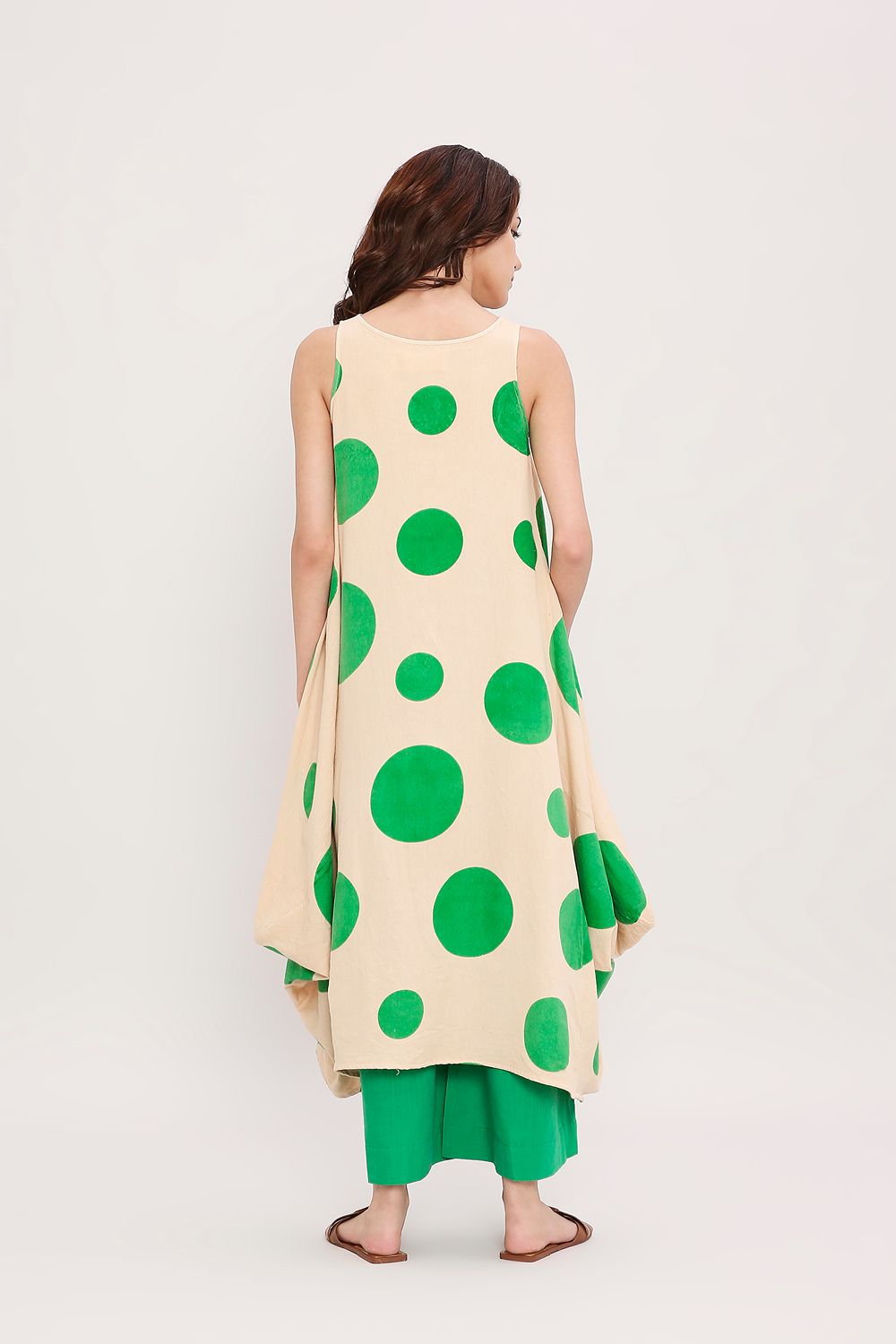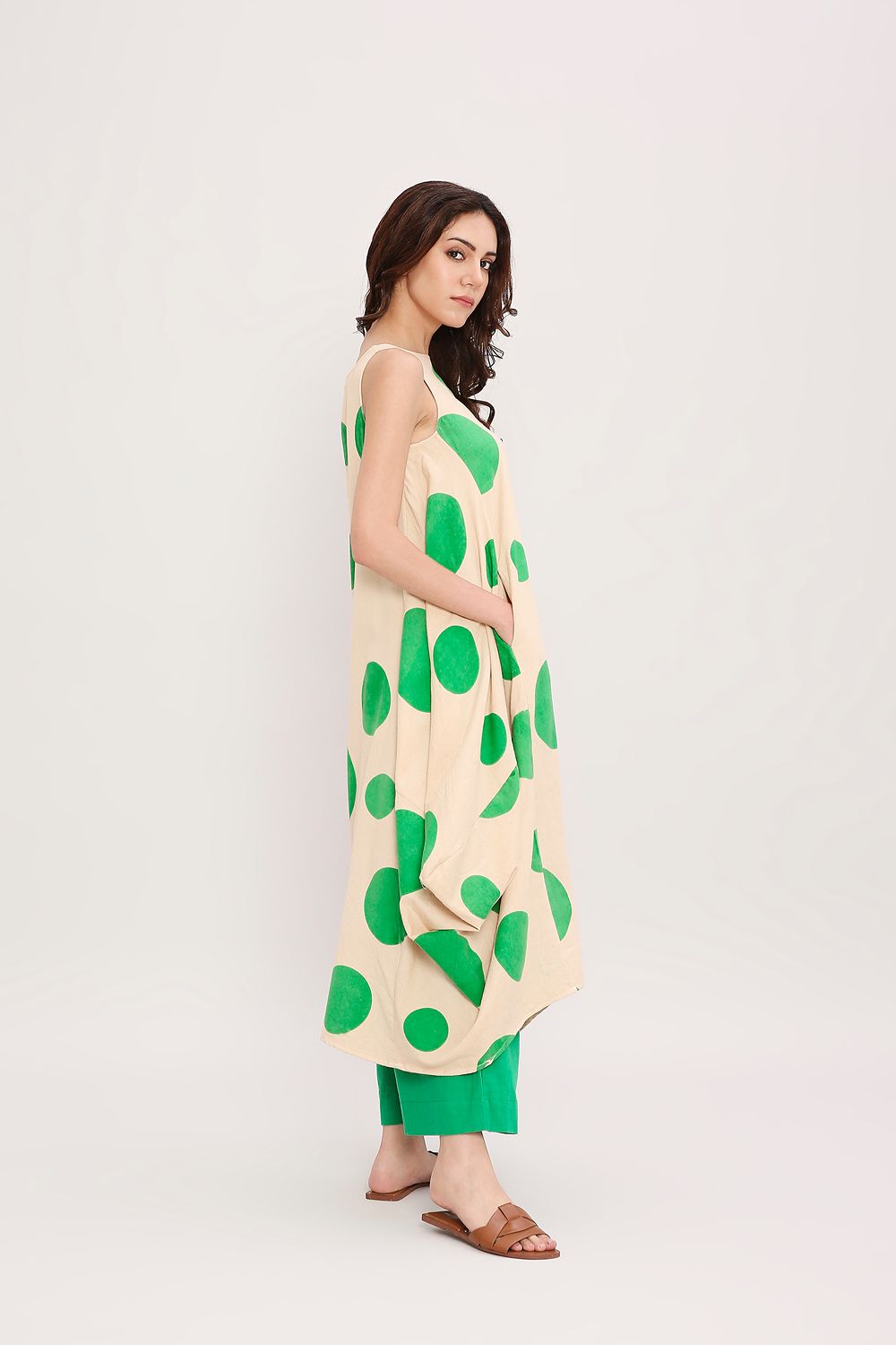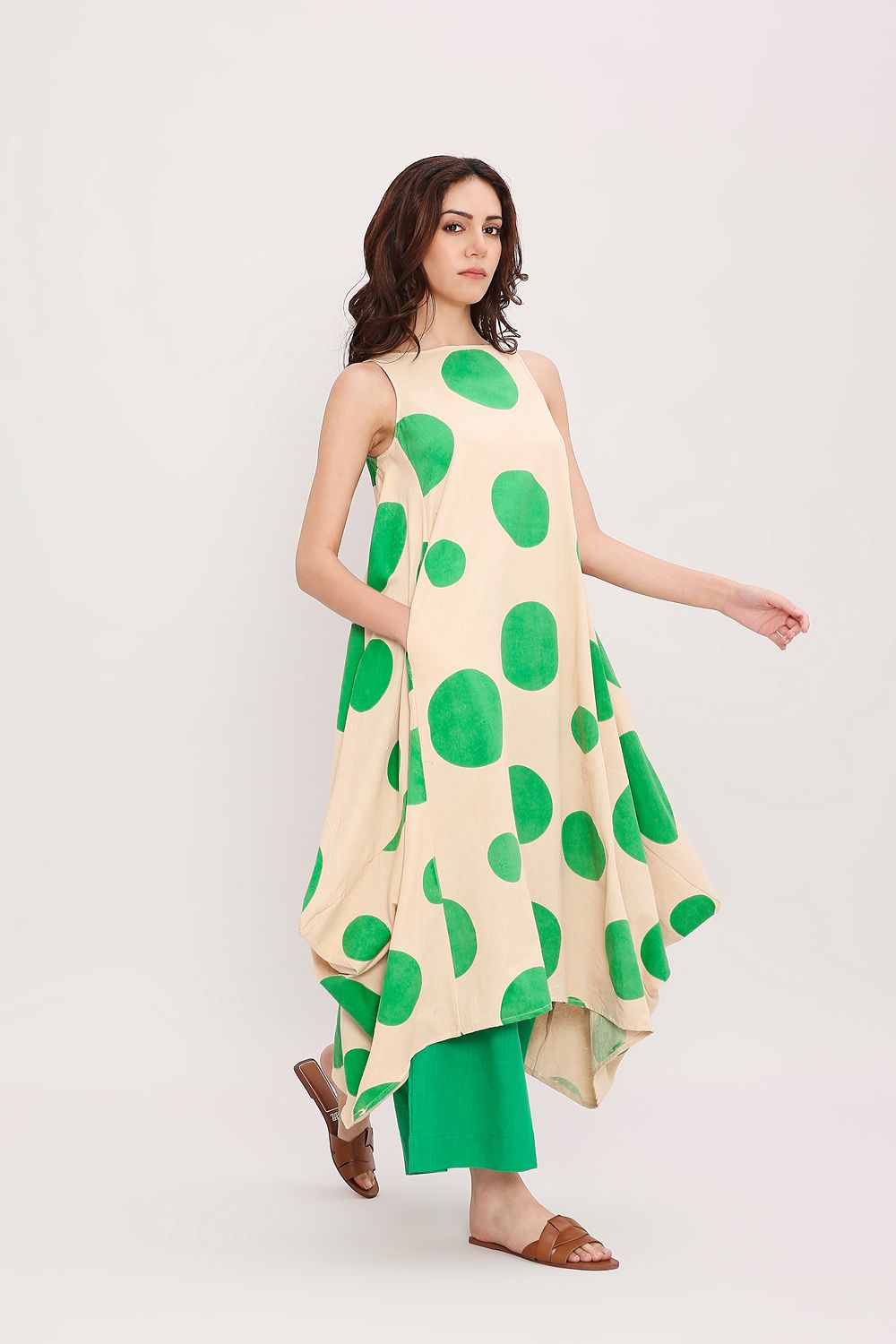 Our classic side cowl dress with a boat neckline makes a subtle yet striking statement, featuring handblocked polka dots all over. A perfect blend of effortless drape and playful detailing, styled here with matching pants for a coordinated and contemporary look.