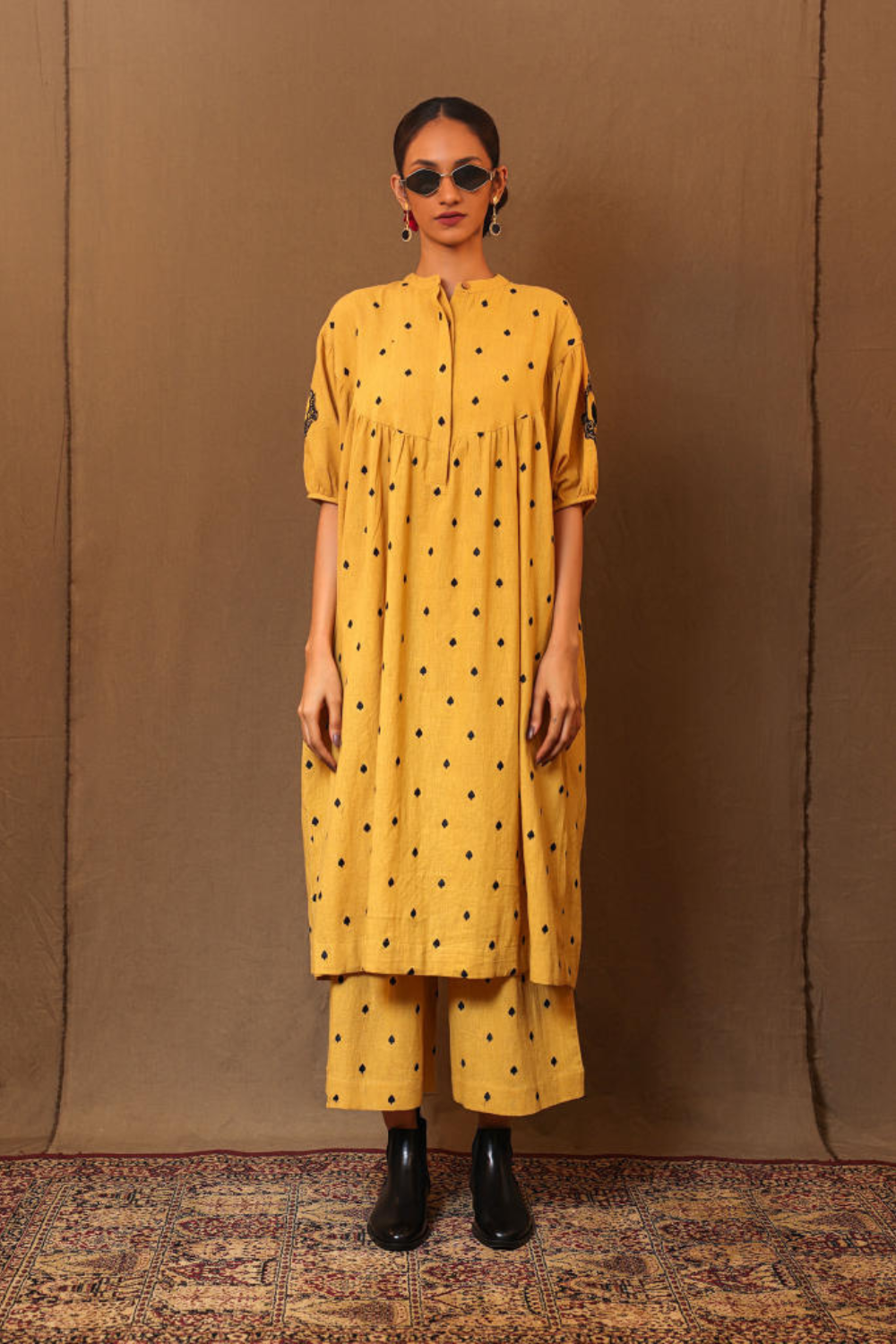 Anti-fit tunic hand-embroidered on handspun kala cotton with front opening and side pockets. Comes with RE pants to complete the look (Set of 2).