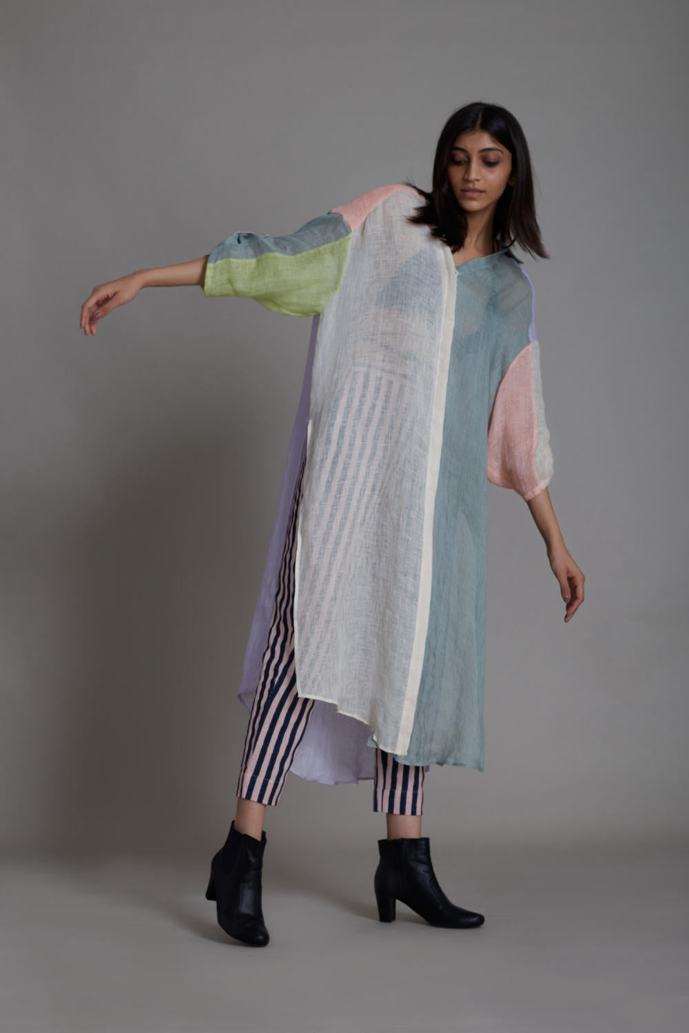 This Colour block pure linen shirt is a perfect definition of style and ease. The v-neck button detailing and the play of color are perfect for an edgy festive look. Wear it with your denim or get our stripe pants from the collection to complete the look. Handwoven cotton black bralette inner comes with the set.