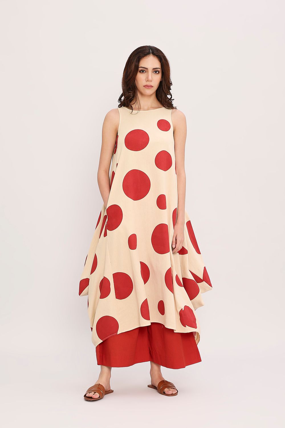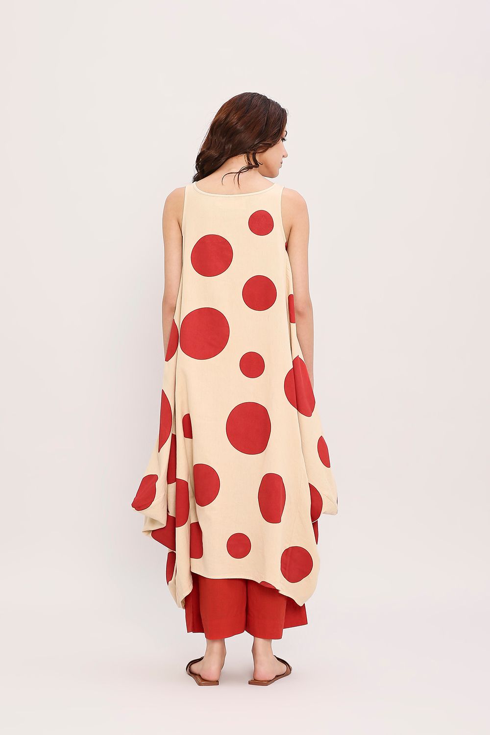 Our classic side cowl dress with a boat neckline makes a subtle yet striking statement, featuring handblocked polka dots all over. A perfect blend of effortless drape and playful detailing, styled here with matching pants for a coordinated and contemporary look.