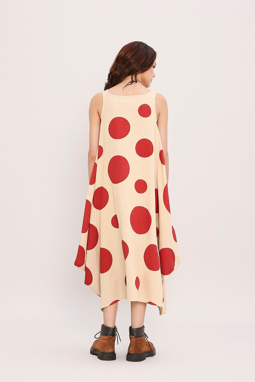 Our classic side cowl dress with a boat neckline makes a subtle yet striking statement, featuring handblocked polka dots all over. A perfect blend of effortless drape and playful detailing.