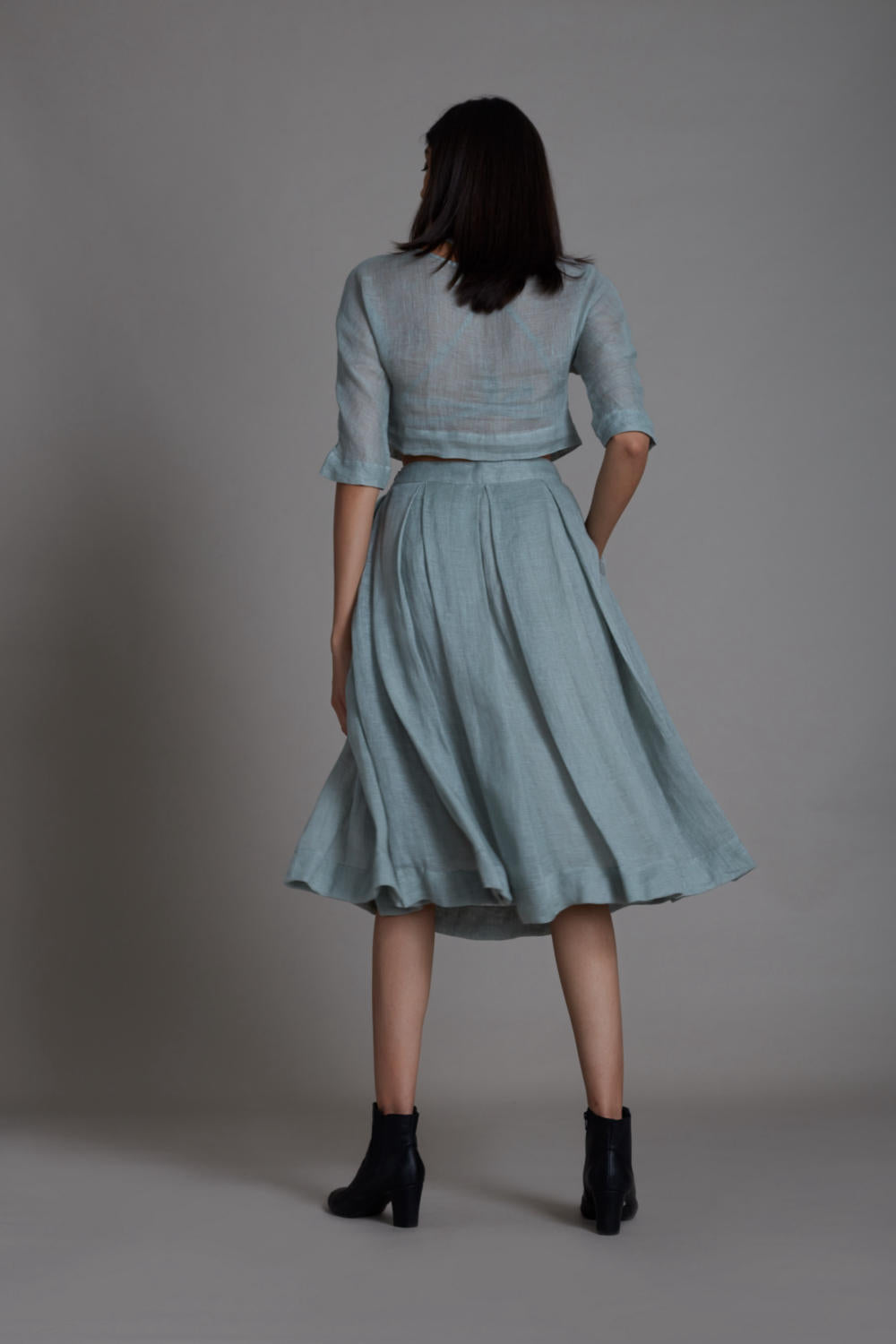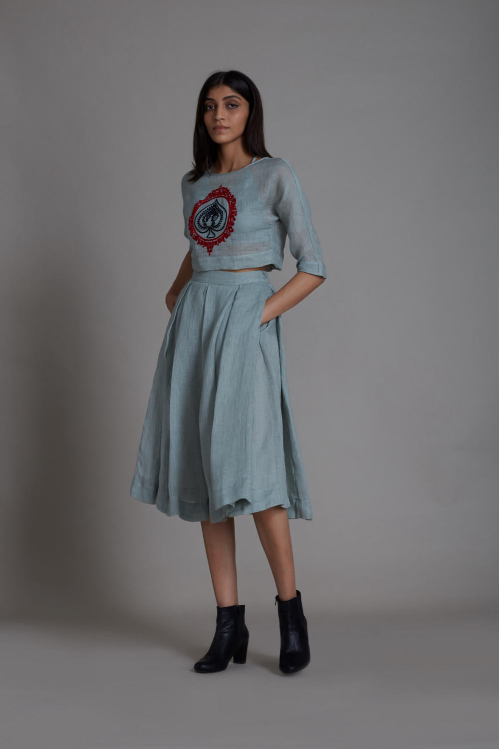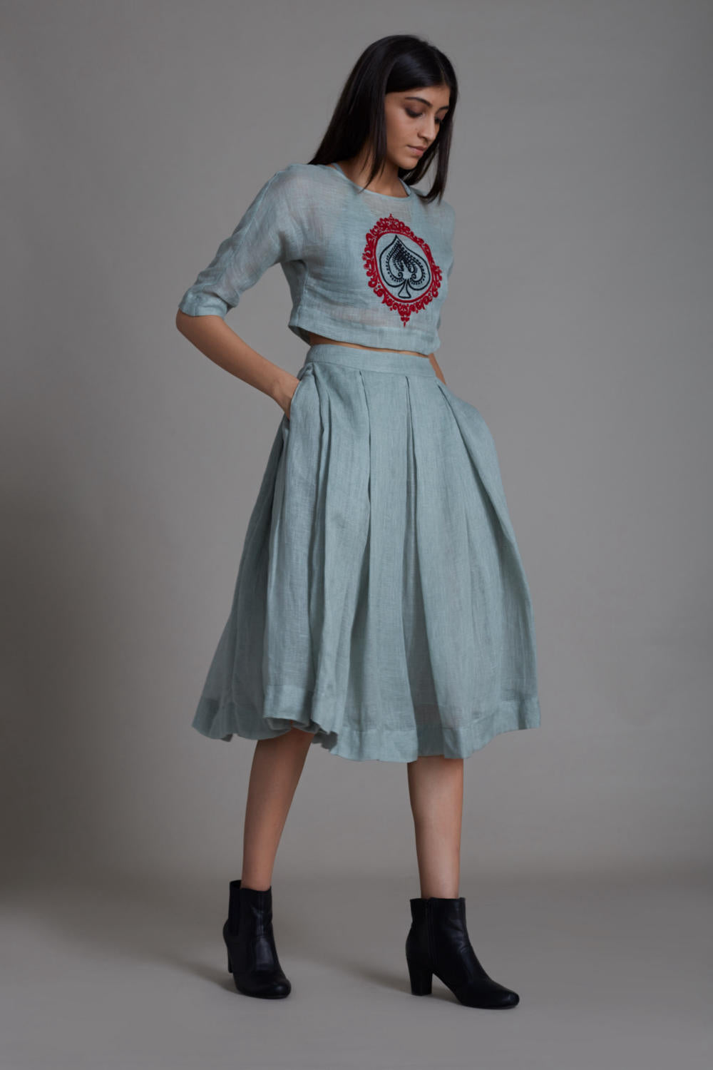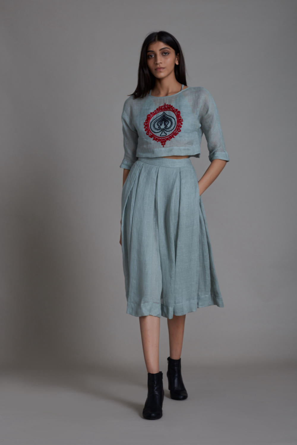 This set features a rich pure linen skirt and a hand embroidered crop top. The top comes with the handwoven bralette as an inner. Swap your long skirt with a short skirt this festive season.(Set of 2)
