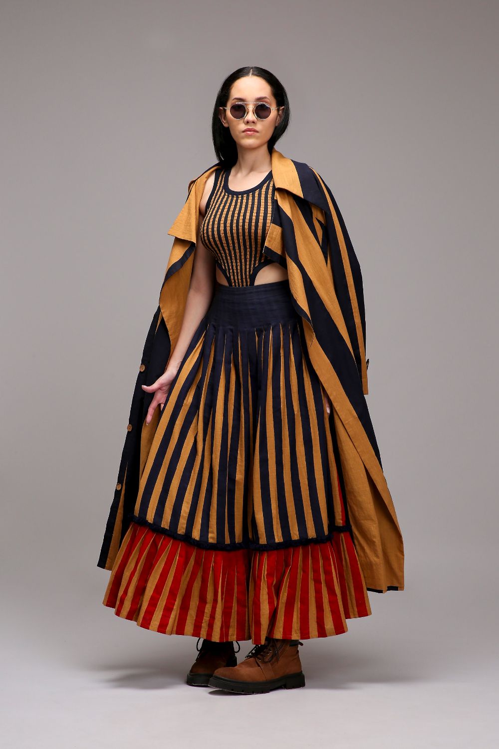 This set includes a handwoven, hand-block dual striped skirt with pleats, contrasting side pannel and a fringed hem, a fitted smocked bodysuit with ribbed detailing, and a joker jacket featuring bold joker embroidery, button details, and a back slit. A modern look with artisanal charm.