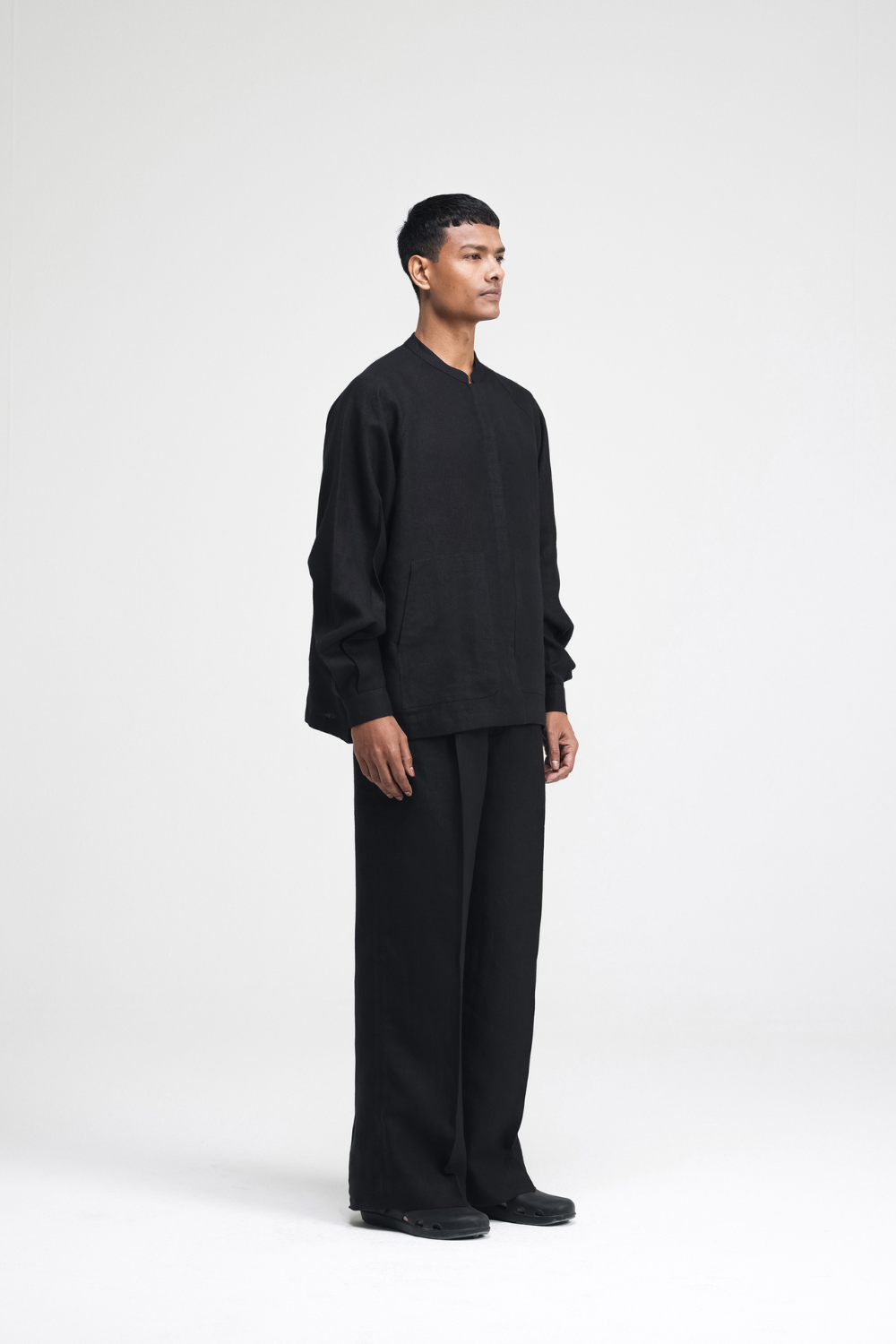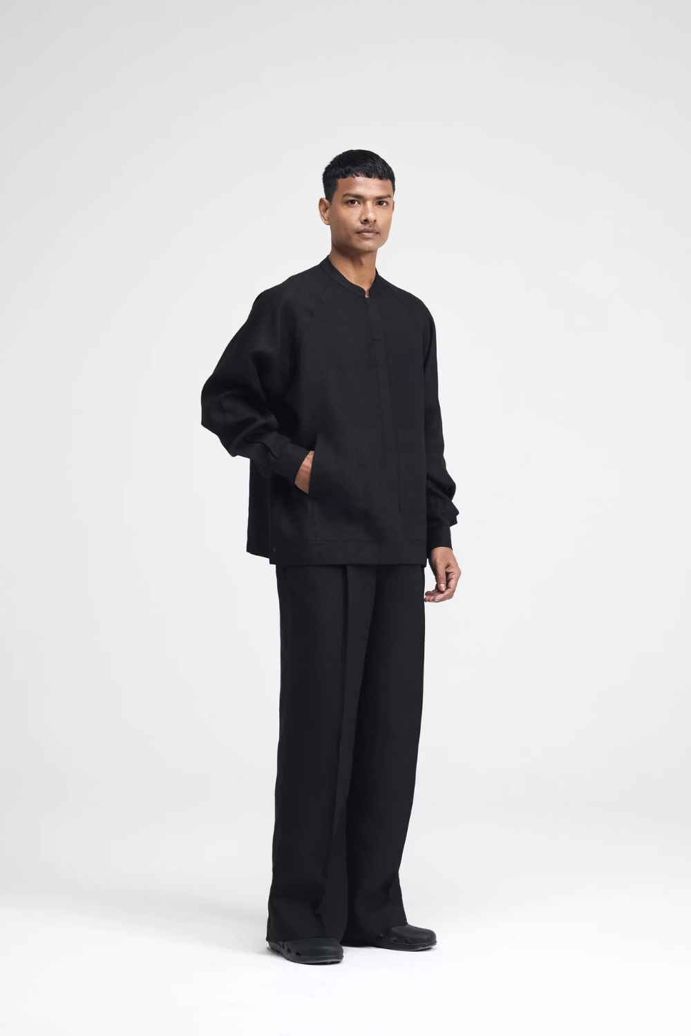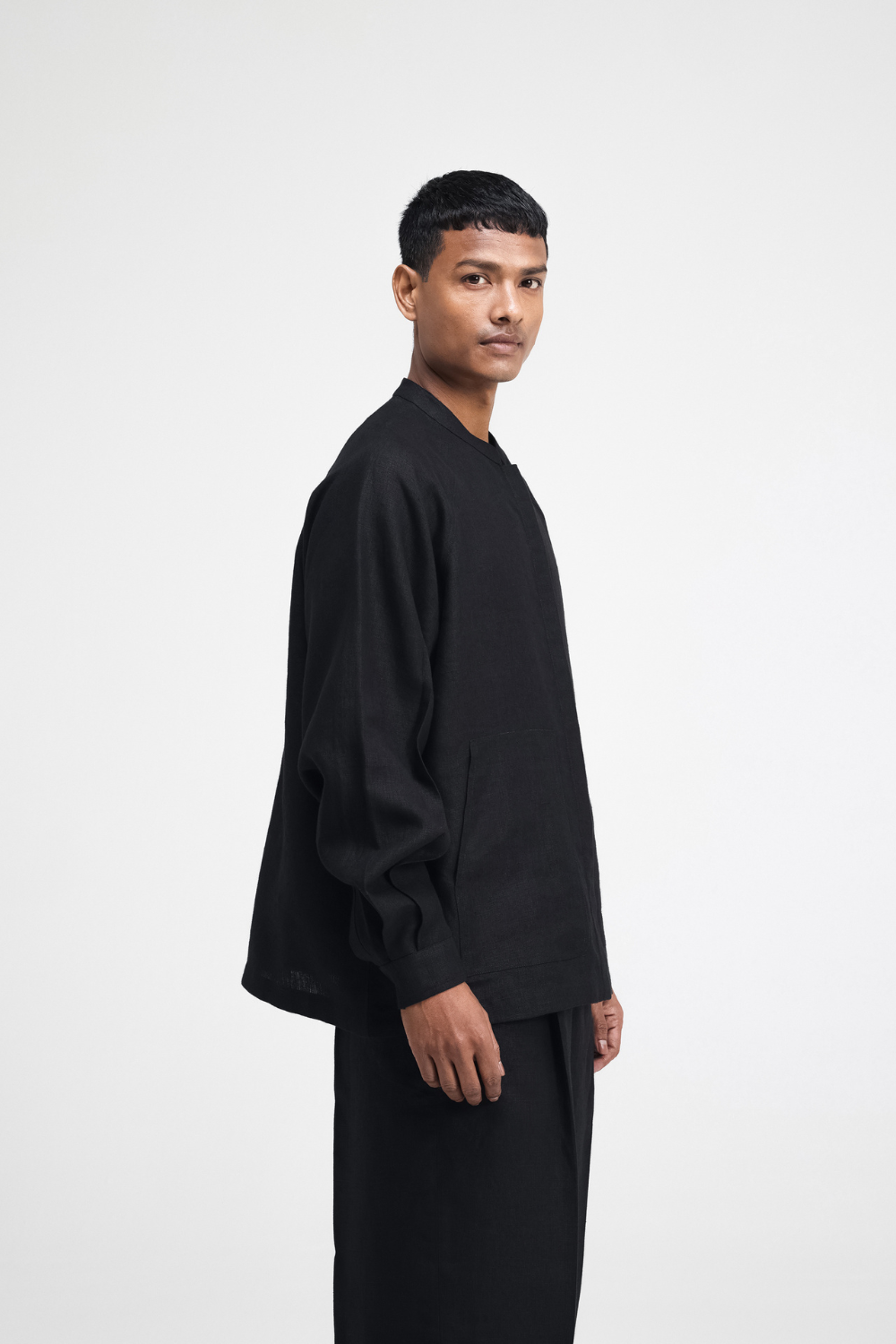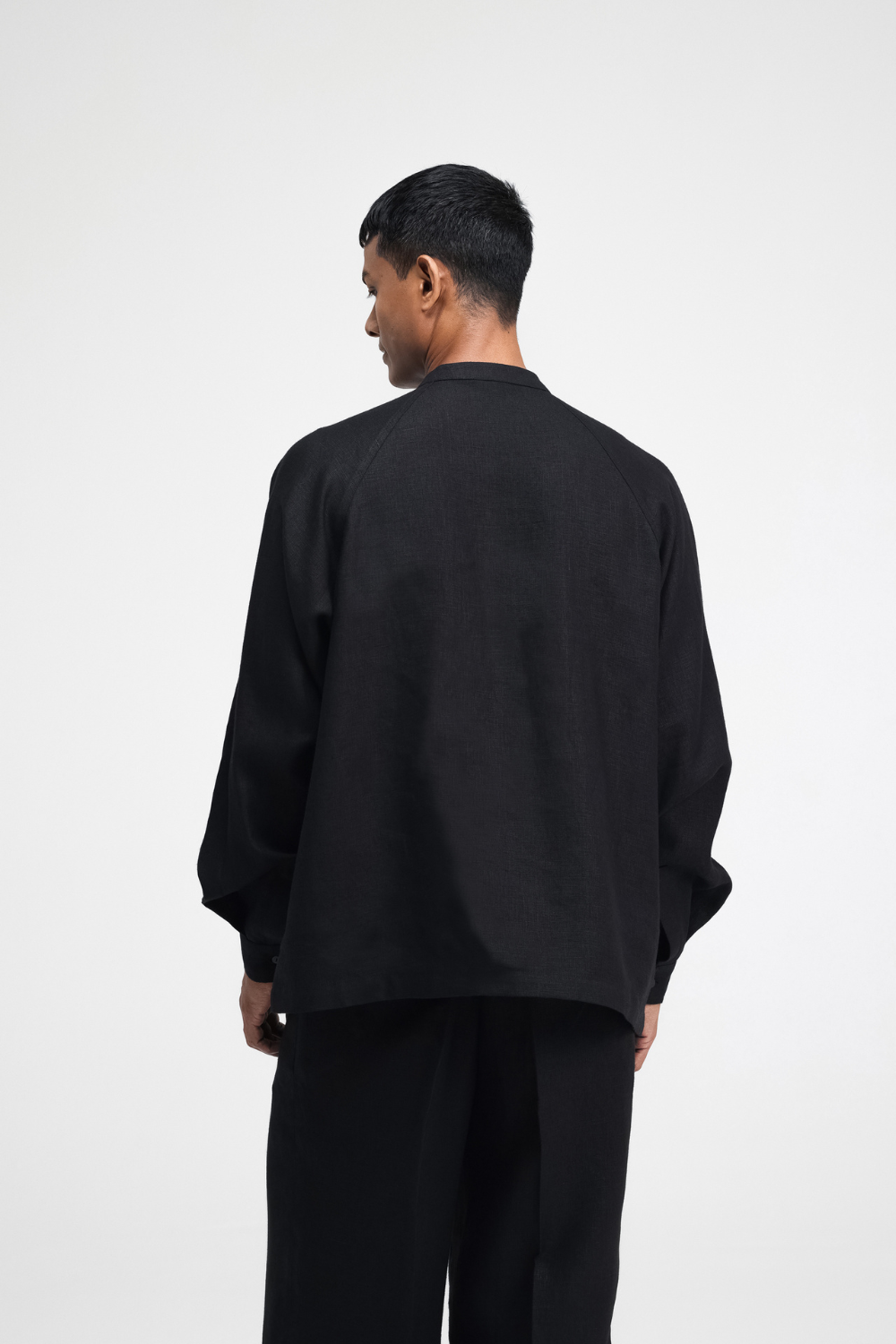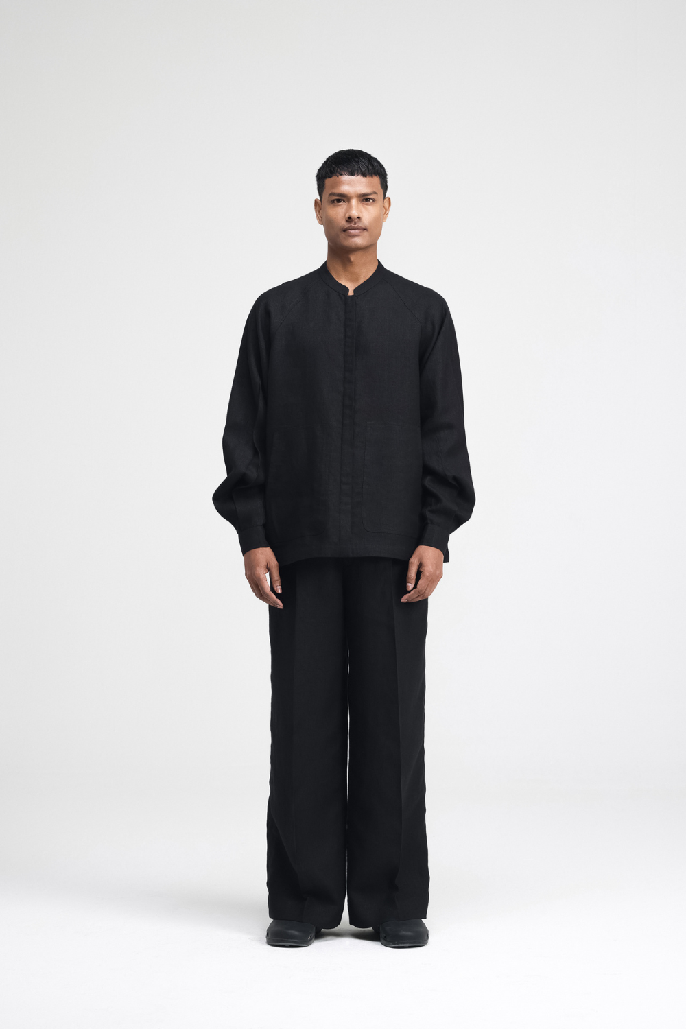 The Cali Raglan linen shirt features a band collar and a concealed placket. It has gathered sleeves and functional patch pockets. A blend of relaxed style and elegance, offering a sleek silhouette. Top Comes in Size: ONE (2XS,XS,S), TWO (M,L,XL), THREE (2XL,3XL,4XL)
