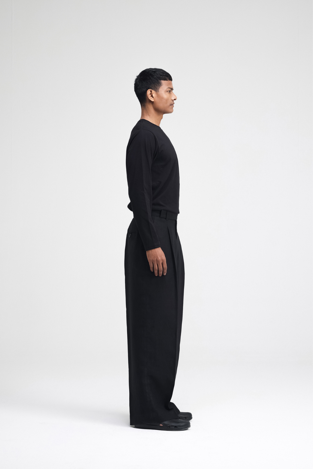 Tailored straight-leg linen pants featuring an extended waistband along with a fly zip and button closure. Designed with back darts and a front pleat for a structured yet comfortable fit, it’s perfect for elevated everyday wear.