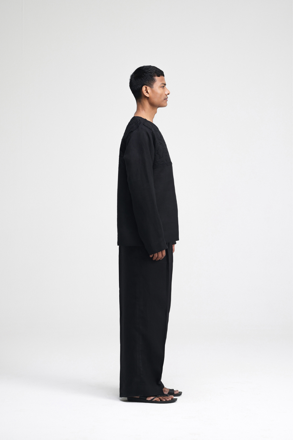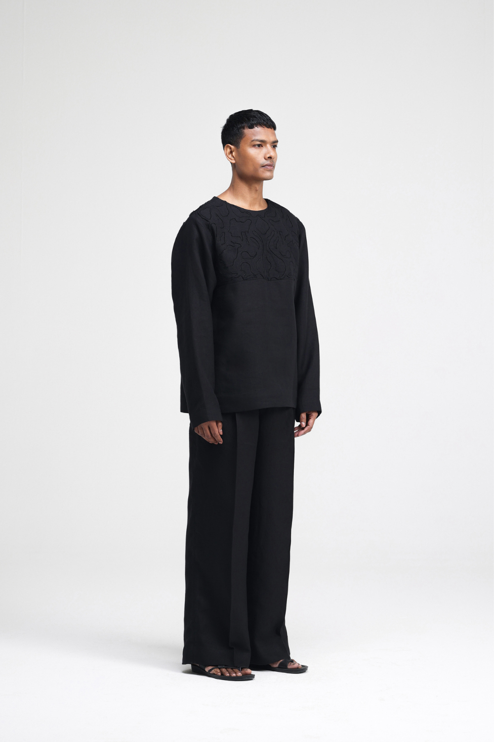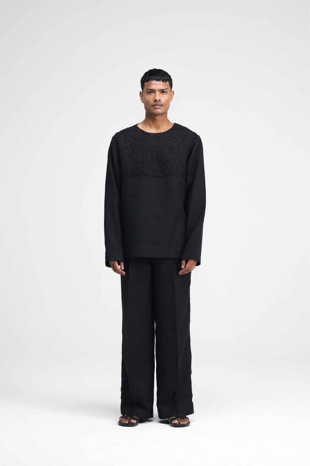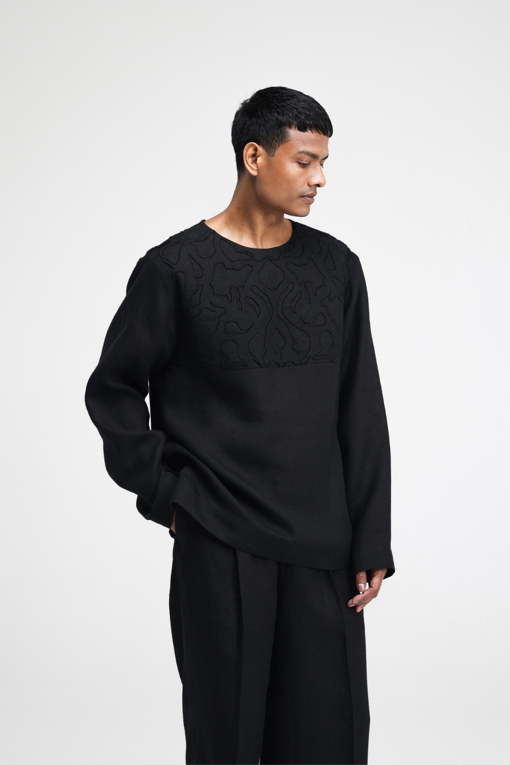 Our Saril Top is relaxed-fit linen top with a round neck and full sleeves, accented by unique applique embroidery on the yoke. Featuring side slits for added movement and an easy button closure on the shoulder, this piece is a wardrobe staple.