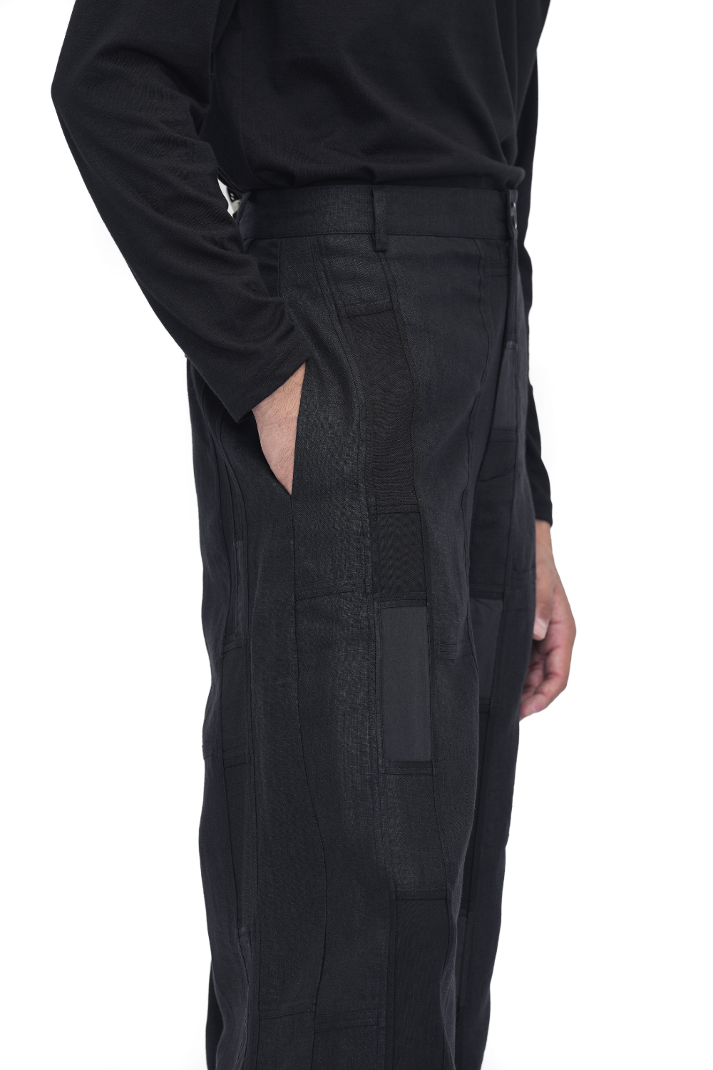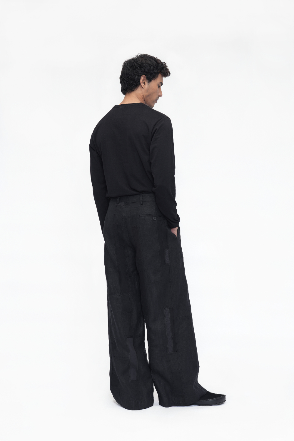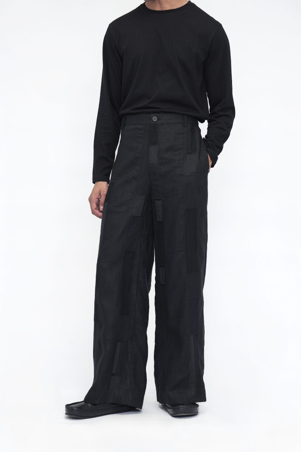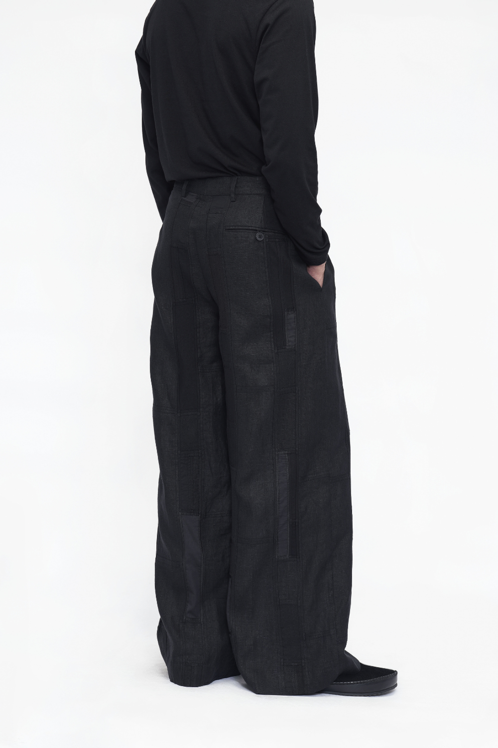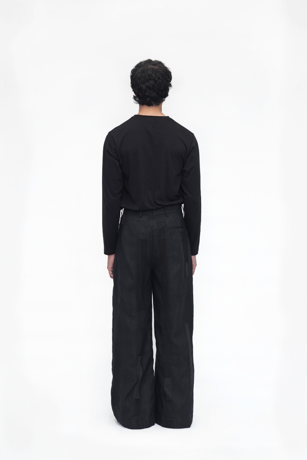 Straight-fit trousers with an all-around waistband, side seam pockets, and a single back welt pocket. Tailored with back darts and a front fly zipper for a clean finish. Cut in a patchwork of archived textiles—each panel assembled from linen, cotton, and silk blends for rich texture and character.