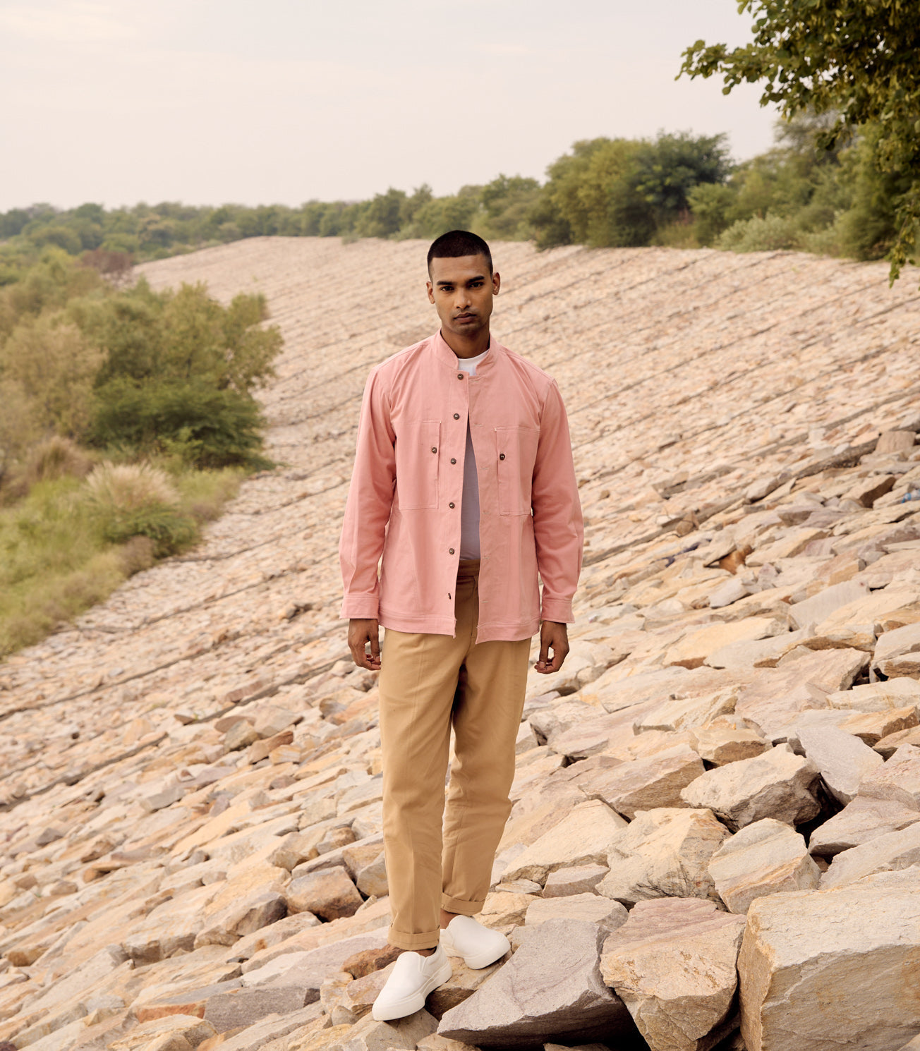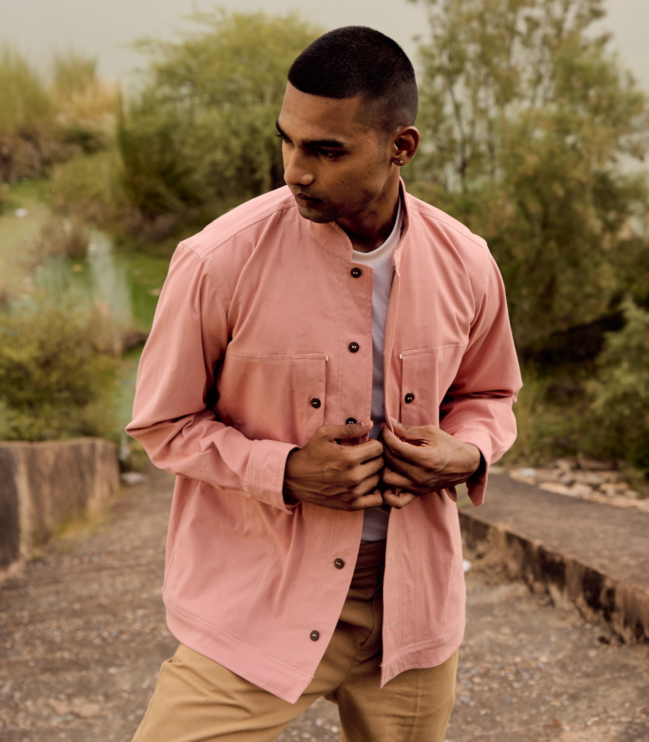 A peach pink twill jacket with mandarin collar, button cuff opening, full sleeves and two front patch pockets with button detailing.