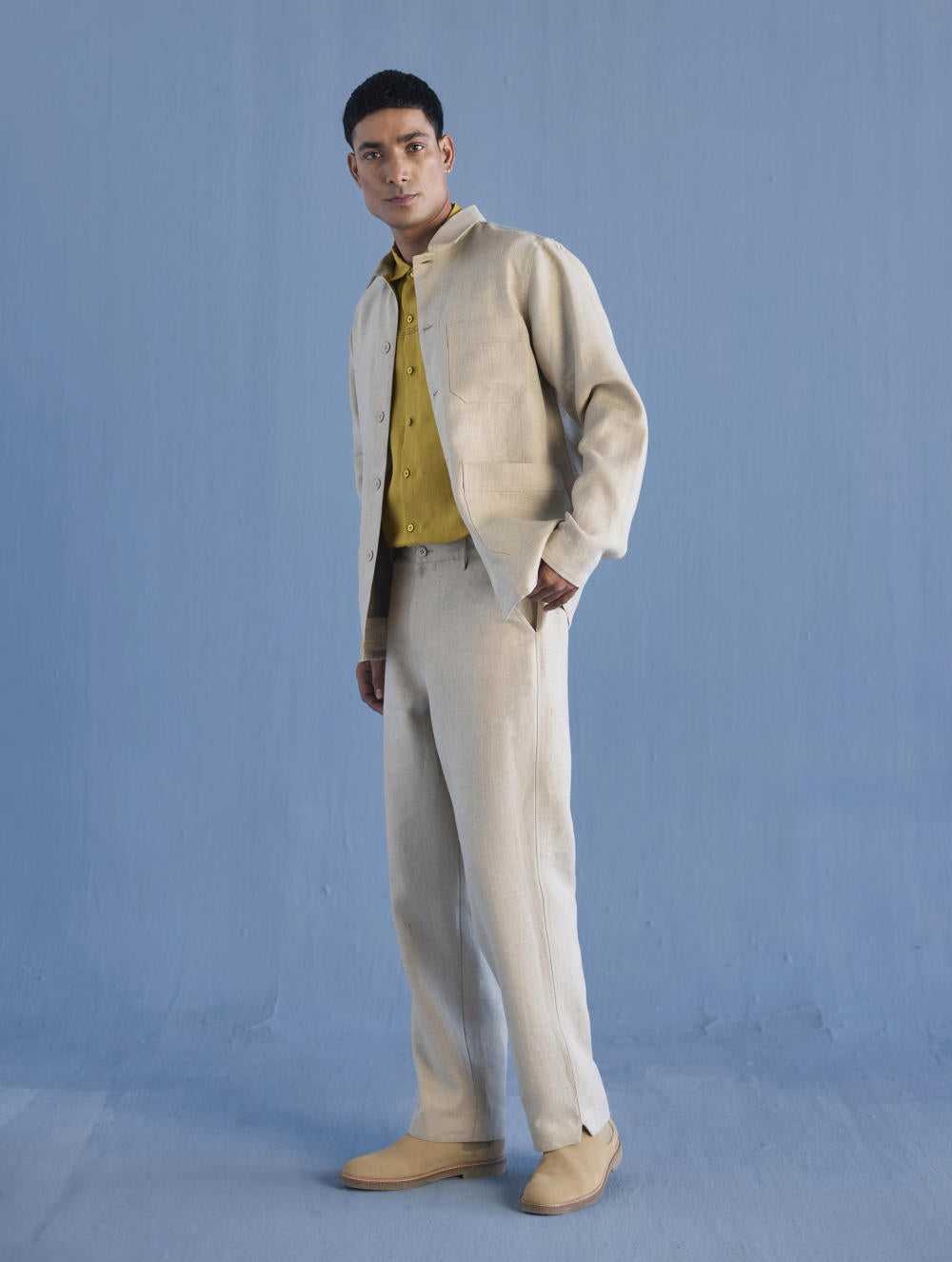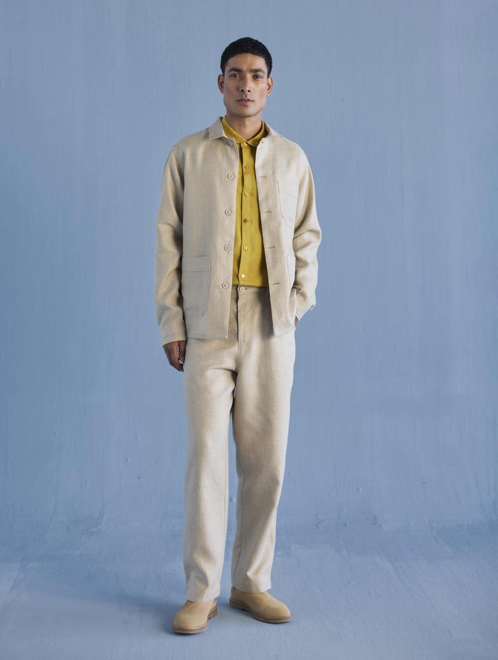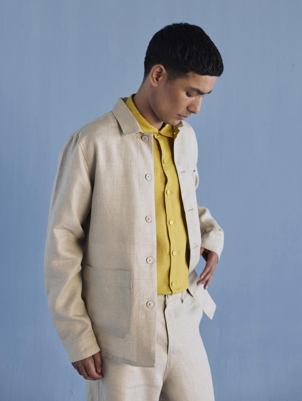 A classic shirt jacket in a heavy weight twill weave yarn-dyed linen with statement pockets finished with hand-dyed buttons and contrast floral printed facing inside. The Ansh Linen Jacket has a hidden pocket on the inside. One of our favourite jackets to wear from the spring to early winters.