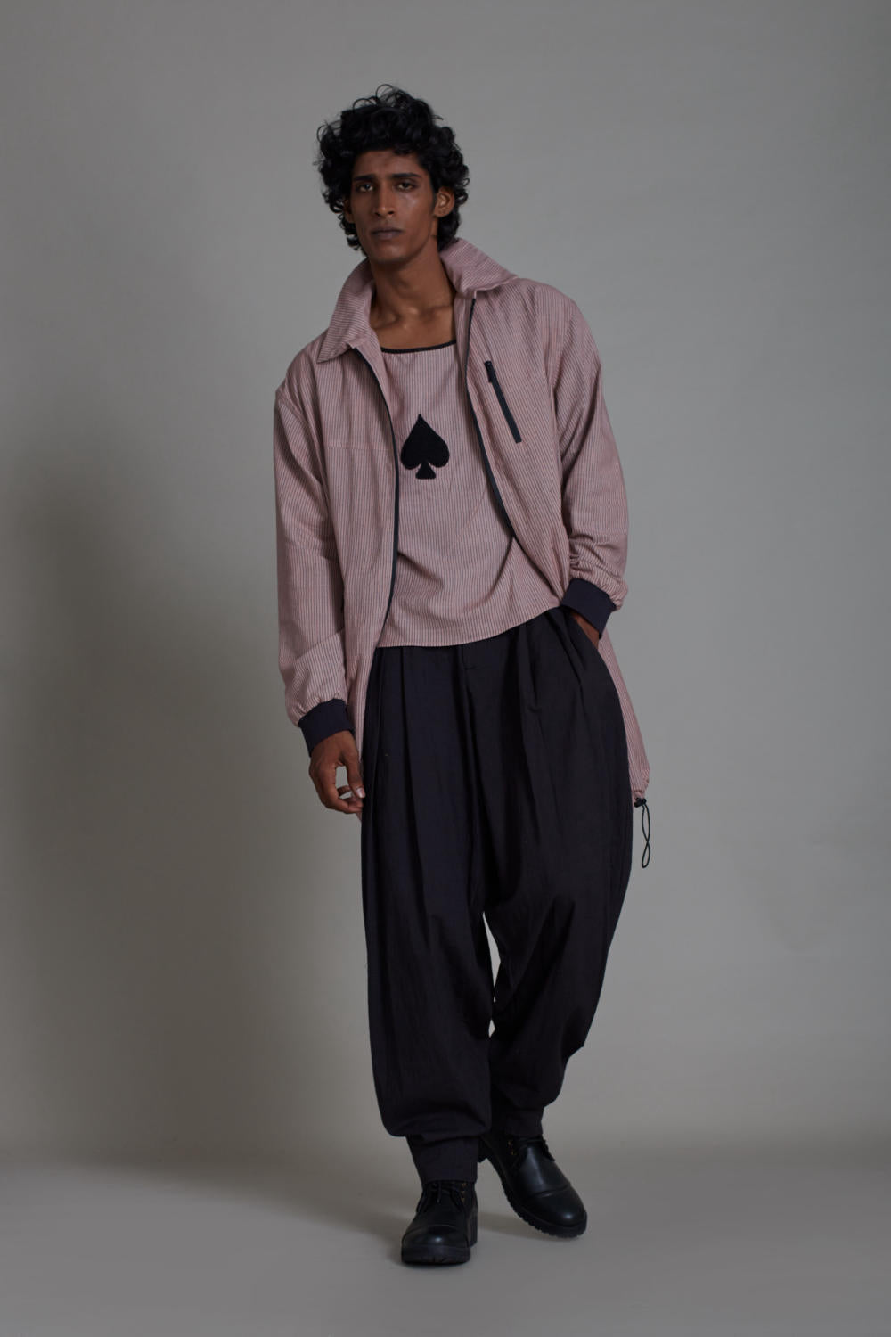 CO-ORD SET: This ensemble consists of round neck embroidered tank top, relaxed fit balloon pleated pants, its breezier and comfortable with side pockets ,elasticated at the back for better fit and comfort and hand woven striped cotton jacket that features three functional front pocket . Style this outfit with boots and hit the road in style!!(set of 3)