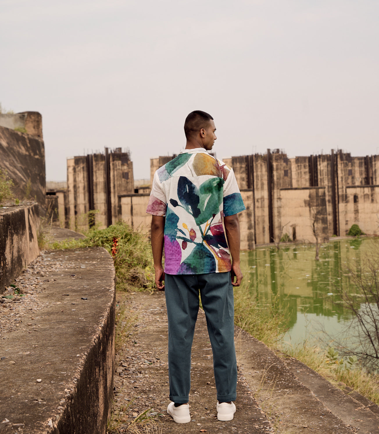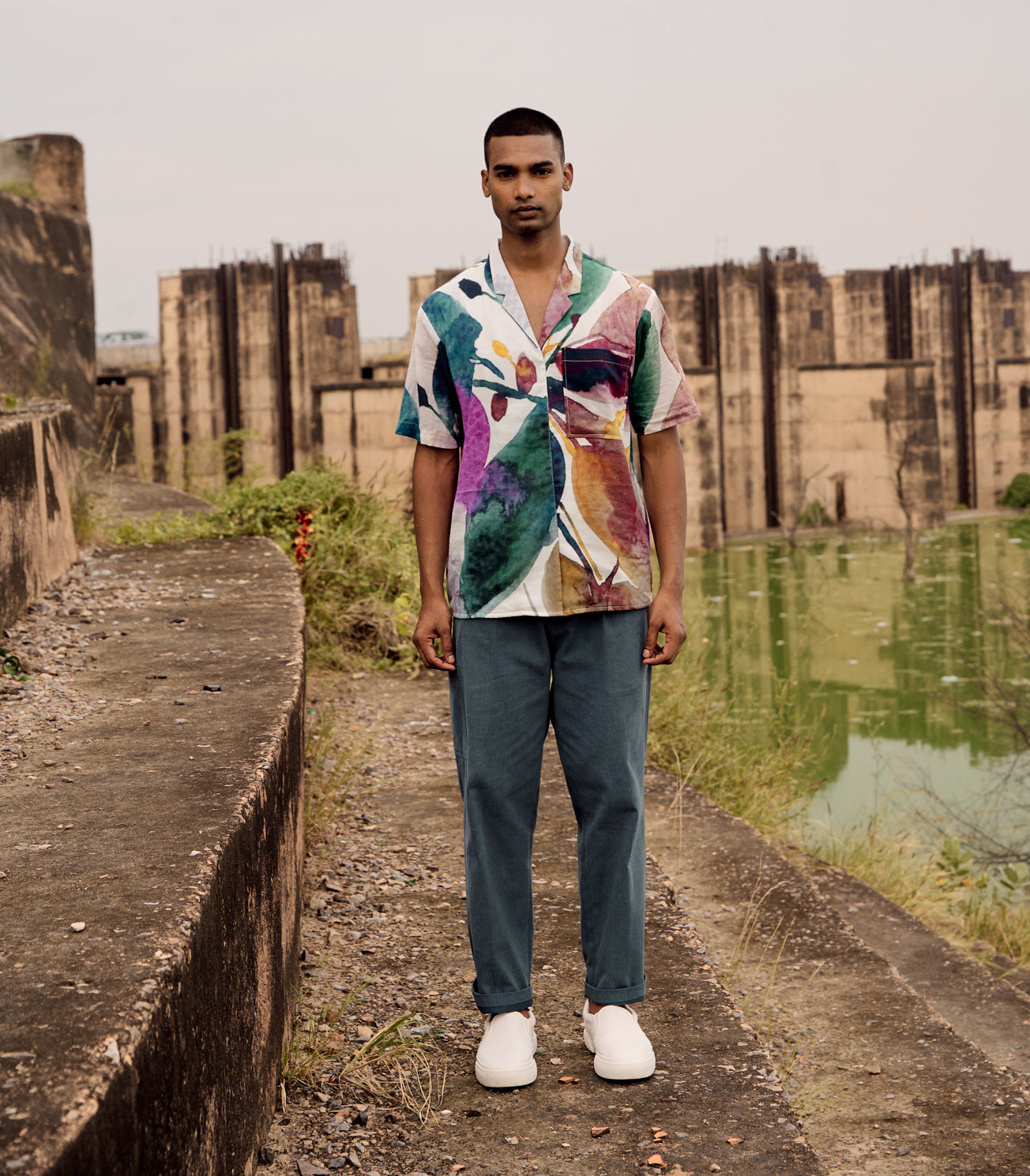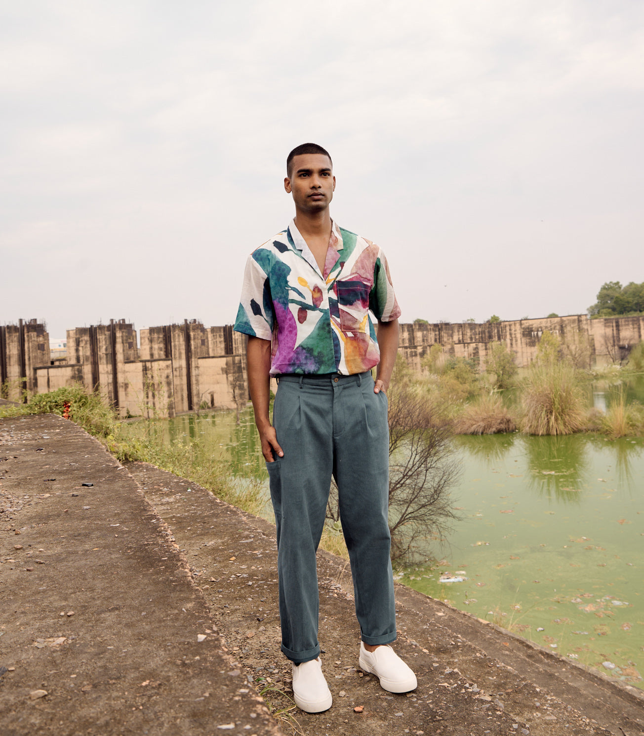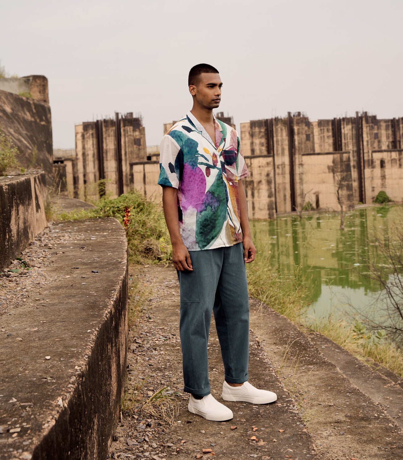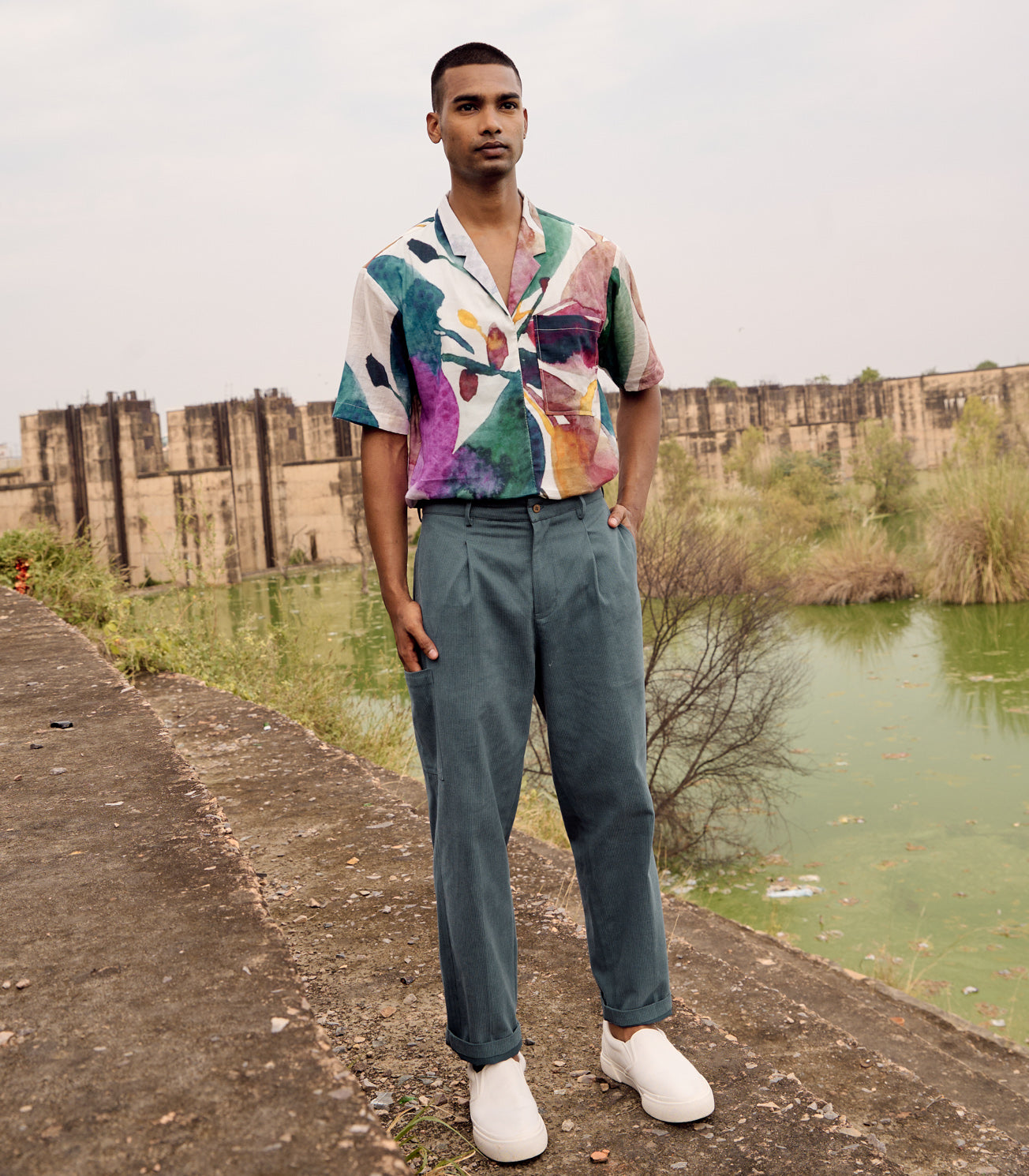 A blue twill trousers with pleat detailing, side seam pockets and side patch pocket.