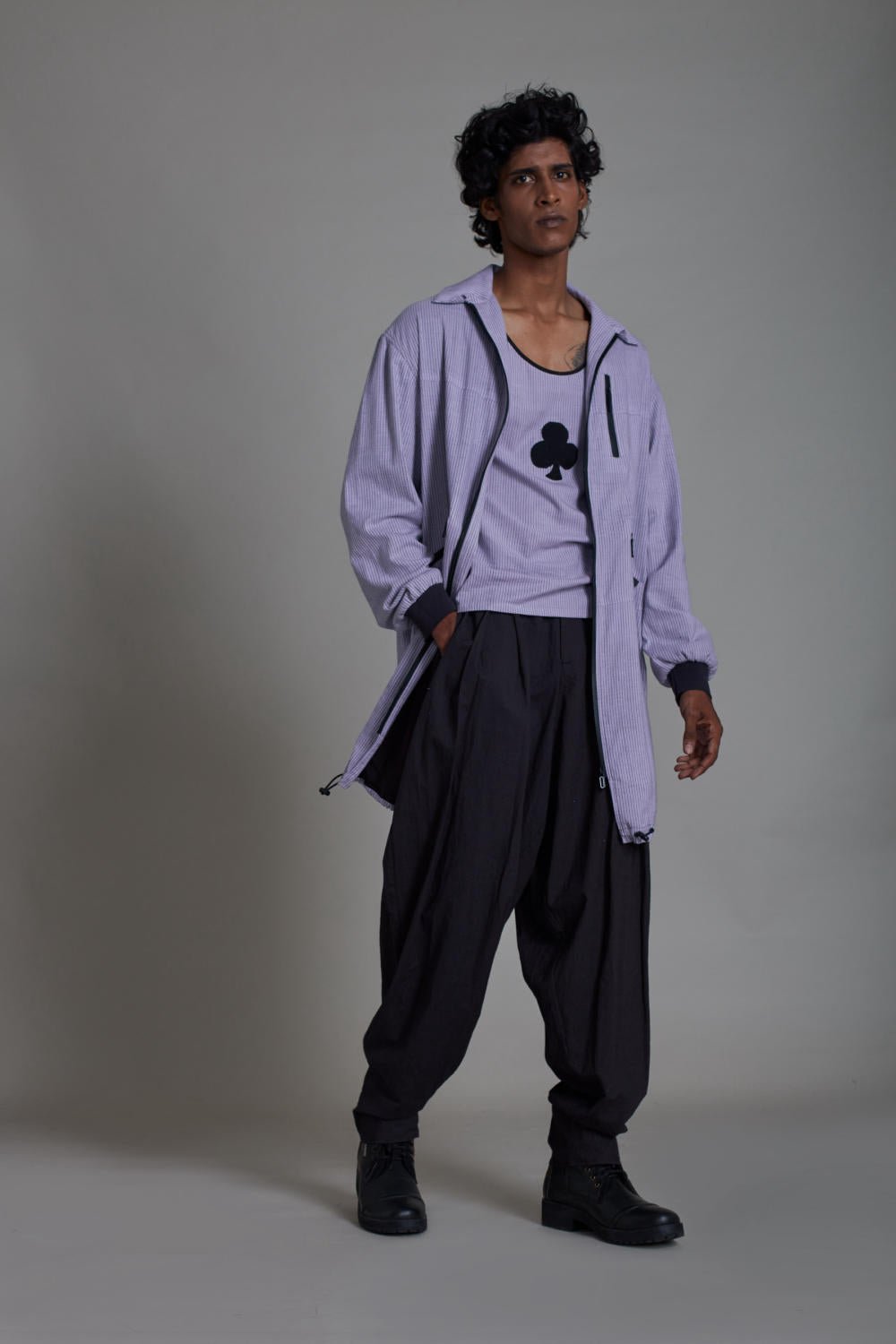 CO-ORD SET: This ensemble consists of round neck embroidered tank top, relaxed fit balloon pleated pants, its breezier and comfortable with side pockets ,elasticated at the back for better fit and comfort and hand woven striped cotton jacket that features three functional front pocket . Style this outfit with boots and hit the road in style!!(set of 3)