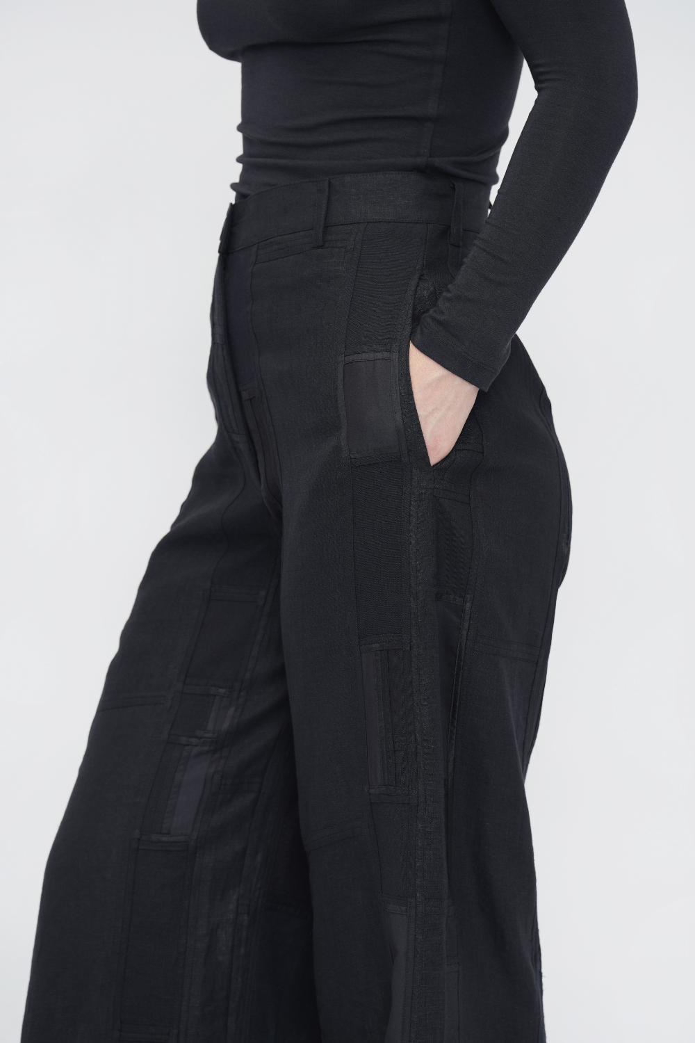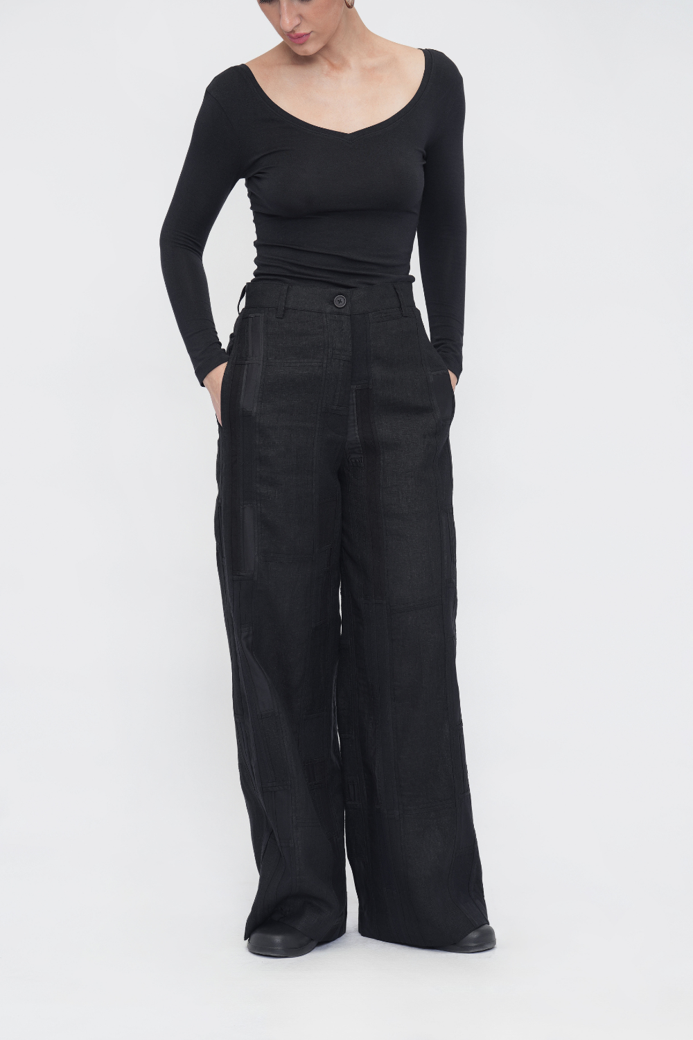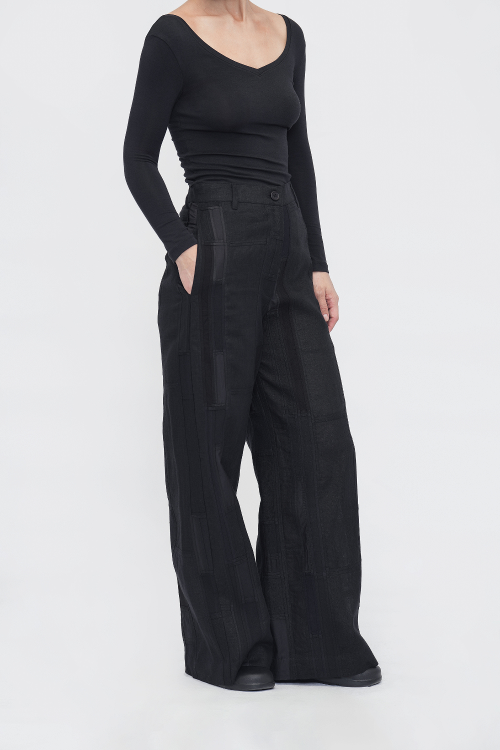 Straight-fit trousers with an all-around waistband, back darts for shaping, and practical side seam pockets. Finished with a fly zipper and button closure. Crafted in breathable linen patchwork—each panel assembled from linen, cotton, and silk blends for rich texture and character.