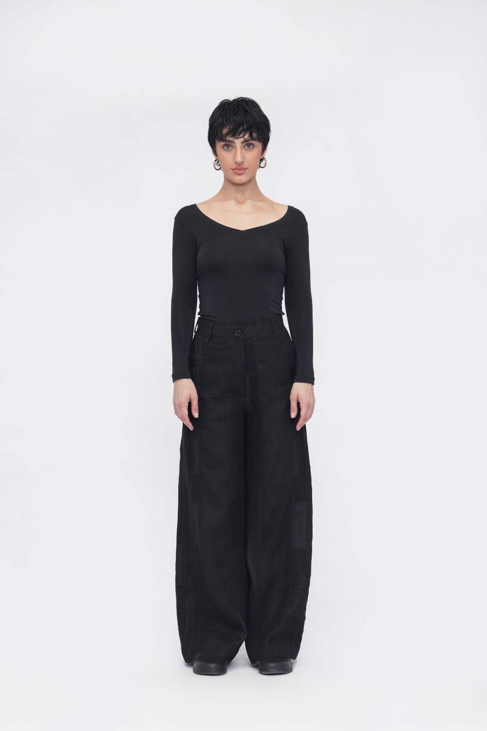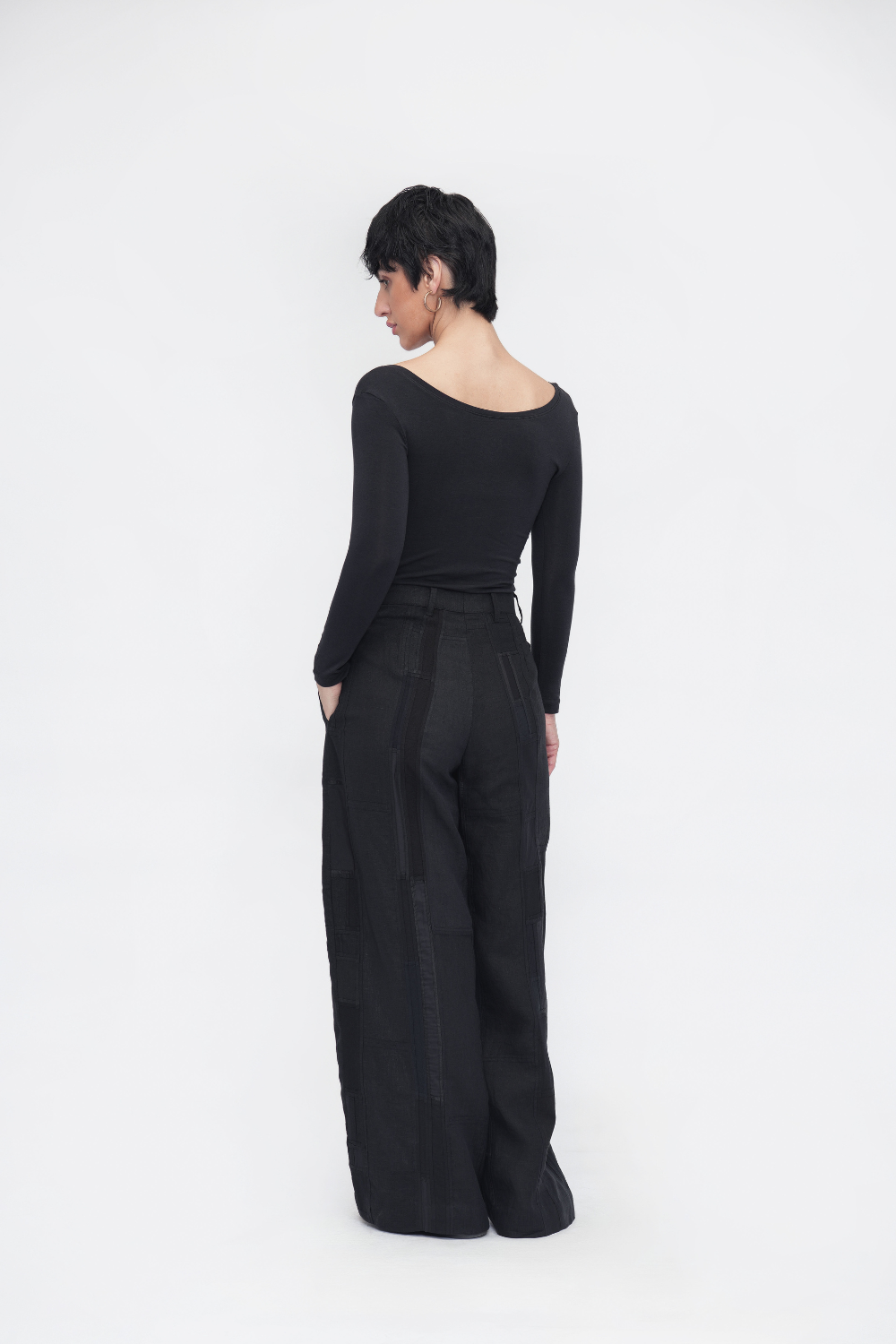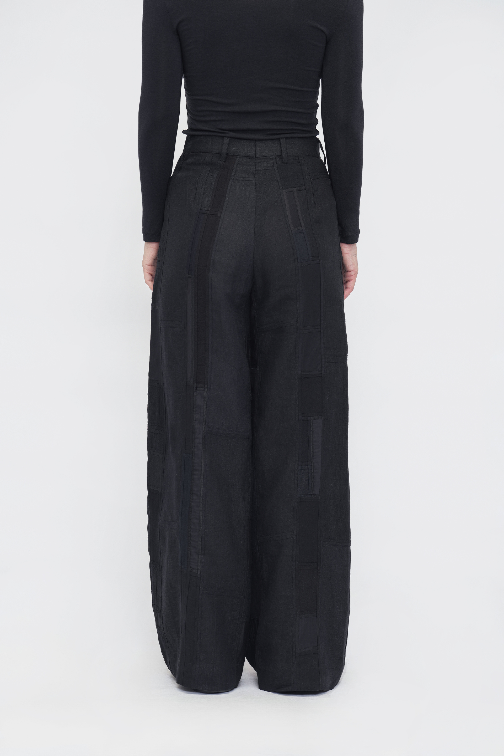 Straight-fit trousers with an all-around waistband, back darts for shaping, and practical side seam pockets. Finished with a fly zipper and button closure. Crafted in breathable linen patchwork—each panel assembled from linen, cotton, and silk blends for rich texture and character.
