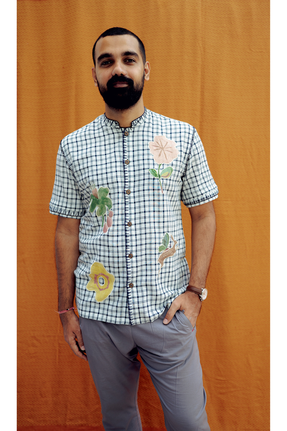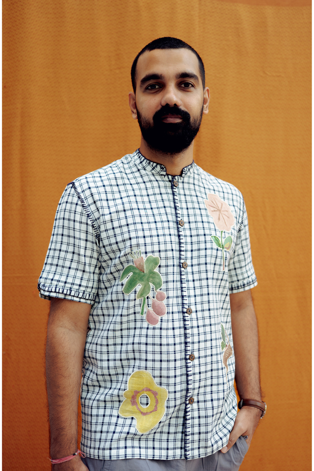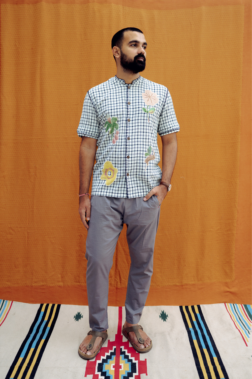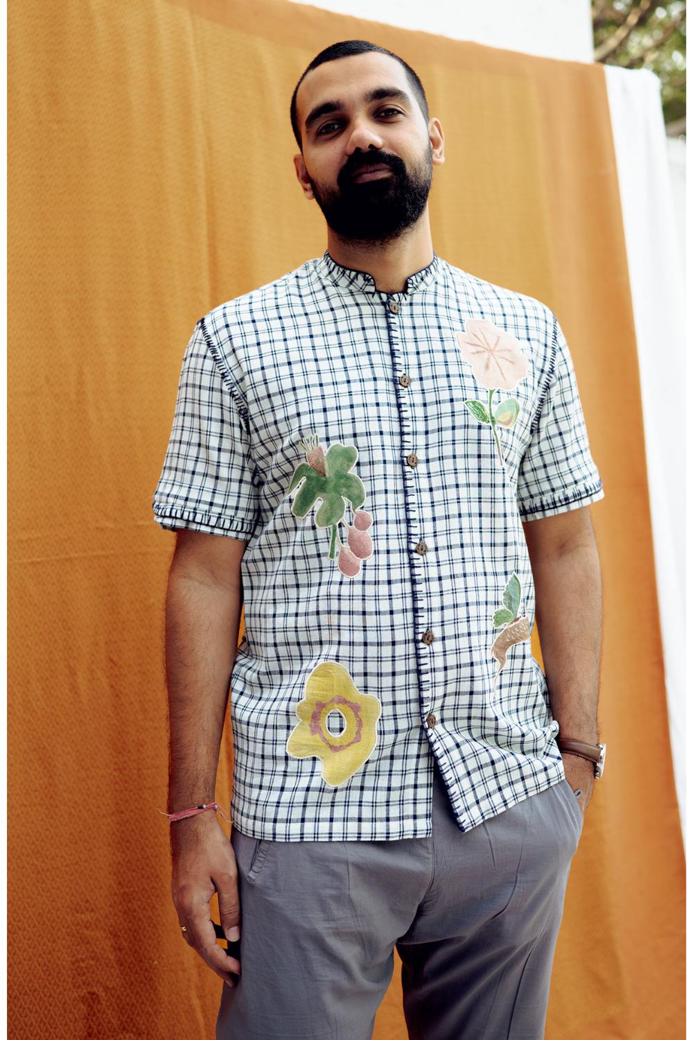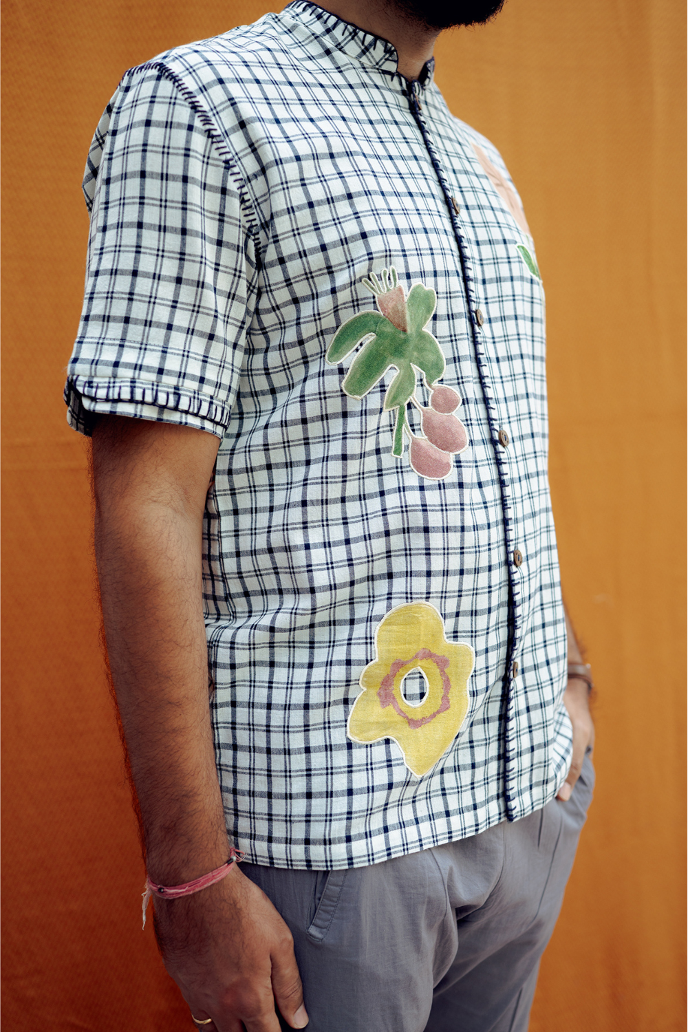 A fresh spin on classic checks. This button-down shirt features a sharp Mandarin collar, handwoven fabric, and appliqué embroidery.