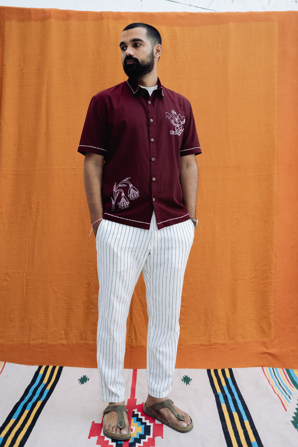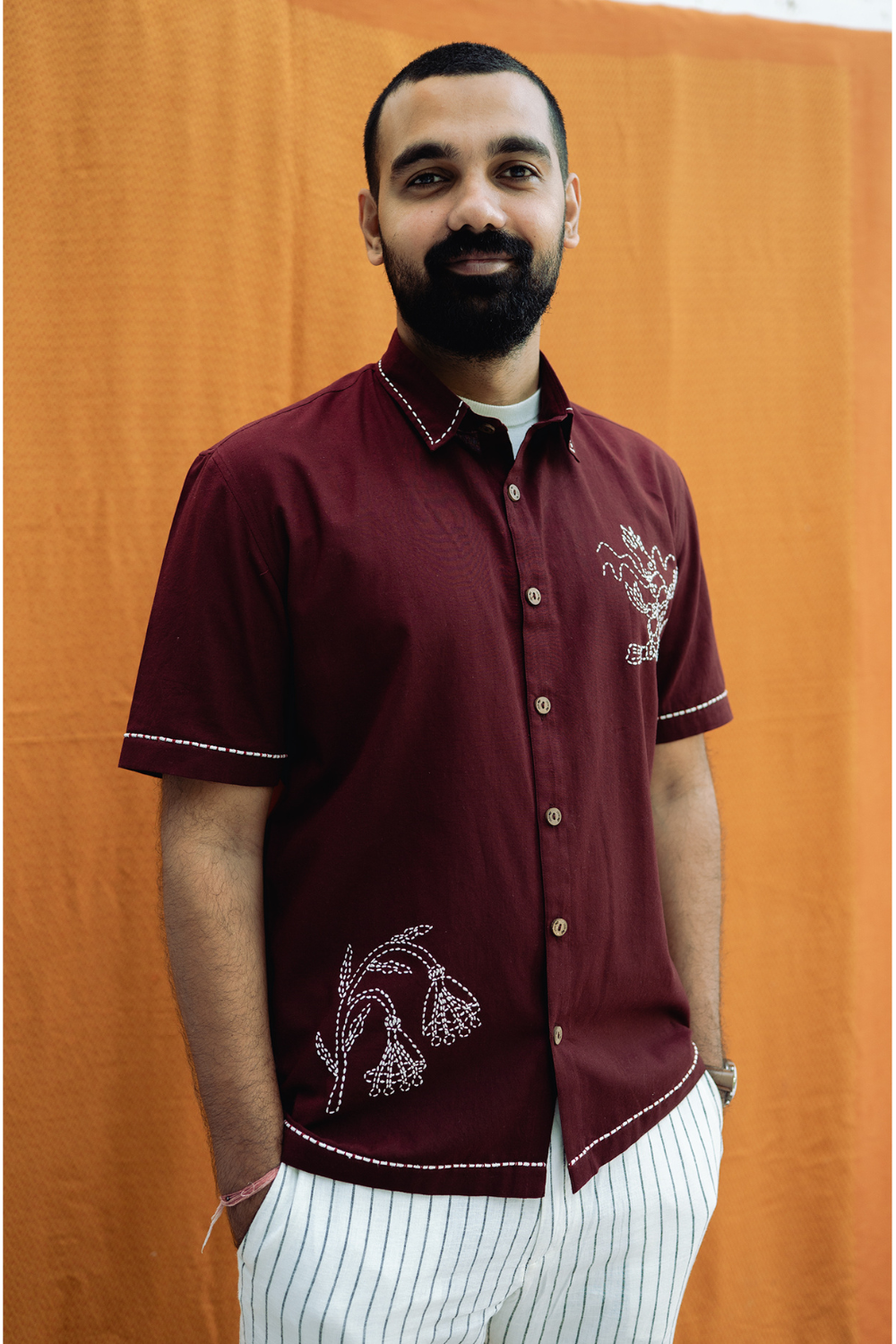 This button-down shirt is made from soft, dyed Mangalgiri cotton with drop shoulders for that effortless slouch. Kantha embroidery on the front panels and collar—because details make the difference.