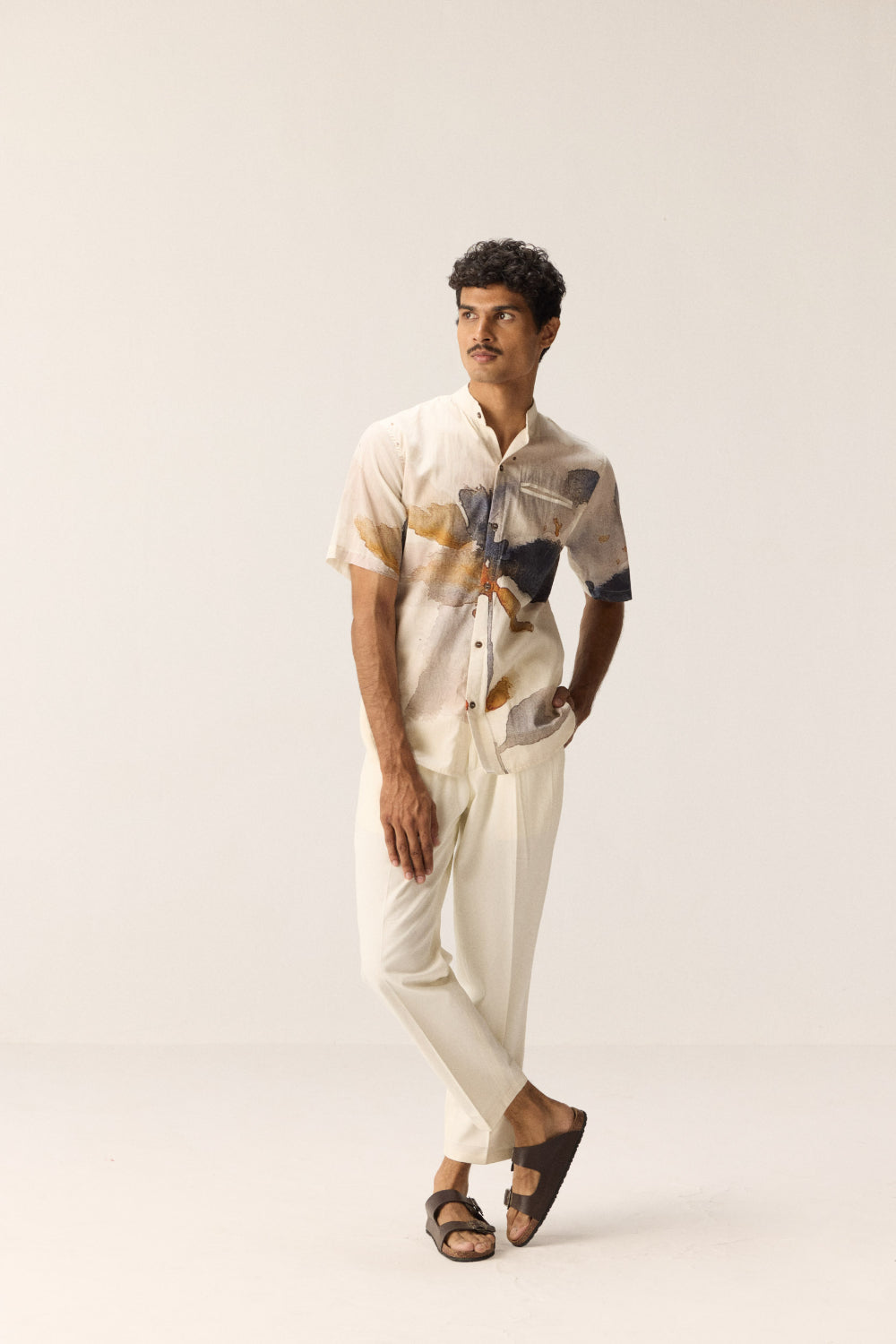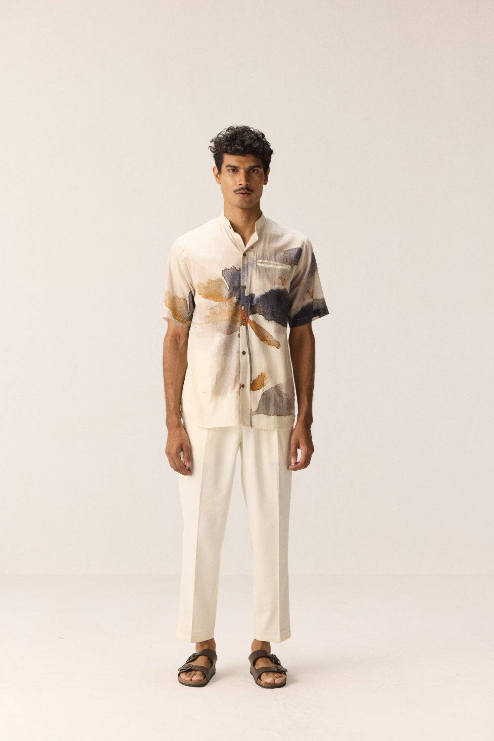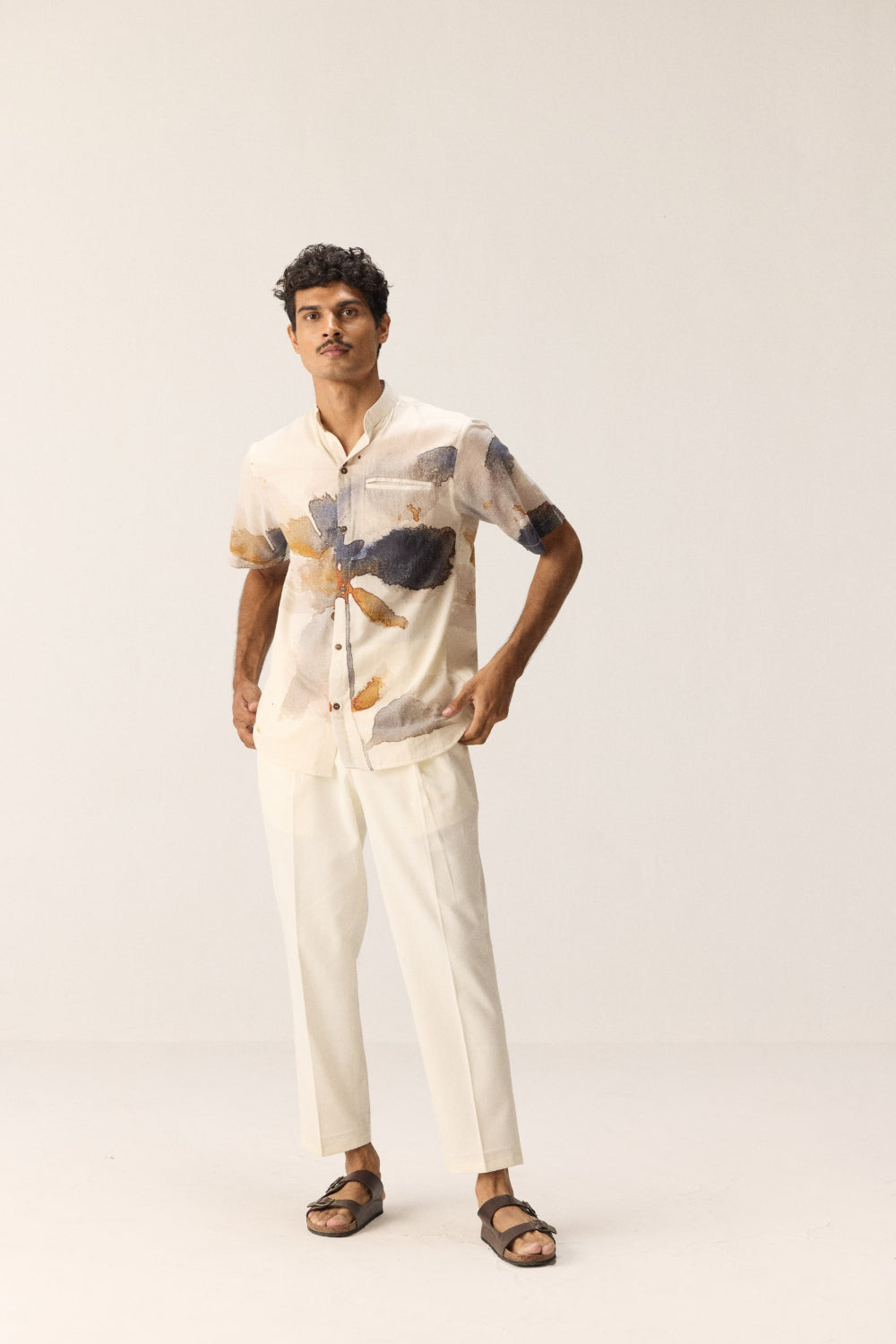 This men's shirt is crafted from soft, breathable cotton mul fabric, featuring a white base adorned with burnt orange and blue floral prints. It includes a front pocket and a Chinese collar, offering a relaxed fit suitable for various occasions.