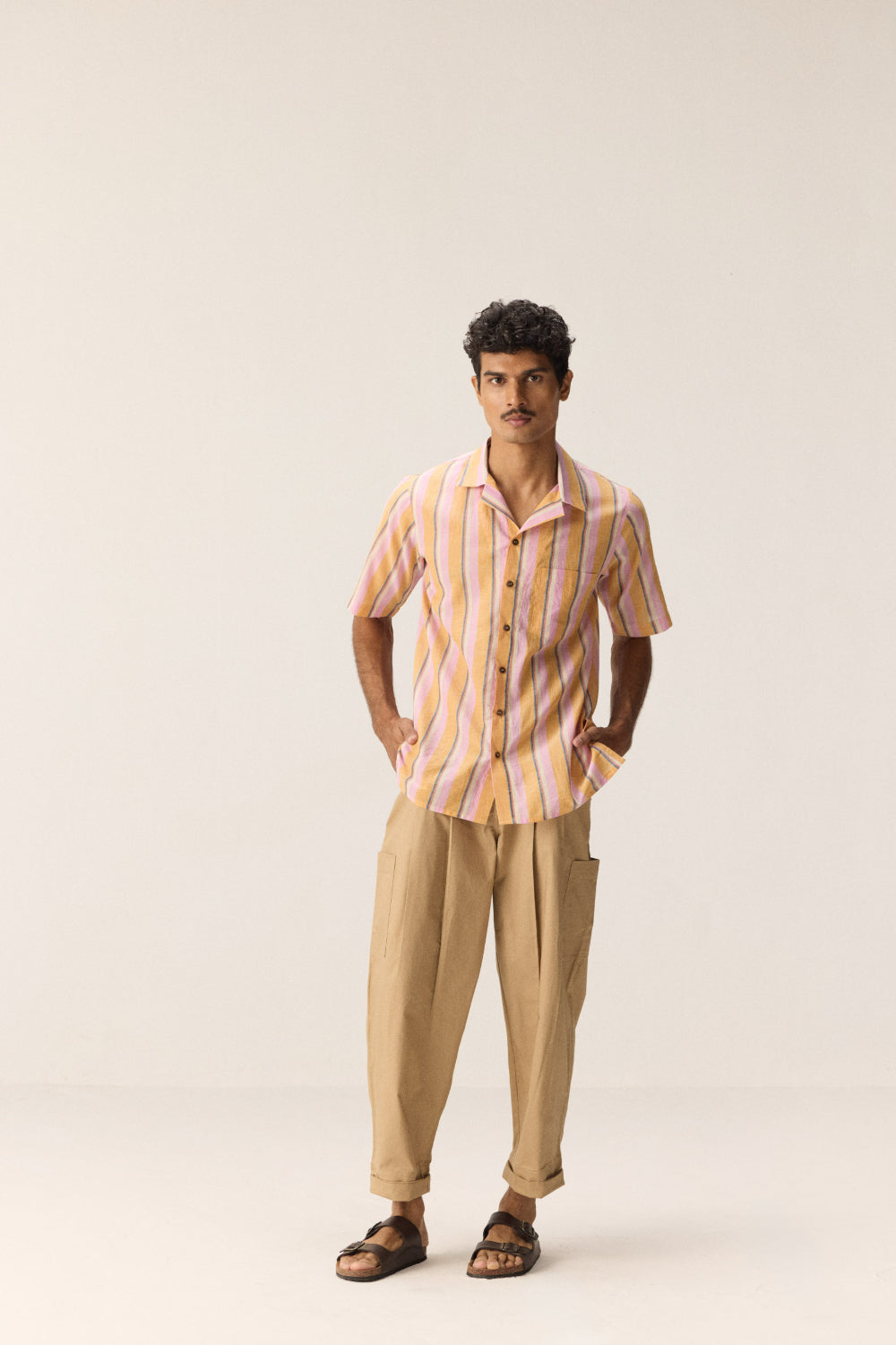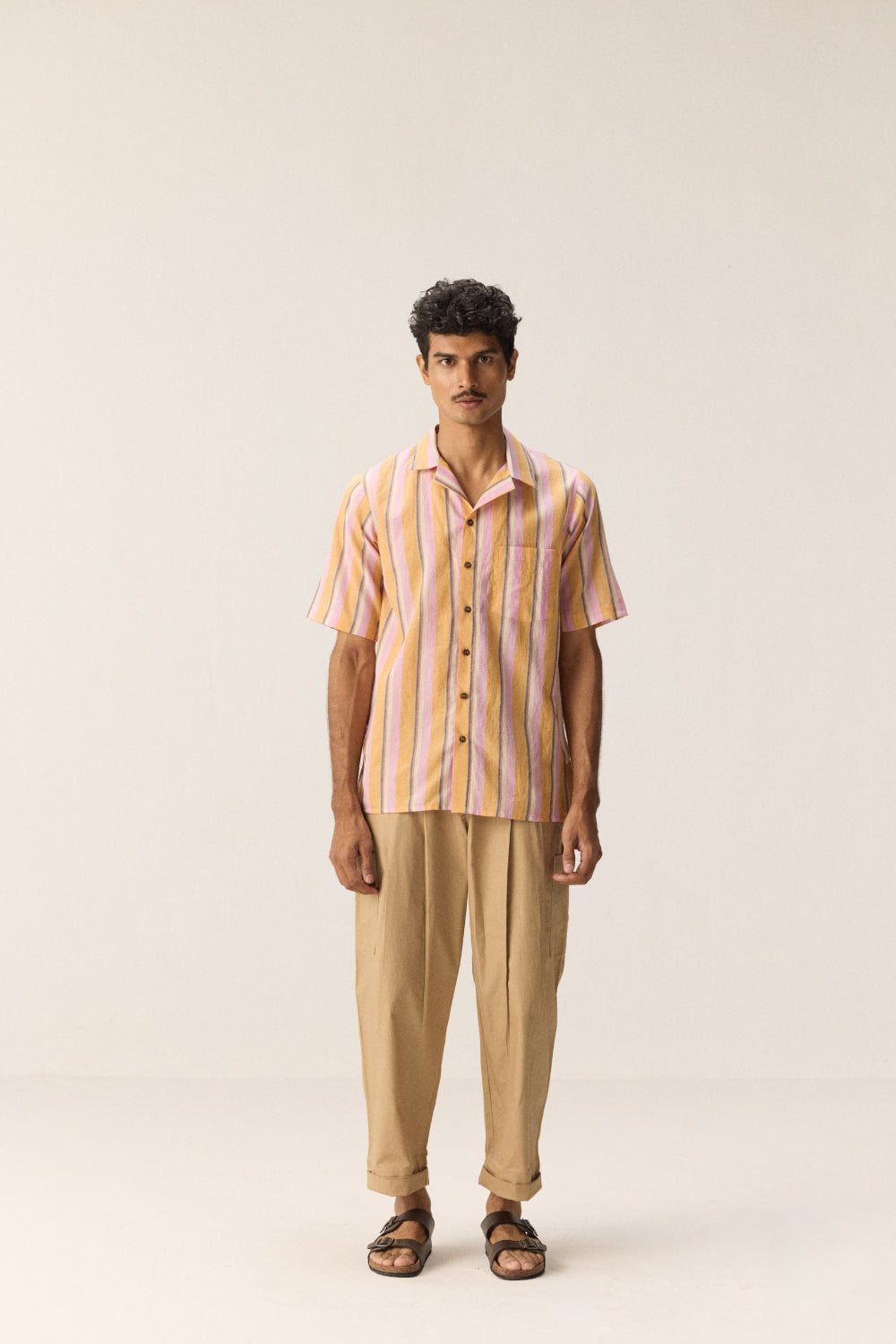 A breezy Fine khadi shirt in refreshing stripes of pink, orange, and white. Designed with classic Cuban collars and a relaxed fit, it’s lightweight, playful, and made for sun-soaked day outs.