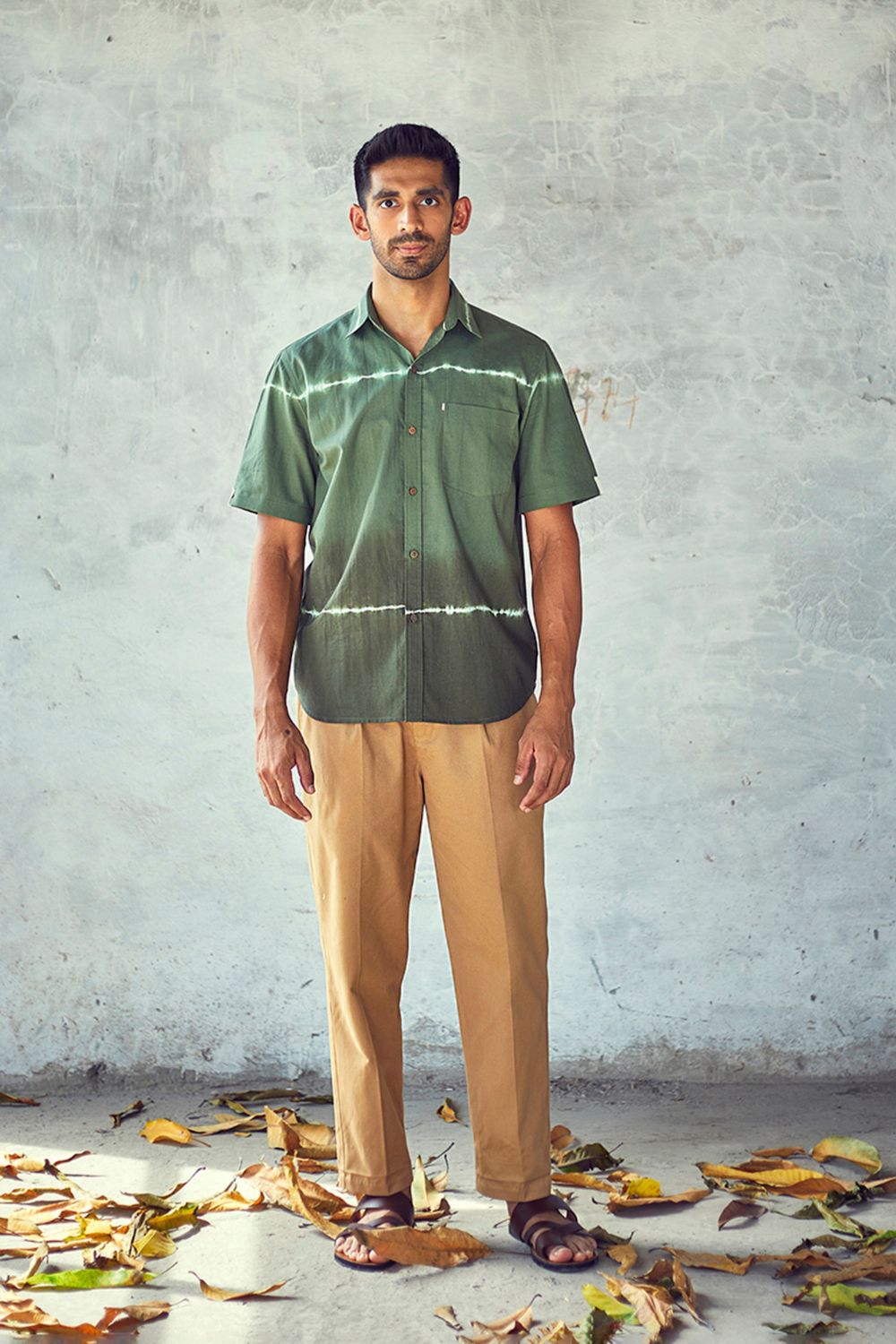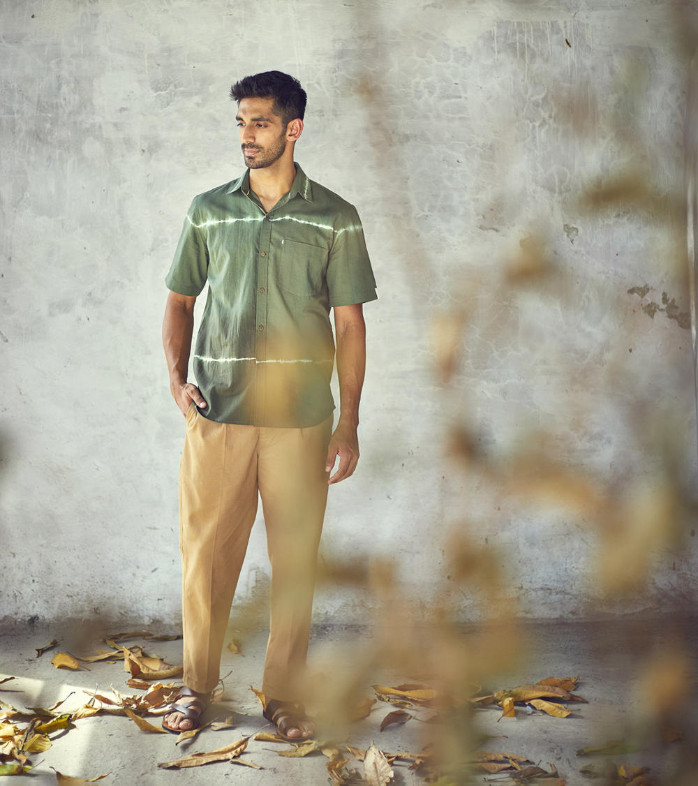 A shibori dyed forest green shirt in khadi cotton with spread collar and an up front patch pocket. A perfect match for any occasion.