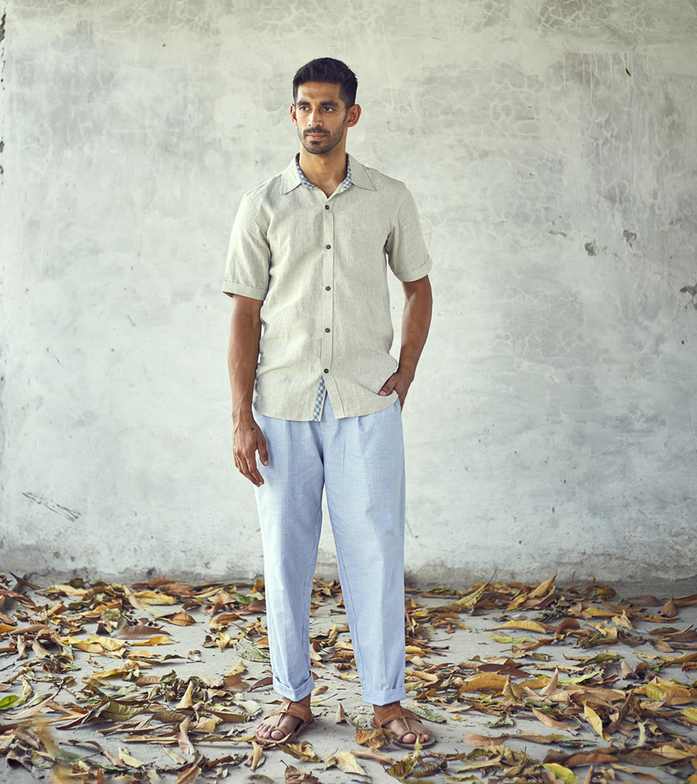 A half-sleeved linen shirt in a regular fit with straight collars. It comes with a peak-a-boo blue and white check detailing.