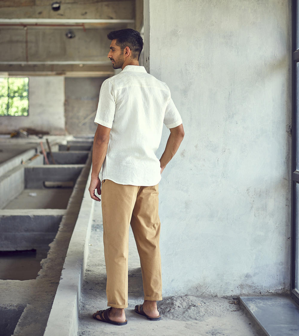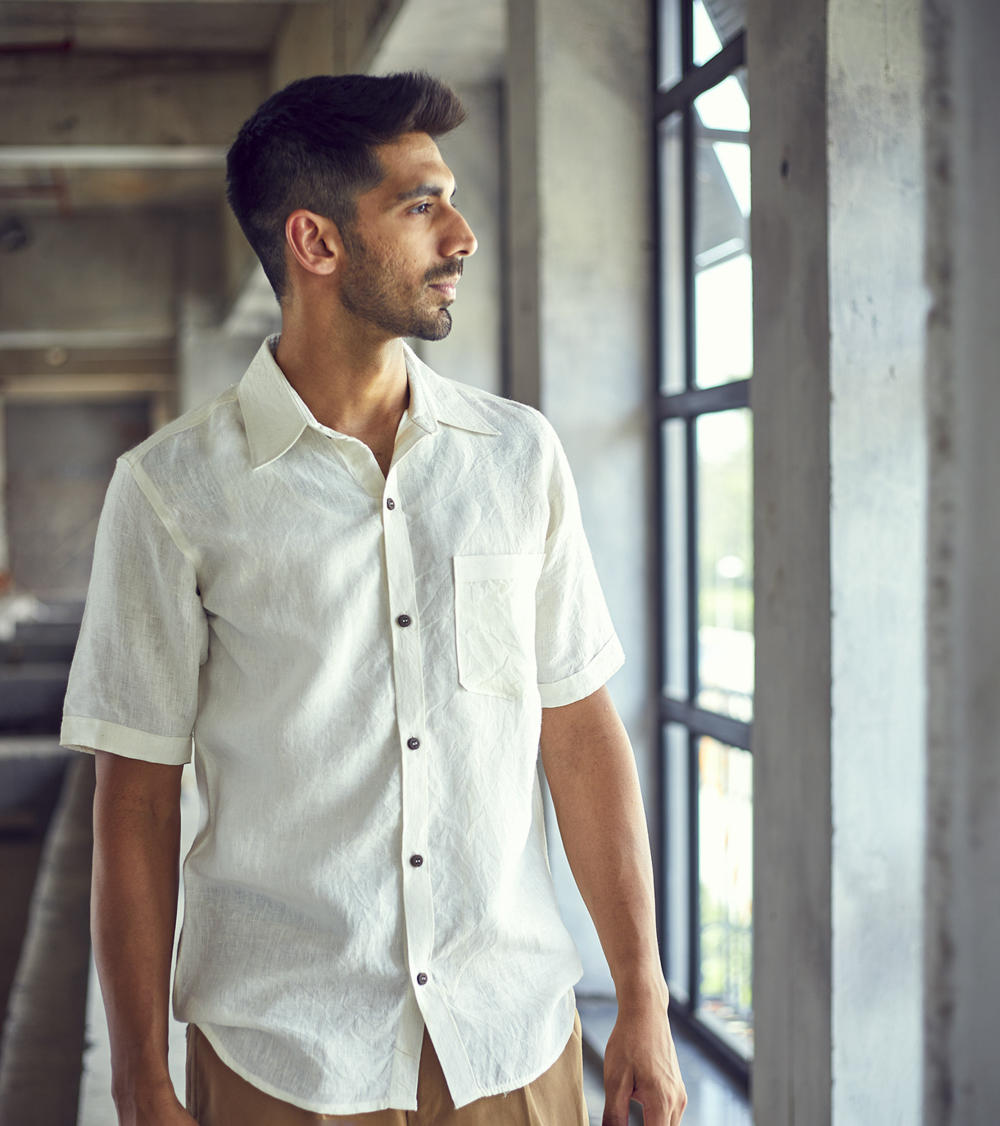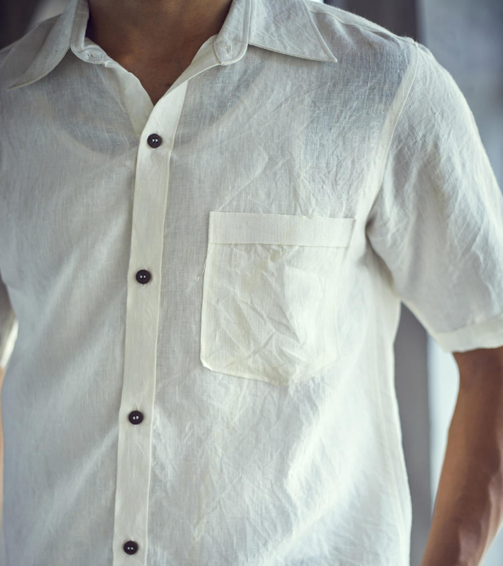 A white belgian linen half-sleeve regular fit shirt with spread collar and an up front patch pocket.