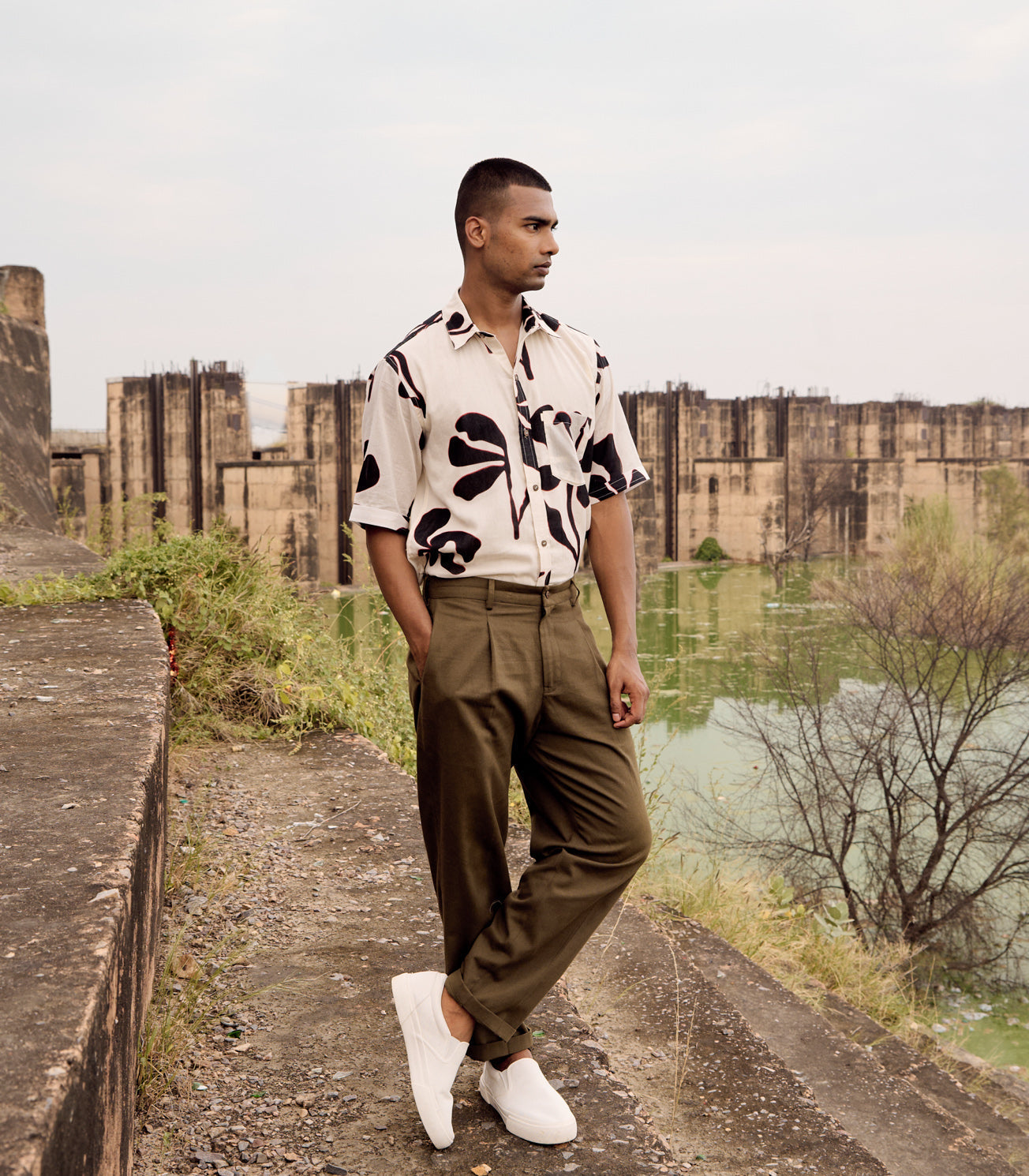 An off white lino print mul shirt with half sleeves, spread collar and a patch pocket up front.